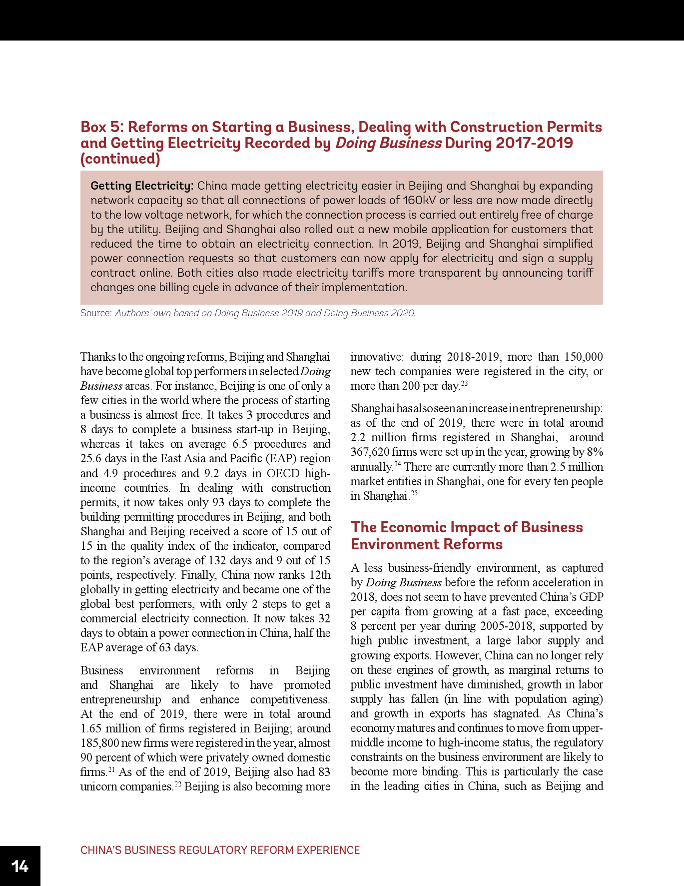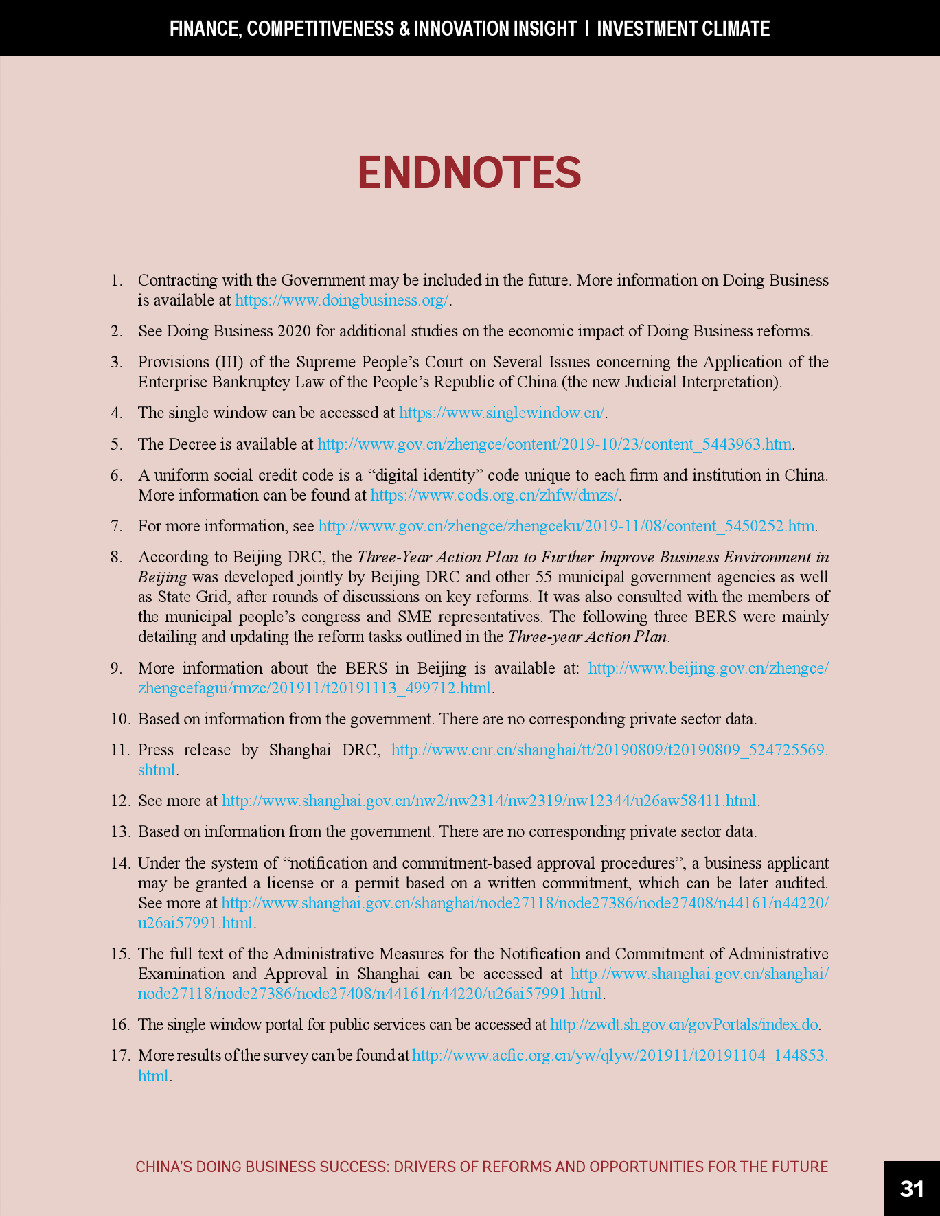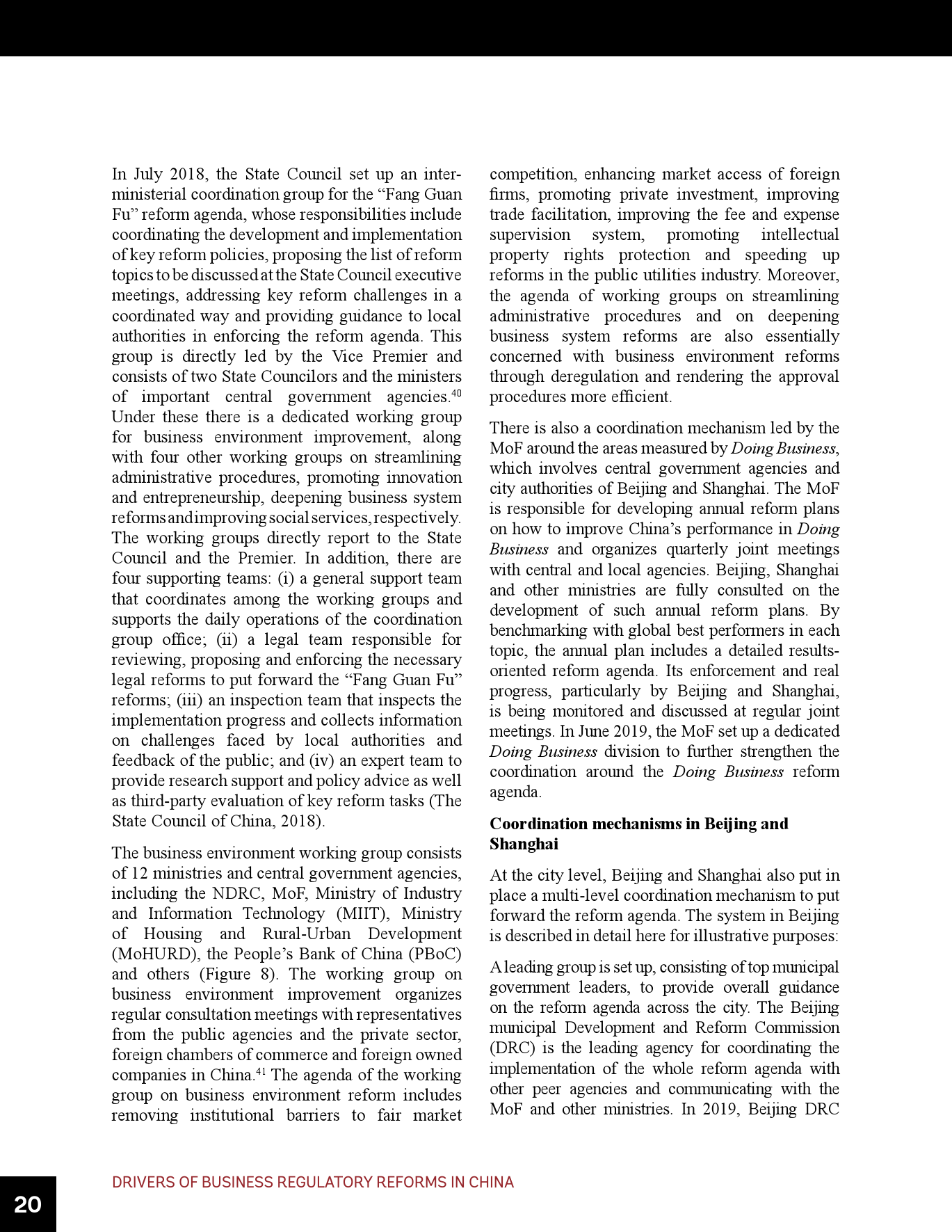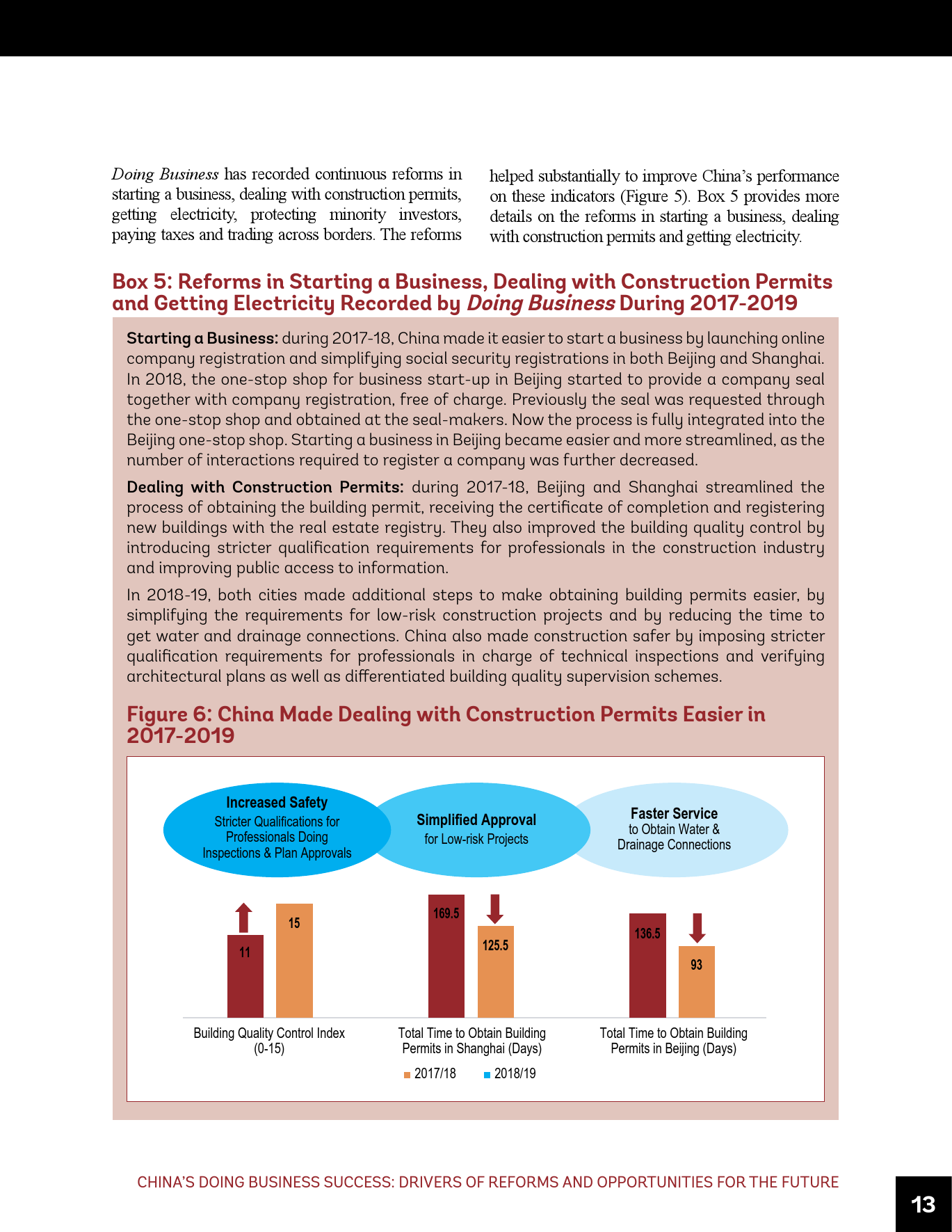 - 在《营商环境报告》的框架内,中国须在多个领域持续推进改革。这些领域包括简化建筑许可办理和确保建筑法规和监理质量、进一步改善跨境贸易、制定和建设为获得信贷提供便利的法规和基础设施、为办理破产(目前仍落后于其它先进经济体)建立世界一流的框架和制度等。