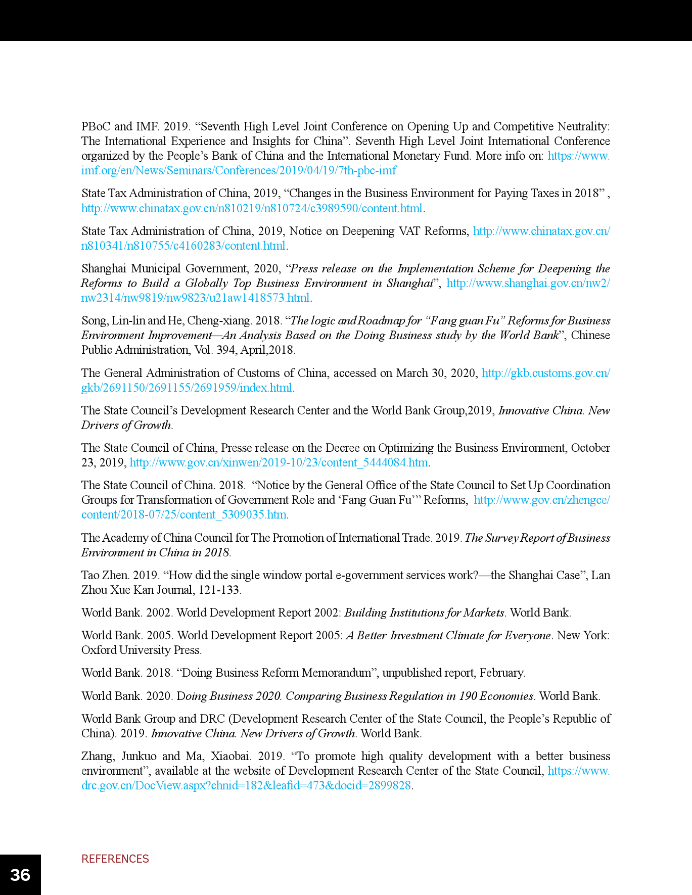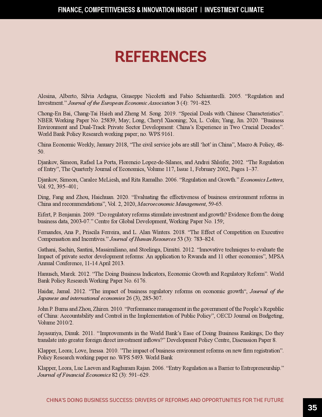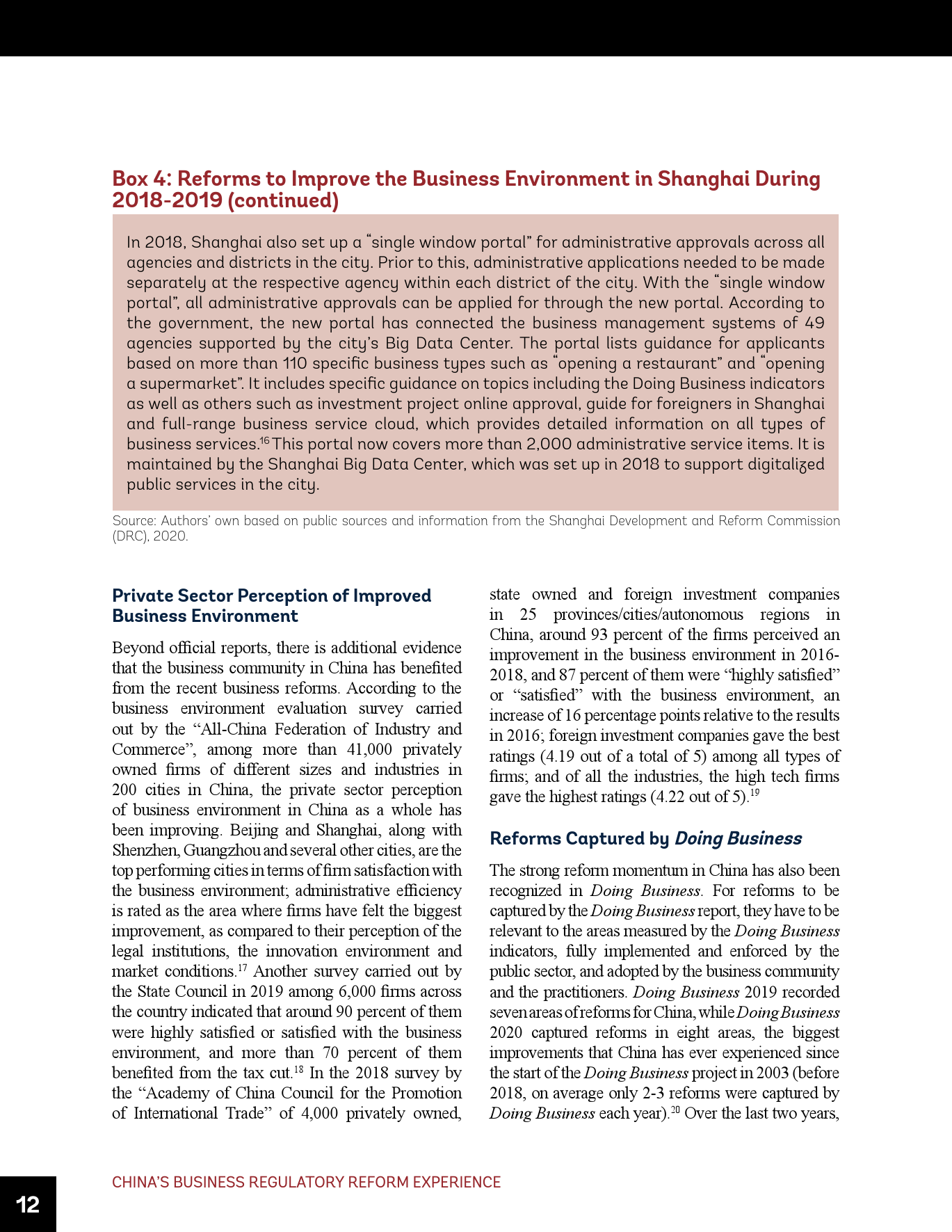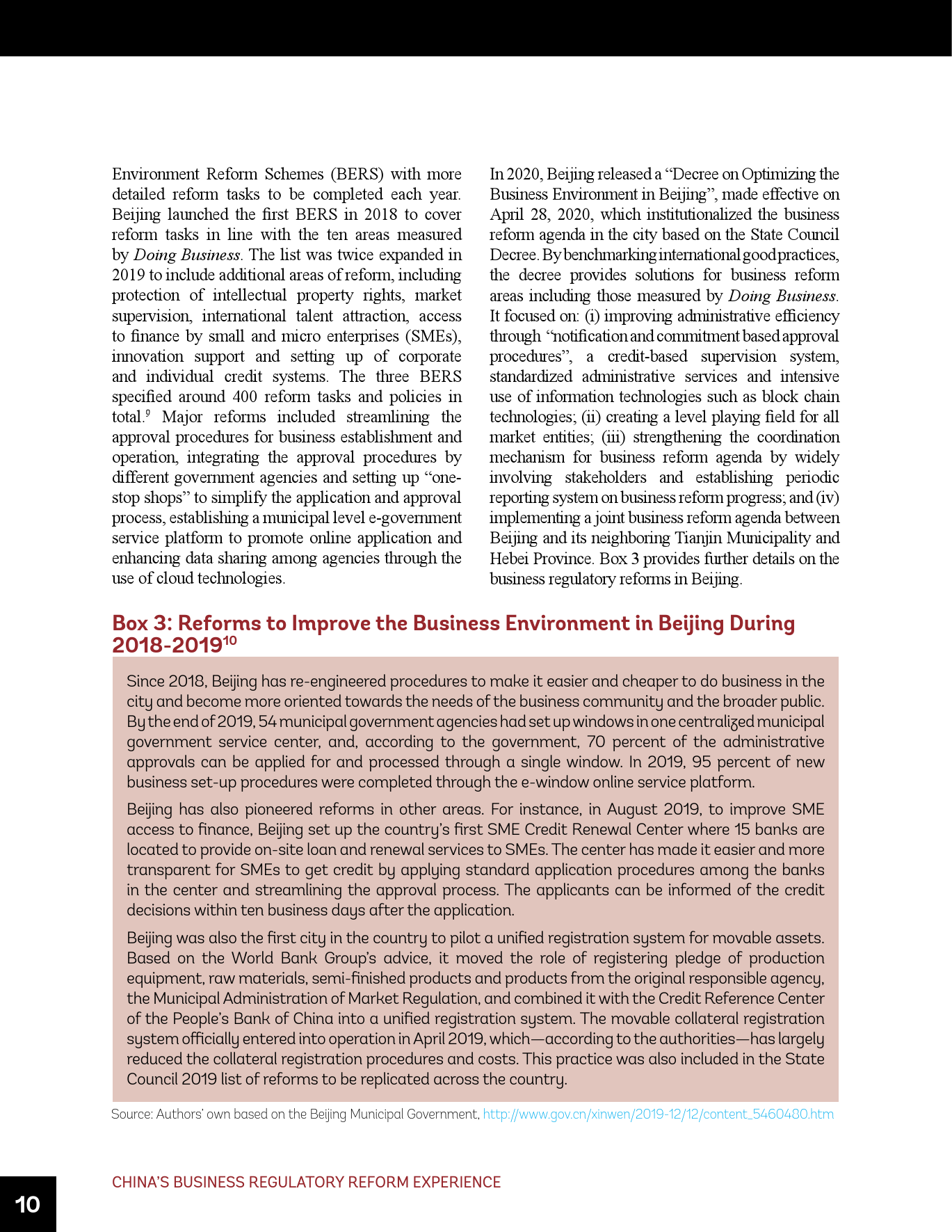 - 在《营商环境报告》的框架内,中国须在多个领域持续推进改革。这些领域包括简化建筑许可办理和确保建筑法规和监理质量、进一步改善跨境贸易、制定和建设为获得信贷提供便利的法规和基础设施、为办理破产(目前仍落后于其它先进经济体)建立世界一流的框架和制度等。