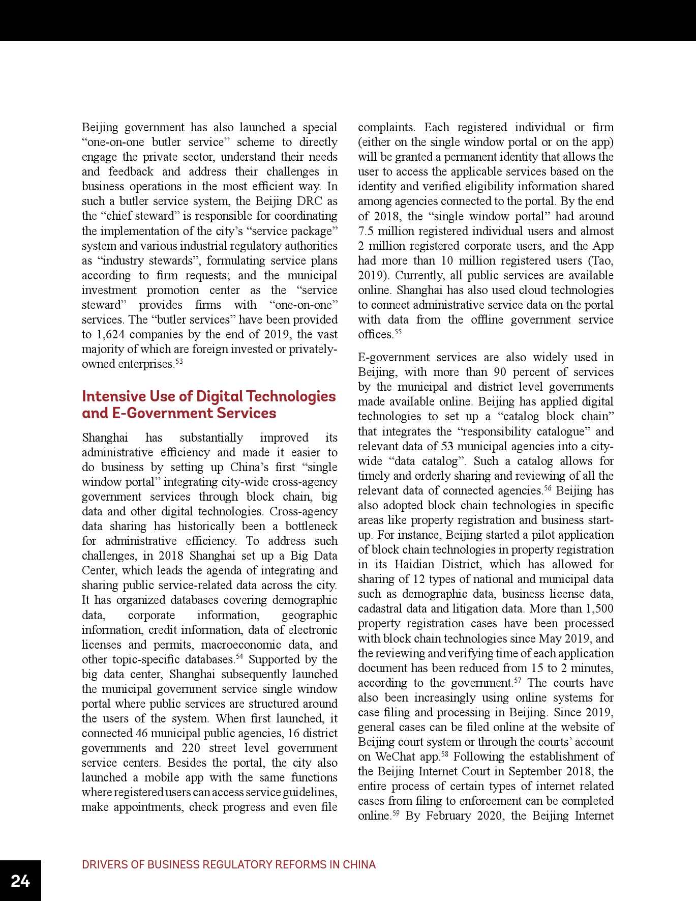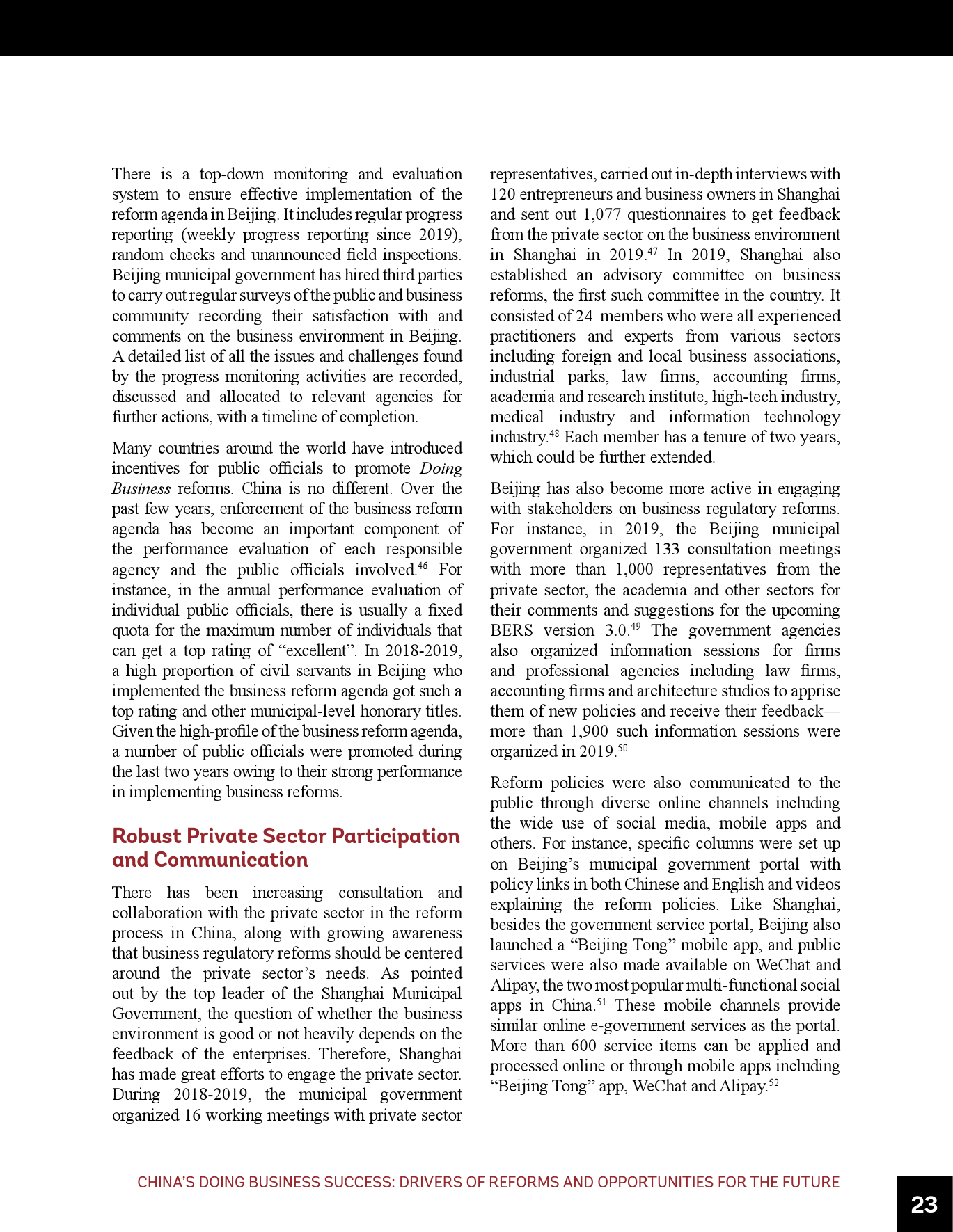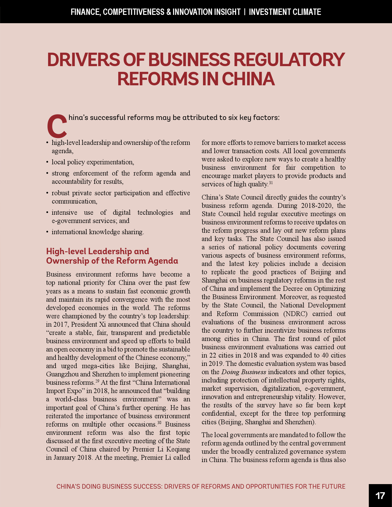 - 中国的成功有六个主要驱动因素,即,高层领导对改革议程的重视、地方的政策试验、国内外知识交流、对改革议程的强大执行力及结果问责、私营部门的积极参与和电子政务服务的广泛运用。