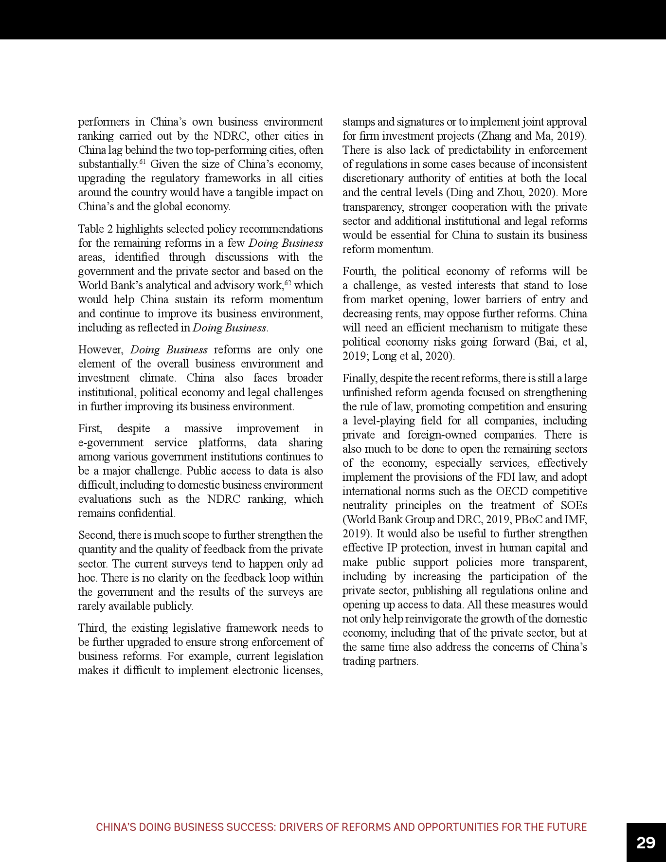 - 政府还须继续解决营商环境中的其他挑战,包括加强法制、促进竞争、为所有企业营造公平竞争环境、开放尚未开放的其他经济部门、采取国际规范对待国有企业等。