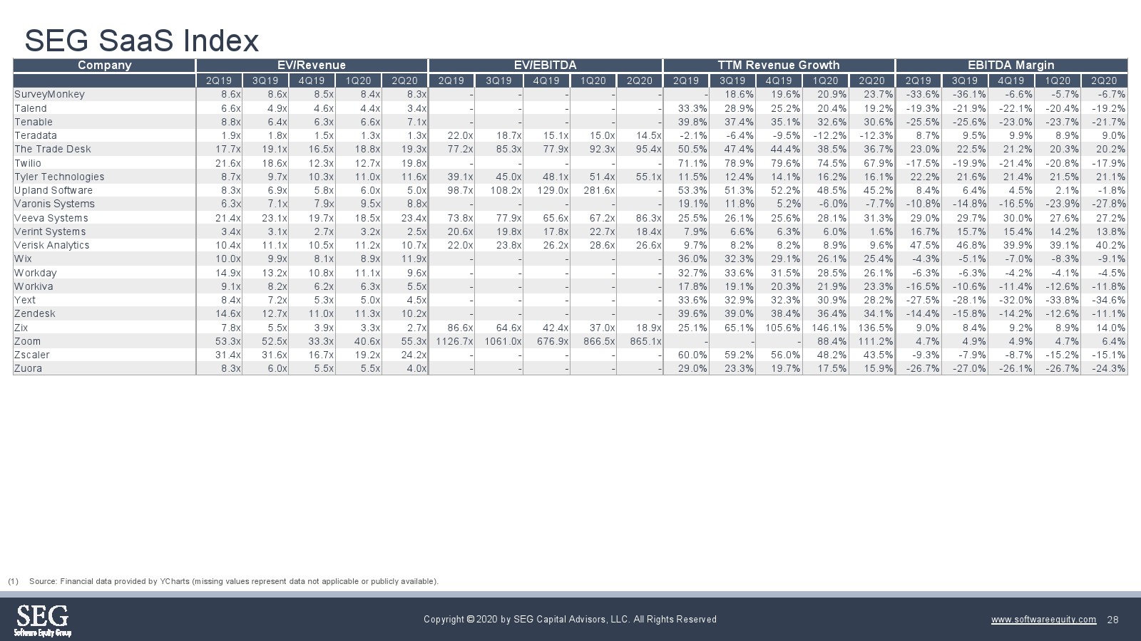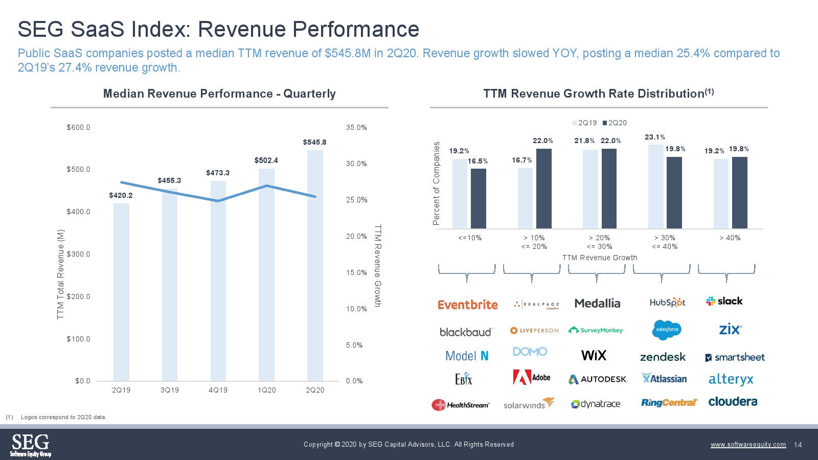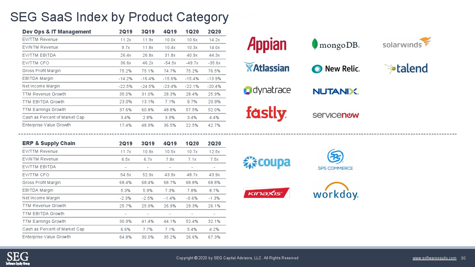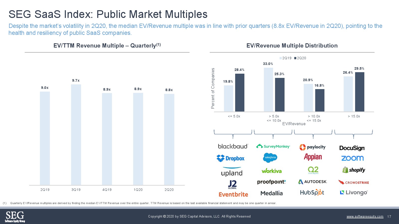 - 按季度计算,收入倍数中位数与前几个季度一致,第二季度公布了8.8倍的EV/收入。这表明在新冠肺炎大流行期间,公共SaaS公司的健康和弹性。