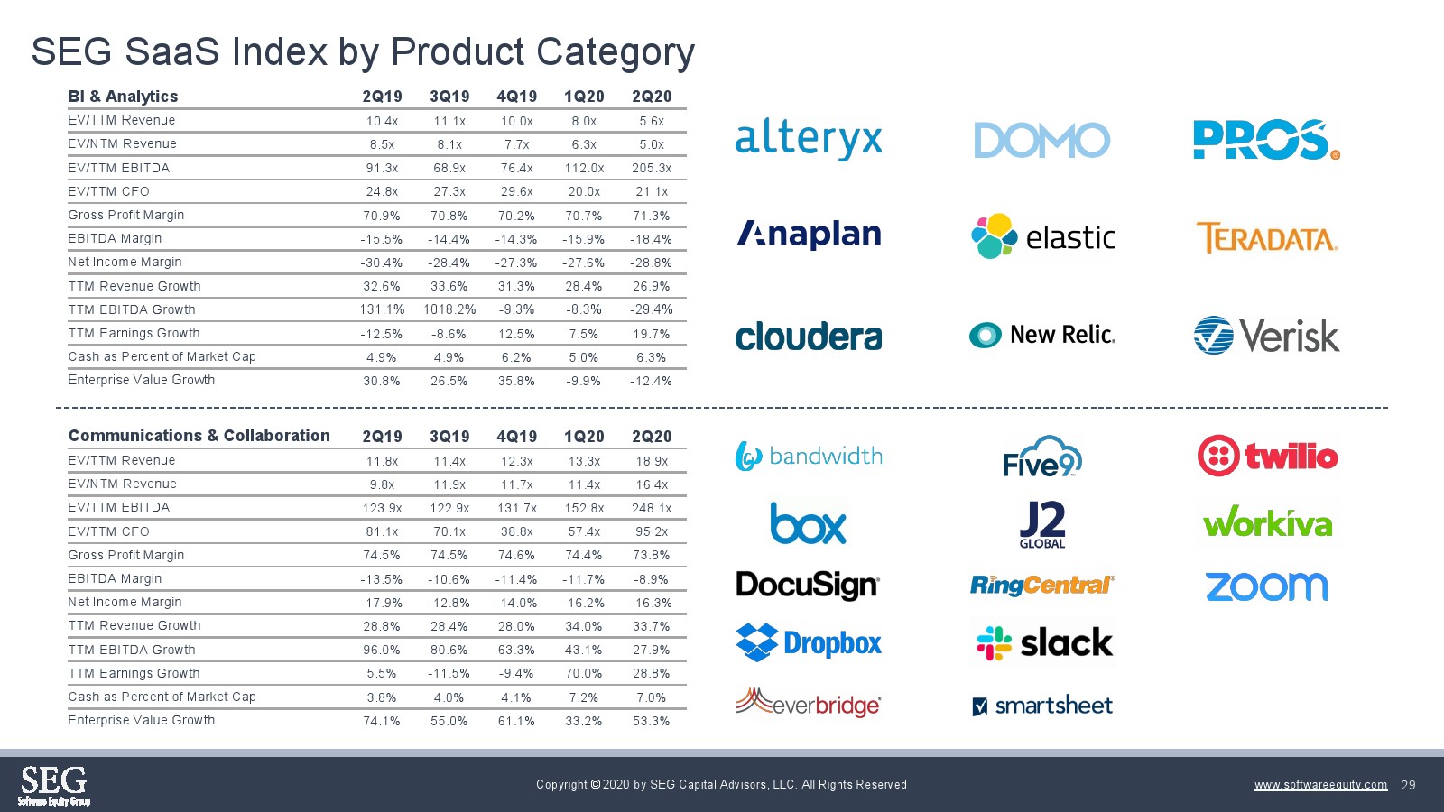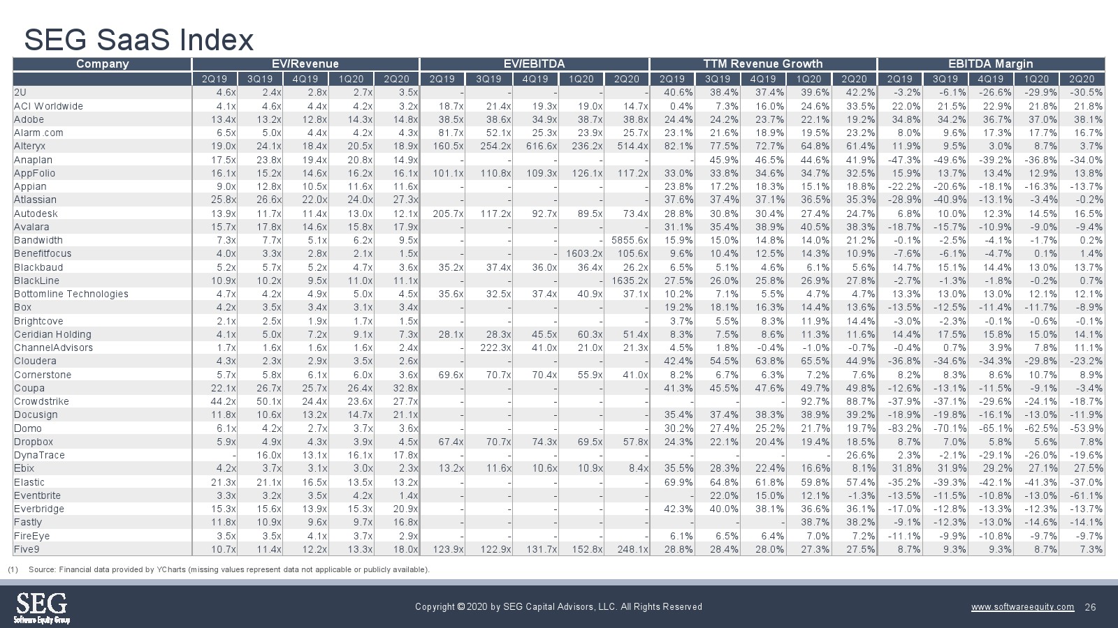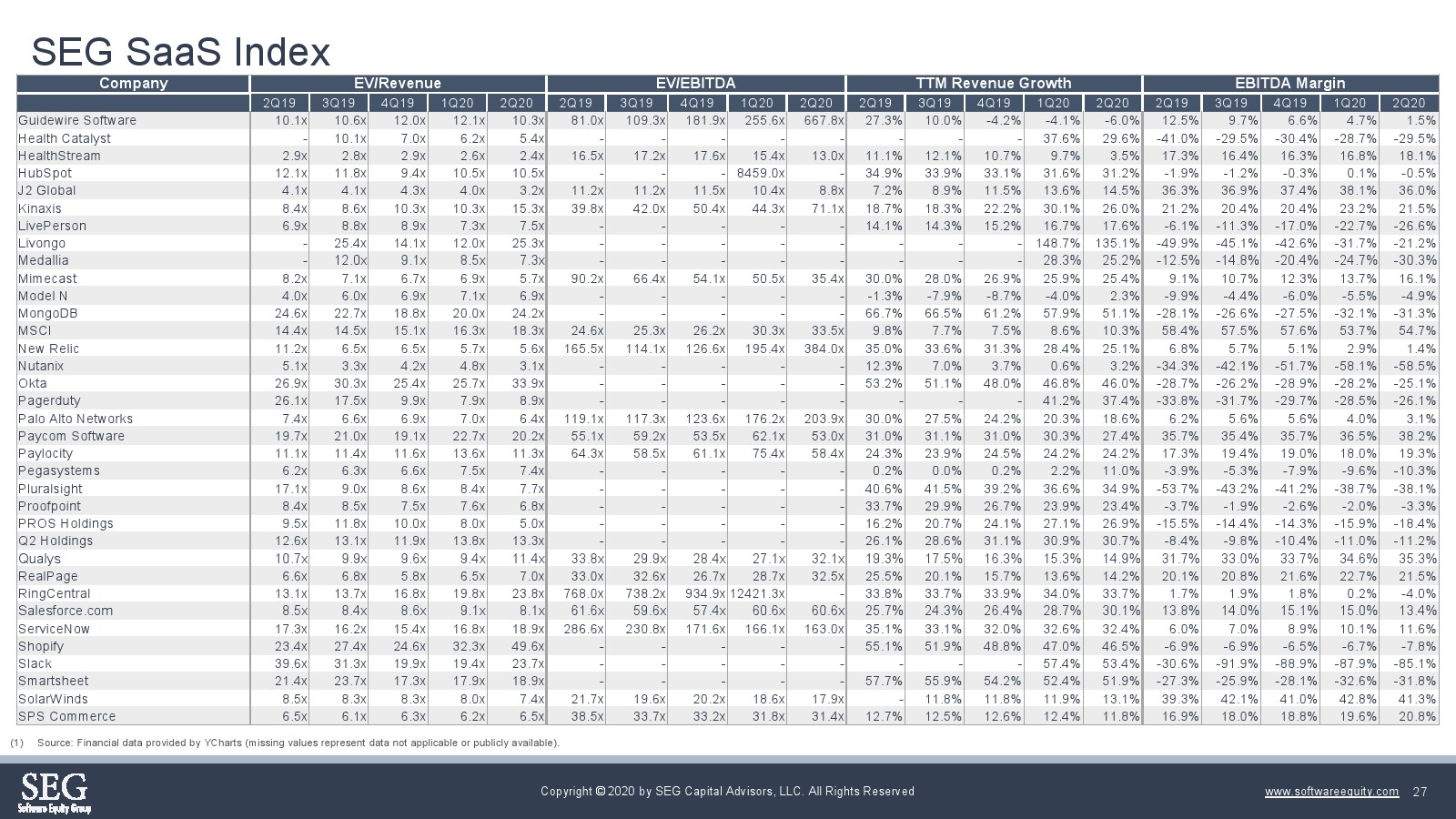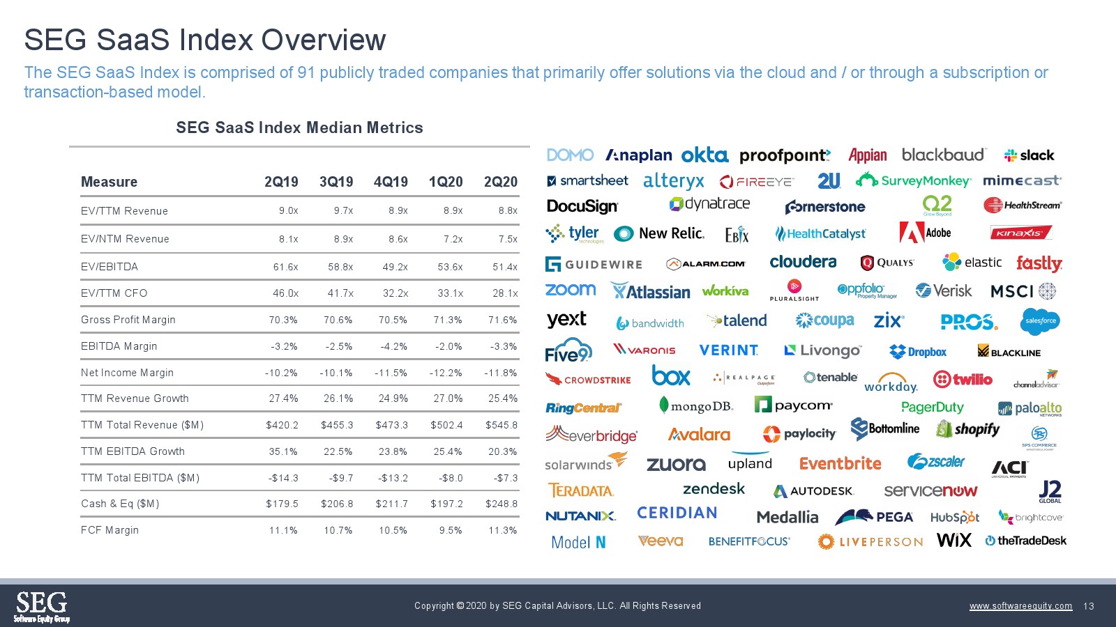 - 按季度计算,收入倍数中位数与前几个季度一致,第二季度公布了8.8倍的EV/收入。这表明在新冠肺炎大流行期间,公共SaaS公司的健康和弹性。