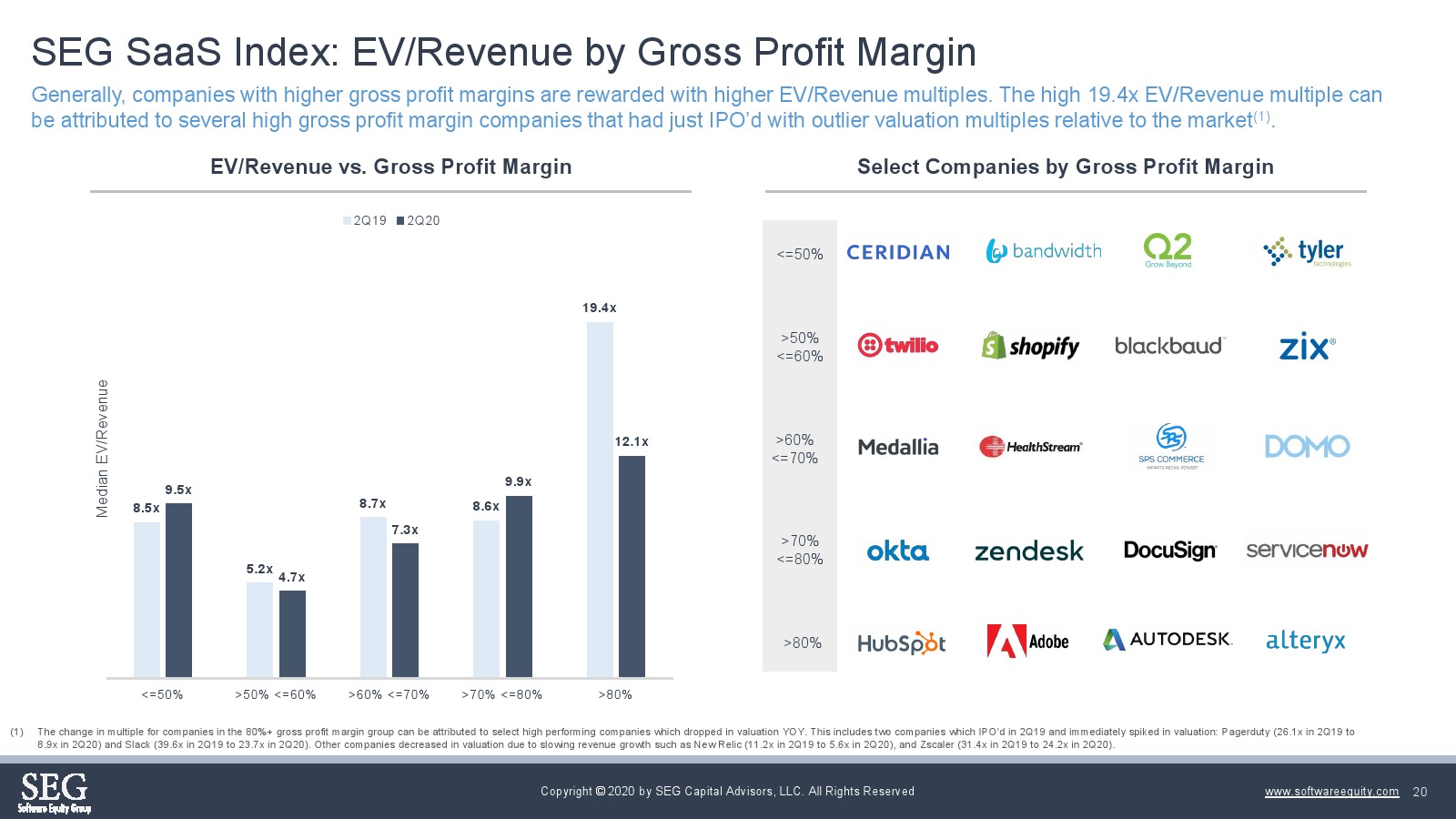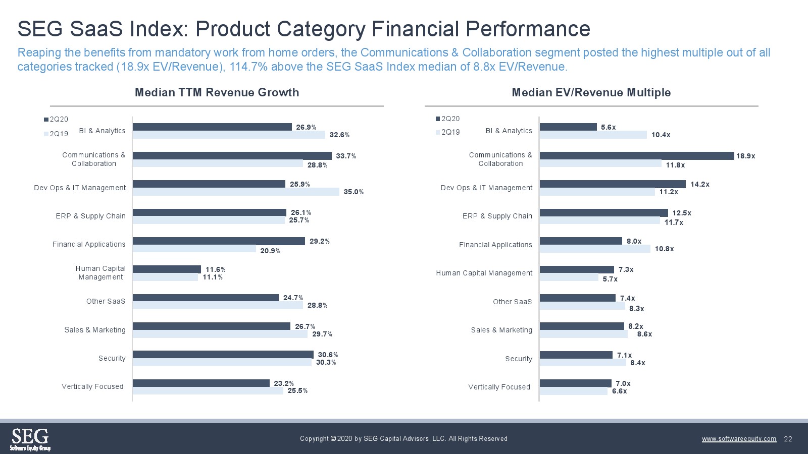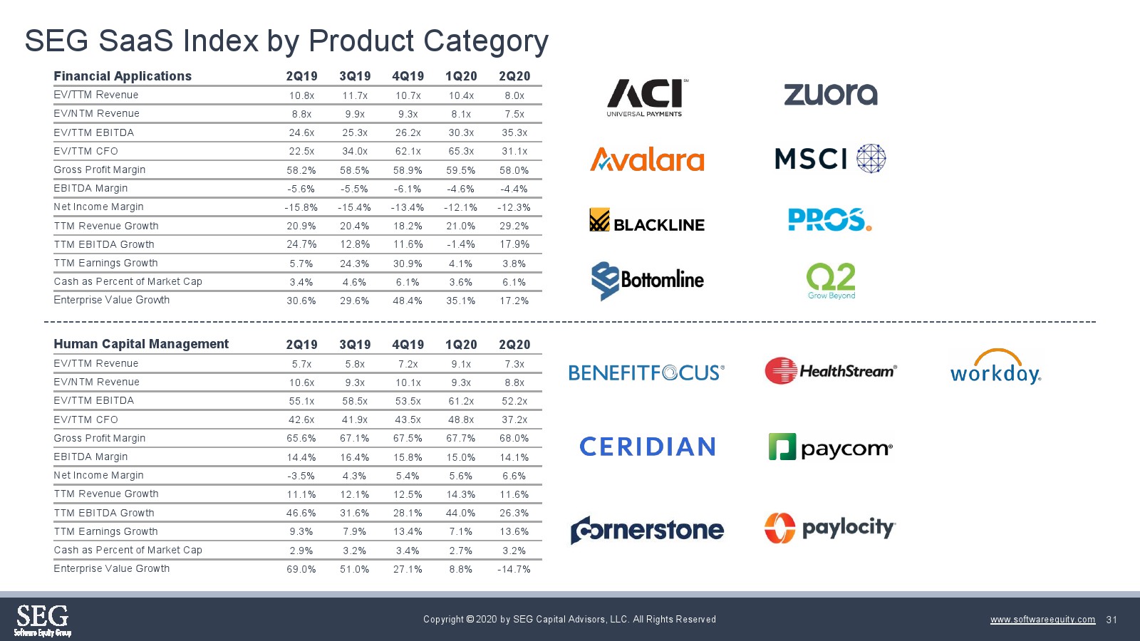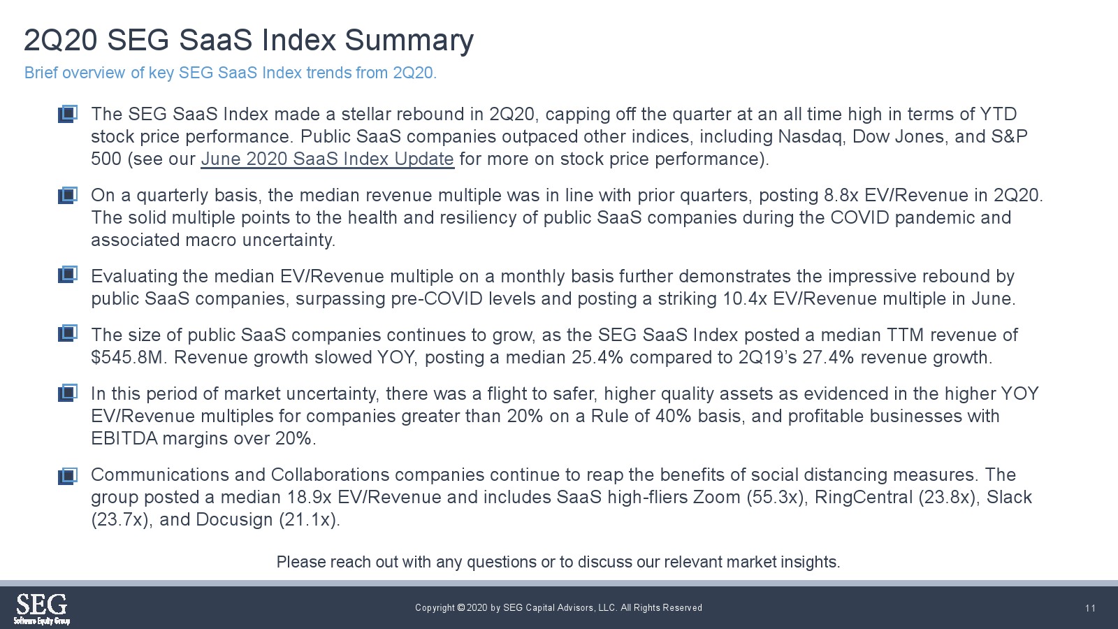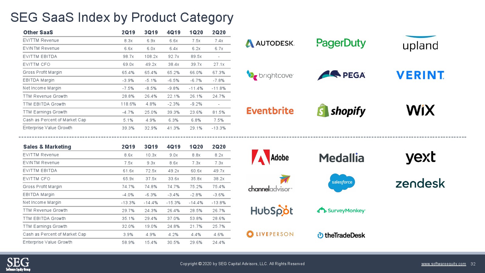 - 按季度计算,收入倍数中位数与前几个季度一致,第二季度公布了8.8倍的EV/收入。这表明在新冠肺炎大流行期间,公共SaaS公司的健康和弹性。