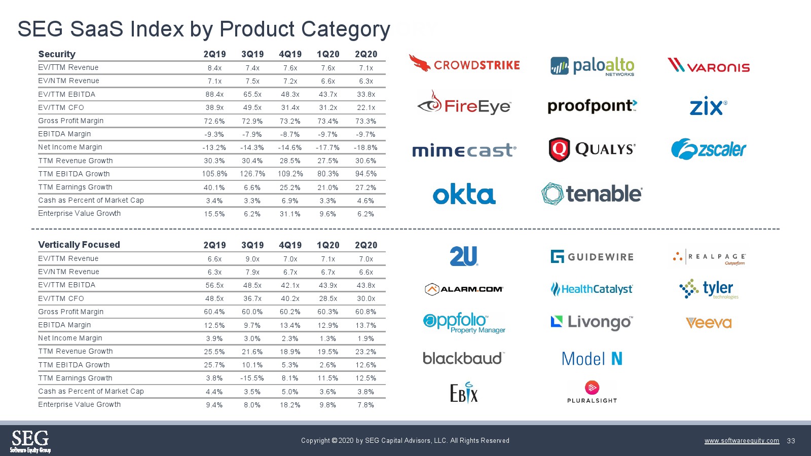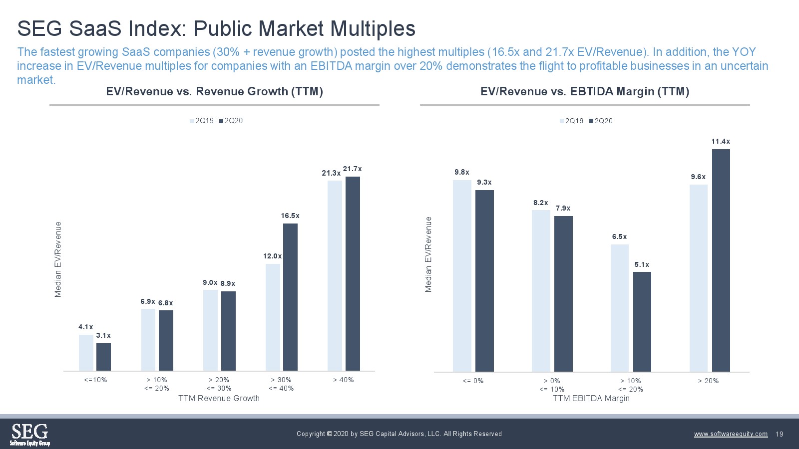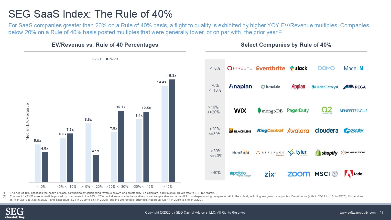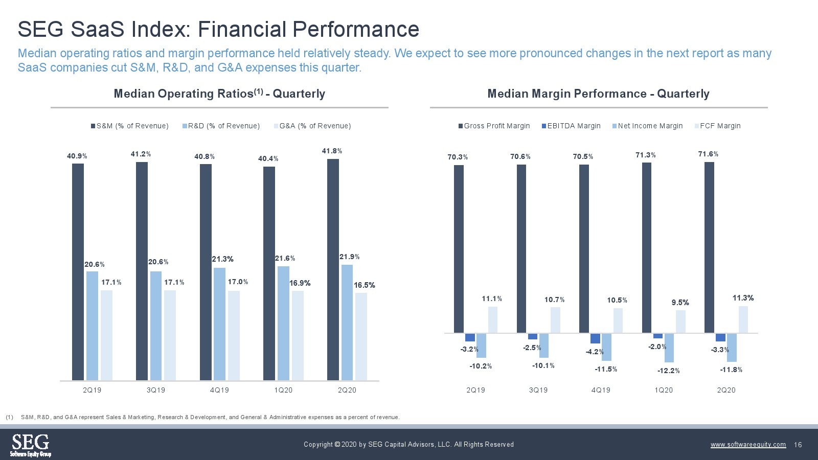 - 按季度计算,收入倍数中位数与前几个季度一致,第二季度公布了8.8倍的EV/收入。这表明在新冠肺炎大流行期间,公共SaaS公司的健康和弹性。