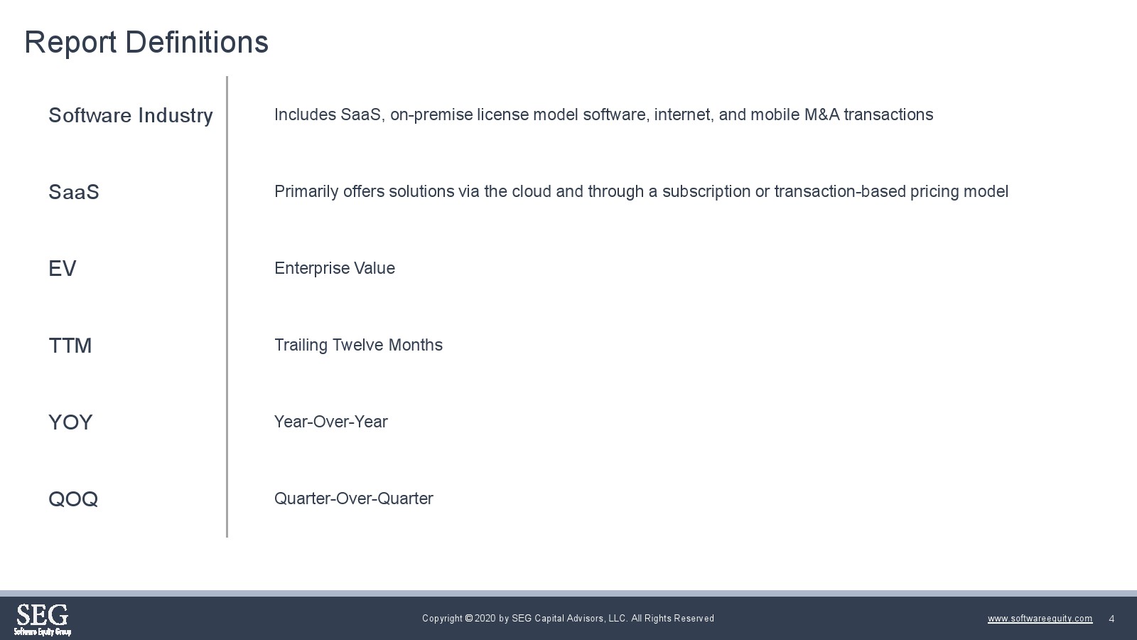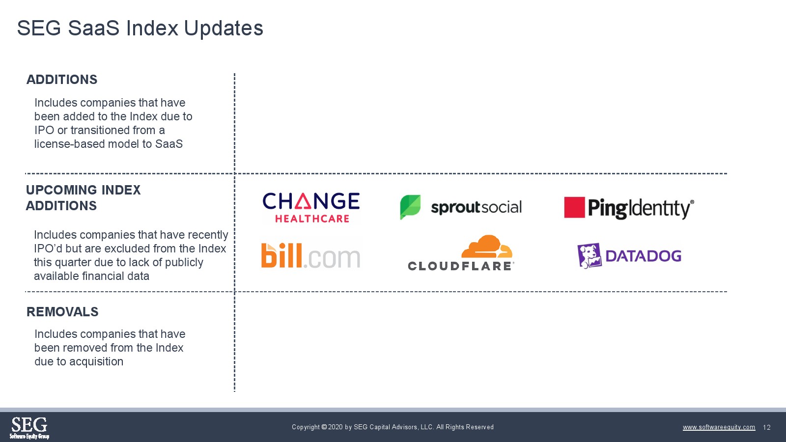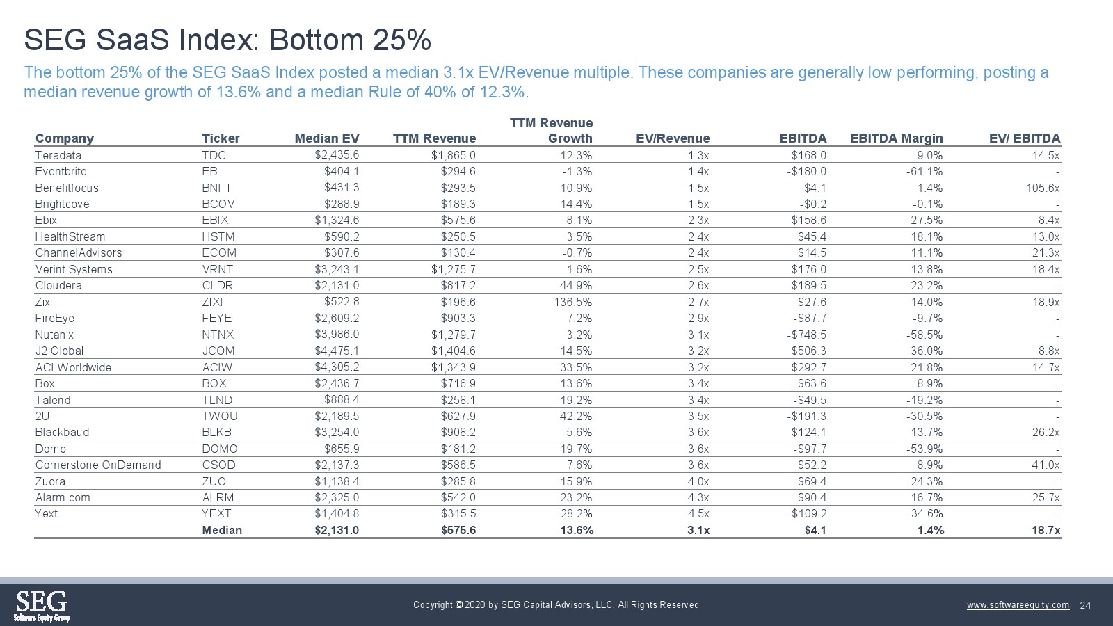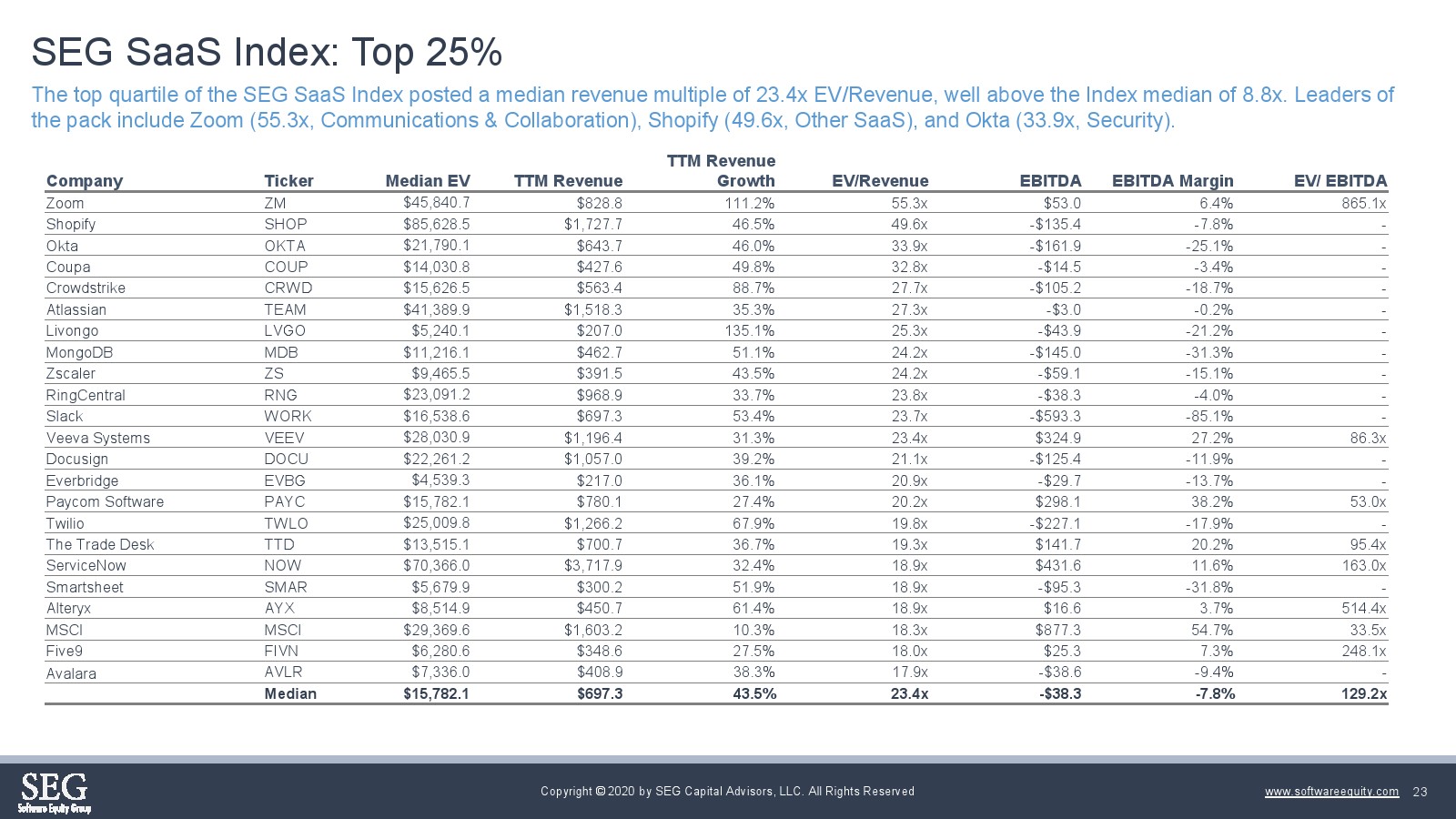 - 按季度计算,收入倍数中位数与前几个季度一致,第二季度公布了8.8倍的EV/收入。这表明在新冠肺炎大流行期间,公共SaaS公司的健康和弹性。