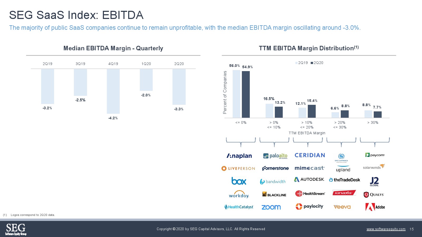 大多数上市SaaS公司继续无利可图,税息折旧及摊销前利润率(EBITDA)中位数在-3.0%左右振荡。