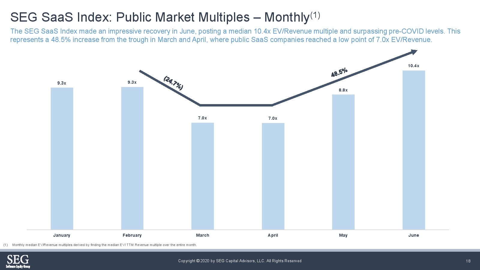 - 按月评估EV/收入中位数倍数进一步表明,上市SaaS公司的反弹令人印象深刻,超过了新冠肺炎之前的水平,6月份EV/收入倍数达到惊人的10.4倍。