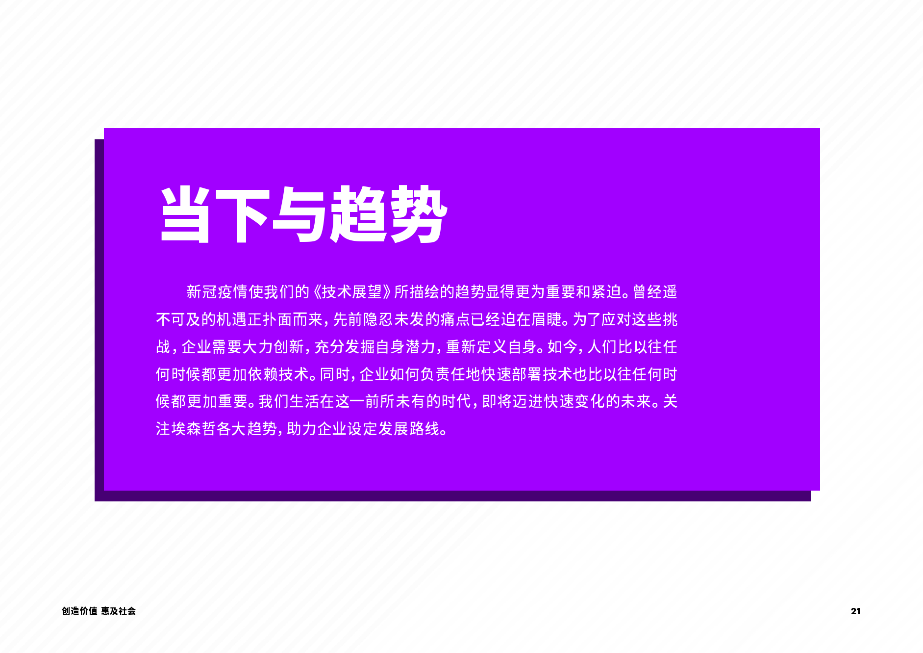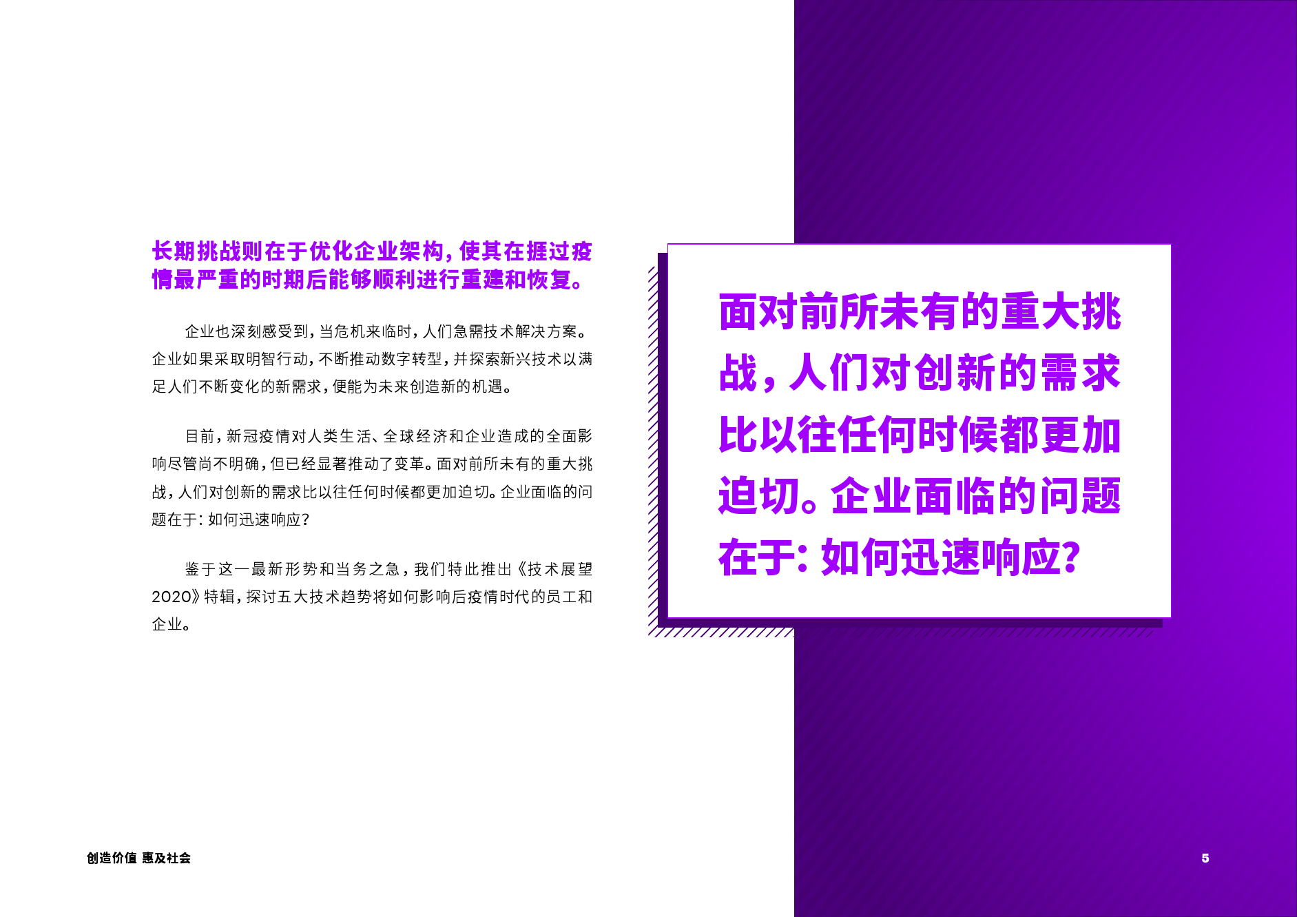 埃森哲最新发布《技术展望2020》新冠疫情特辑。新冠疫情对人类生活、全球经济和企业造成的全面影响尽管尚不明确,但已经显著推动了变革。面对前所未有的重大挑战,人们对创新的需求比以往任何时候都更加迫切。企业面临的问题在于:如何迅速响应?鉴于这一最新形势和当务之急,我们特此推出《技术展望2020》特辑,探讨五大技术趋势将如何影响后疫情时代的员工和企业。