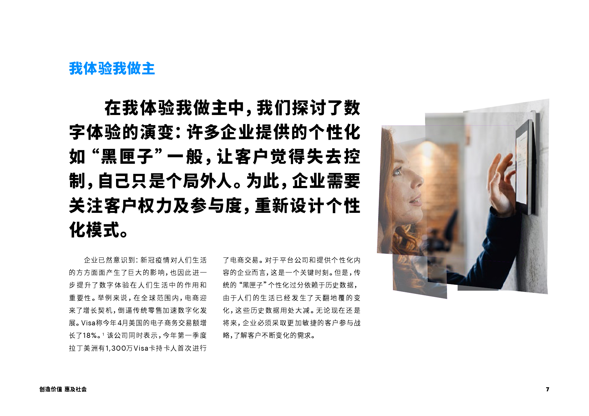 在我体验我做主中, 我们探讨了数字体验的演变:许多企业提供的个性化如“黑匣子”一般,让客户觉得失去控制,自己只是个局外人。为此,企业需要关注客户权力及参与度,重新设计个性化模式。新冠疫情改变了数字体验在人们生活中的作用和重要性。企业若要在当下和未来获得蓬勃发展则需要打造更加敏捷的战略。