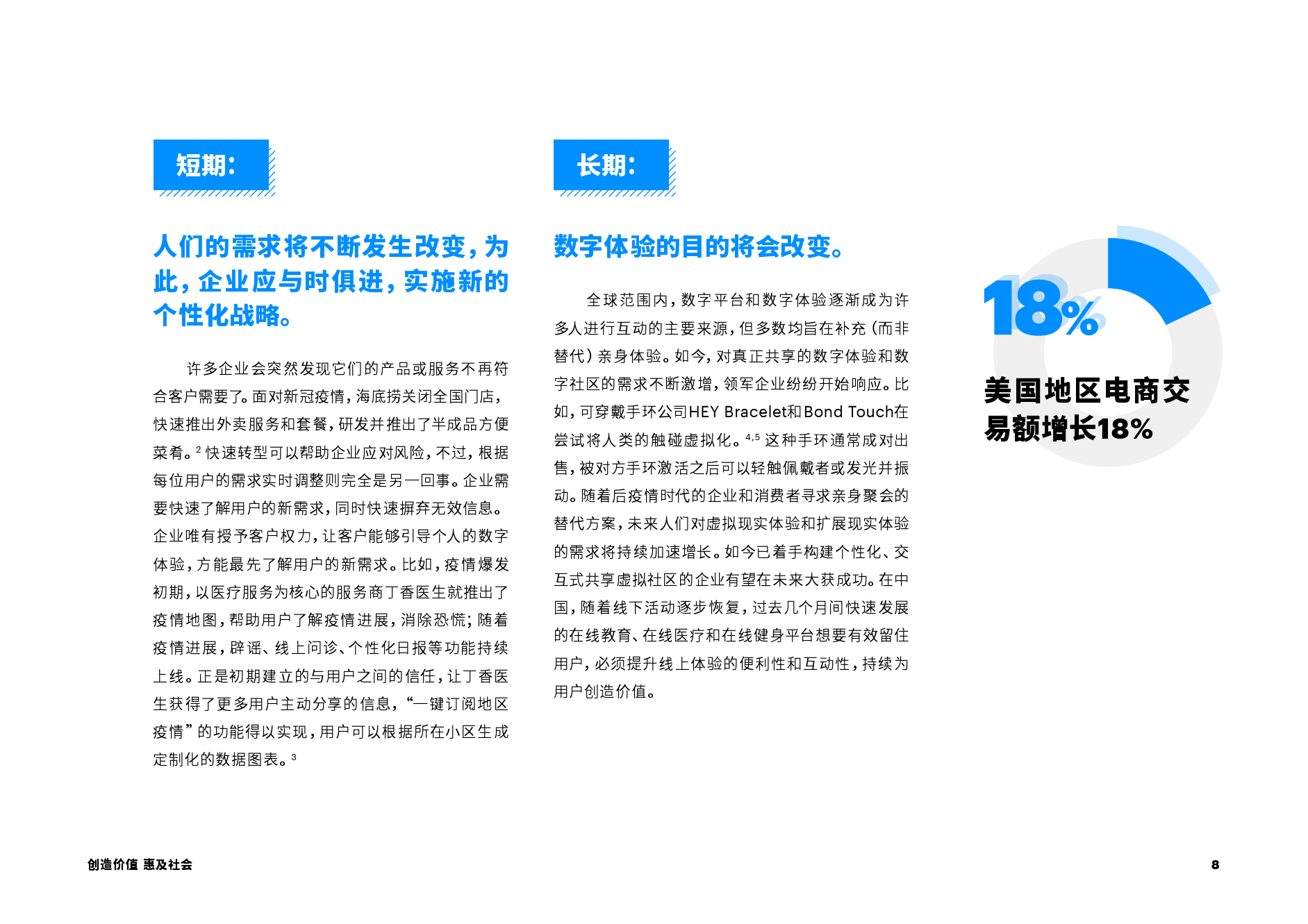 长期来看,数字体验的目的将会改变。如今,对真正共享的数字体验和数字社区的需求不断激增,领军企业纷纷开始响应。随着线下活动逐步恢复,过去几个月间快速发展的在线教育、在线医疗和在线健身平台想要有效留住用户,必须提升线上体验的便利性和互动性,持续为用户创造价值。