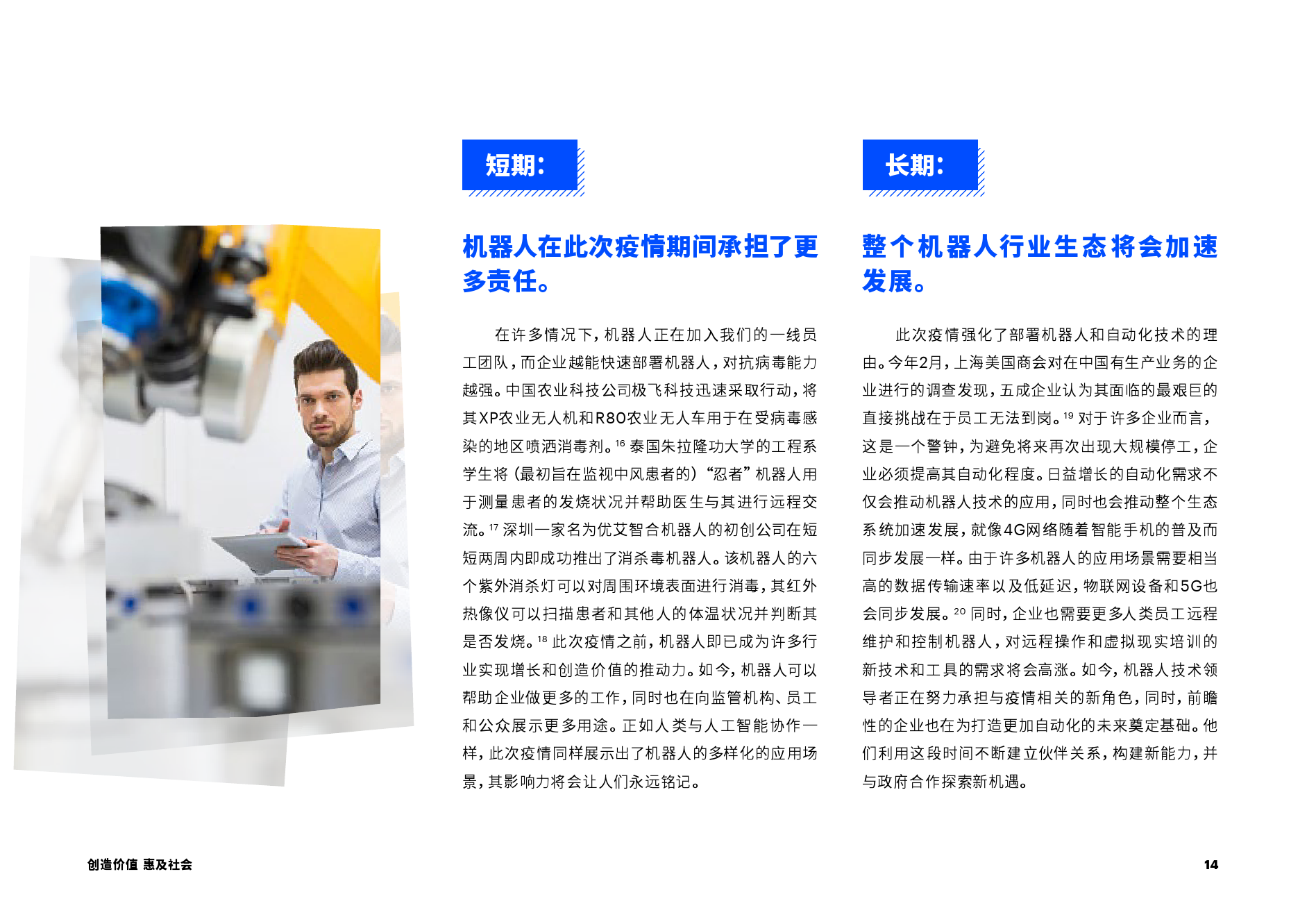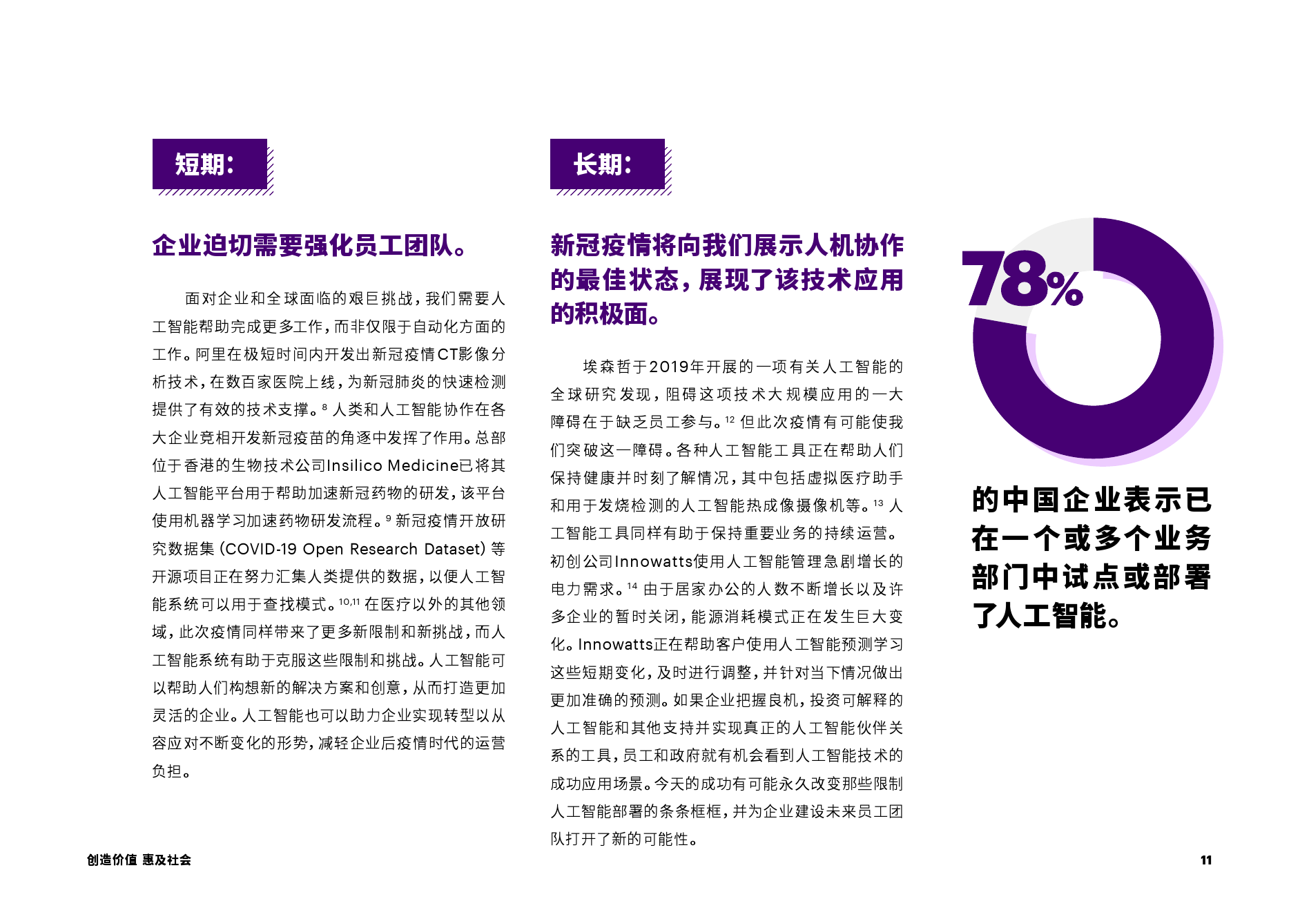 短期来看,企业迫切需要强化员工团队。人类和人工智能的协作在研发新冠病毒疫苗过程中扮演了重要的角色。在医疗以外的其他领域,此次疫情同样带来了更多新限制和新挑战,而人工智能系统有助于克服这些限制和挑战。
