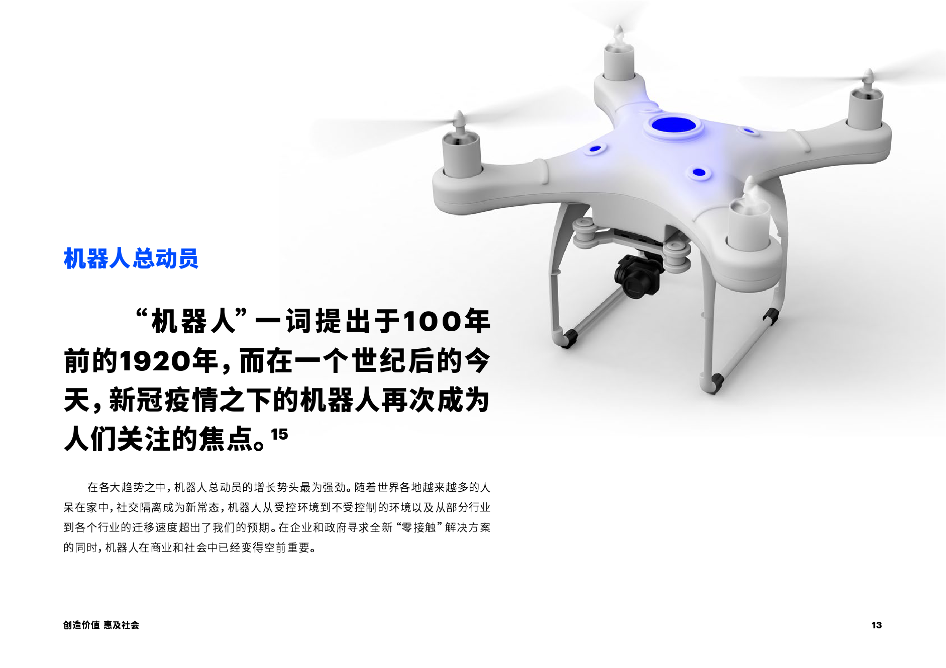 在各大趋势之中,机器人总动员的增长势头最为强劲。随着社交隔离成为新常态,机器人从受控环境到不受控制的环境以及从部分行业到各个行业的迁移速度超出了我们的预期。在企业和政府寻求全新“零接触”解决方案的同时,机器人在商业和社会中已经变得空前重要。