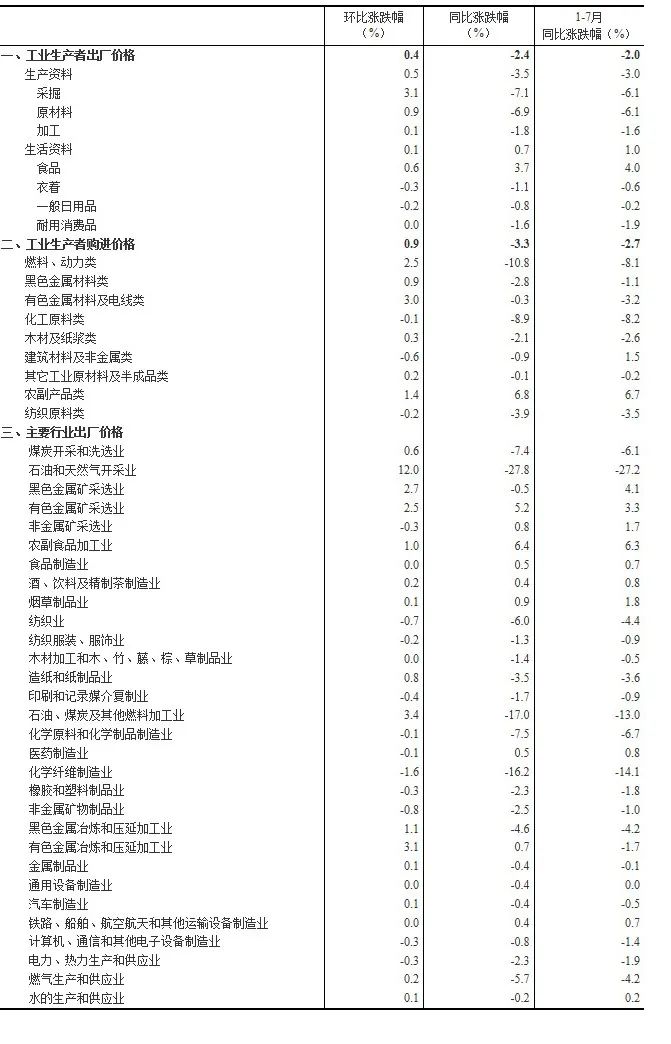 国家统计局:2020年7月份居民消费价格同比上涨2.7% 2020年7月份,全国工业生产者出厂价格同比下降2.4%,环比上涨0.4%;工业生产者购进价格同比下降3.3%,环比上涨0.9%。1―7月平均,工业生产者出厂价格比去年同期下降2.0%,工业生产者购进价格下降2.7%。 一、工业生产者价格同比变动情况 工业生产者出厂价格中,生产资料价格同比下降3.5%,降幅比上月收窄0.7个百分点,影响工业生产者出厂价格总水平下降约2.56个百分点。其中,采掘工业价格下降7.1%,原材料工业价格下降6.9%,加工工业价格下降1.8%。生活资料价格同比上涨0.7%,涨幅比上月扩大0.1个百分点,影响工业生产者出厂价格总水平上涨约0.19个百分点。其中,食品价格上涨3.7%,衣着价格下降1.1%,一般日用品价格下降0.8%,耐用消费品价格下降1.6%。 工业生产者购进价格中,燃料动力类价格下降10.8%,化工原料类价格下降8.9%,黑色金属材料类价格下降2.8%,有色金属材料及电线类价格下降0.3%;农副产品类价格上涨6.8%。 二、工业生产者价格环比变动情况 工业生产者出厂价格中,生产资料价格上涨0.5%,涨幅与上月相同,影响工业生产者出厂价格总水平上涨约0.34个百分点。其中,采掘工业价格上涨3.1%,原材料工业价格上涨0.9%,加工工业价格上涨0.1%。生活资料价格上涨0.1%,涨幅与上月相同,影响工业生产者出厂价格总水平上涨约0.04个百分点。其中,食品价格上涨0.6%,衣着价格下降0.3%,一般日用品价格下降0.2%,耐用消费品价格持平。 工业生产者购进价格中,有色金属材料及电线类价格上涨3.0%,燃料动力类价格上涨2.5%,农副产品类价格上涨1.4%,黑色金属材料类价格上涨0.9%;建筑材料及非金属类价格下降0.6%。 2020年7月工业生产者价格主要数据 更多阅读:国家统计局:2019年11月份居民消费价格同比上涨4.5%国家统计局:2023年2月份居民消费价格同比上涨1.0% 环比下降0.5%国家统计局:2021年3月份居民消费价格同比上涨0.4% 环比下降0.5%国家统计局:2022年10月份居民消费价格同比上涨2.1% 环比上涨0.1%国家统计局:2023年4月份居民消费价格同比上涨0.1% 环比下降0.1%国家统计局:2023年1月份居民消费价格同比上涨2.1% 环比上涨0.8%国家统计局:2023年6月份居民消费价格同比持平 环比下降0.2%国家统计局:2022年12月份居民消费价格同比上涨1.8% 环比持平国家统计局:2020年12月份居民消费价格同比上涨0.2%国家统计局:2022年11月份居民消费价格同比上涨1.6% 环比下降0.2%国家统计局:2023年3月份居民消费价格同比上涨0.7% 环比下降0.3%国家统计局:2021年12月份居民消费价格同比上涨1.5% 环比下降0.3%国家统计局:2019年8月份居民消费价格同比上涨2.8%国家统计局:2019年2月份居民消费价格同比上涨1.5%国家统计局:2019年6月份居民消费价格同比上涨2.7%