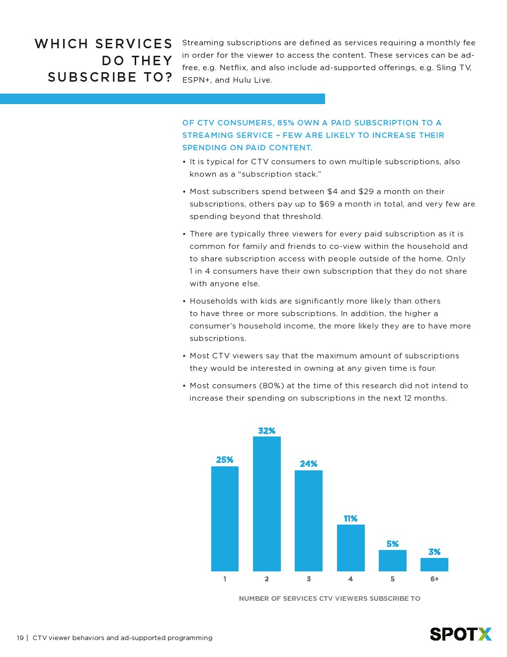虽然接受调查的1500名CTV观众中有40%更喜欢观看付费、无广告的服务,但观众愿意支付的订阅服务数量似乎是有限的。事实上,目前约有4/5的观众在观看广告支持的节目。