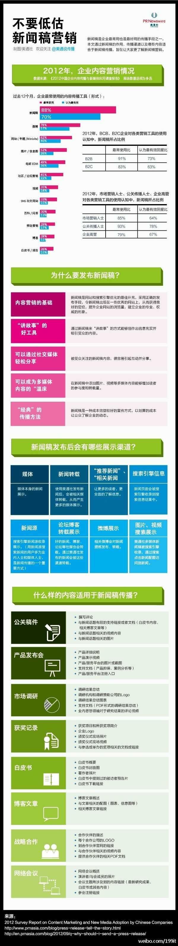 内容营销中,新闻营销是企业最常用也是最好用的传播手段之一。2012年在企业最常用的内容传播工具中,新闻稿是最常使用的方式,占88%。70%的企业认为其是最有效的方式。它还具有是内容营销的基础、“讲故事”的好工具、可以通过社交媒体轻松分享、成为多媒体内容的“温床”等优点。