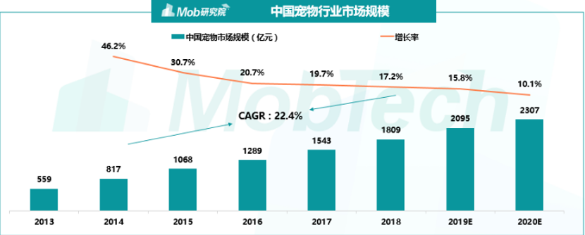 与此同时,养宠物人士的主要需求,也逐渐变成维系亲情、缓解寂寞等。伴随如此状态,宠物主的消费也在逐年上升。2019年,我国宠物的市场规模已经超过2000亿,年复增长率也达到了22.4%。