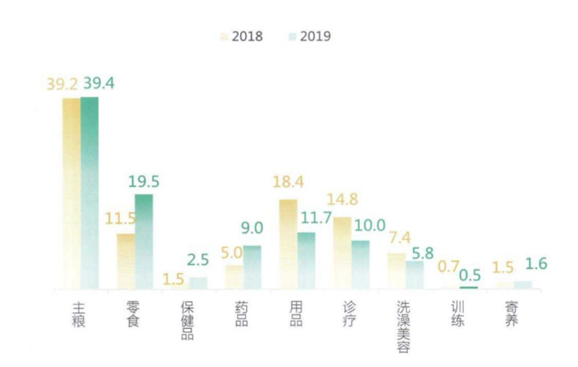 根据《2019中国宠物消费趋势报告》可见,宠物食品消费(包括宠物主粮、宠物零食)是最大的养宠支出,宠物用品紧随其后。