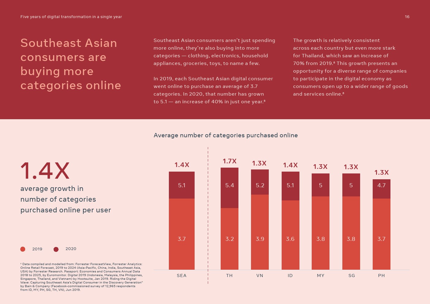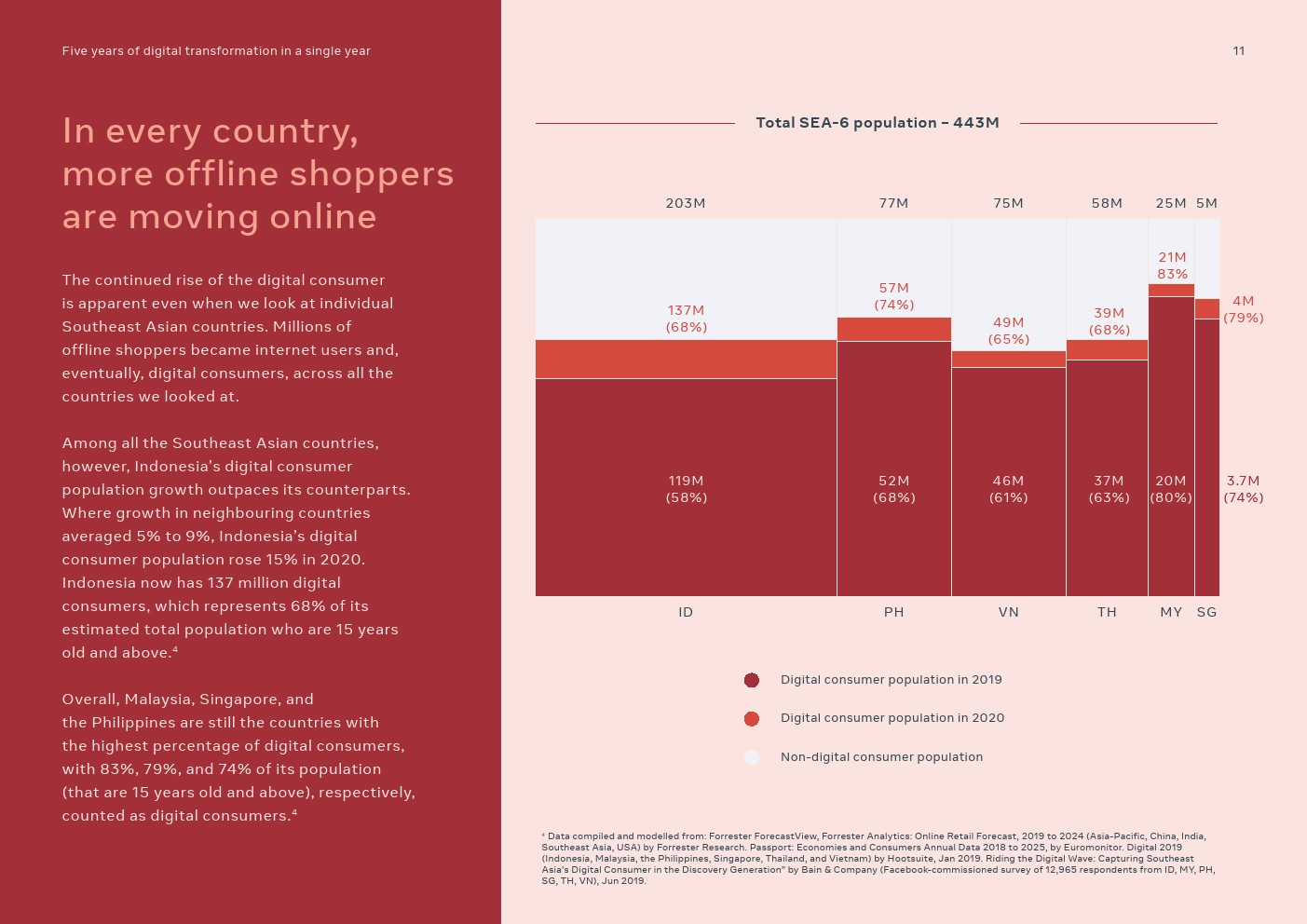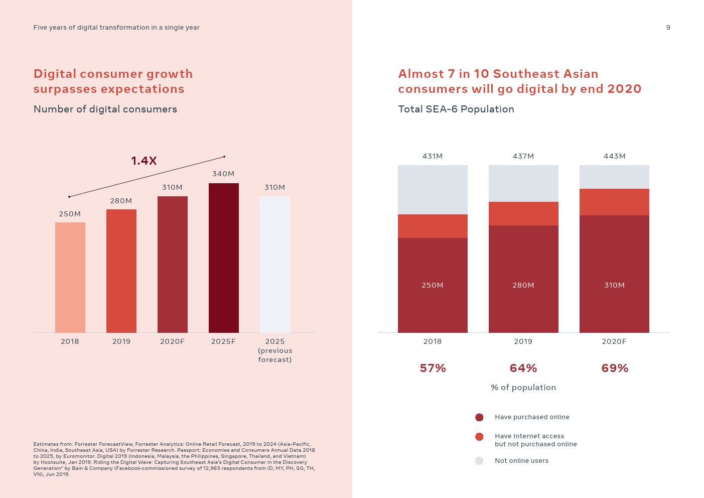 到2020年底,东南亚的网络消费者数量将达到3.1亿,之前预测这个数字要到2025年才能达到。这意味着到2020年底,近70%的东南亚消费者将实现数字化。东南亚的网上零售市场普及率已经超过印度,增长了1.6倍,达到5%。