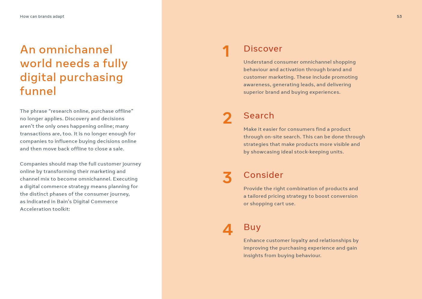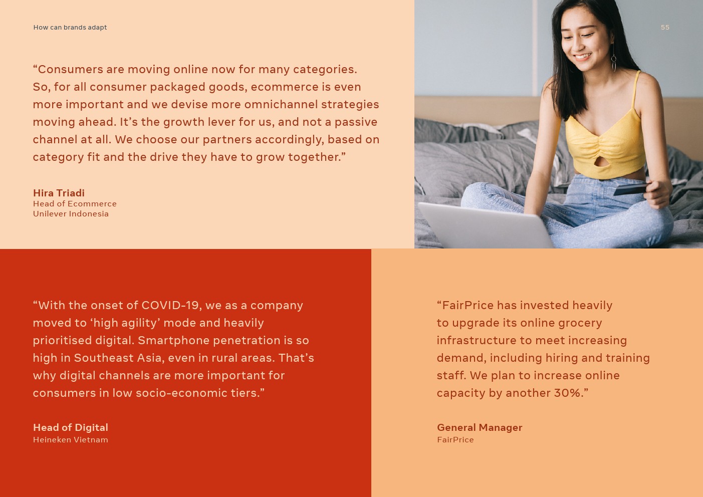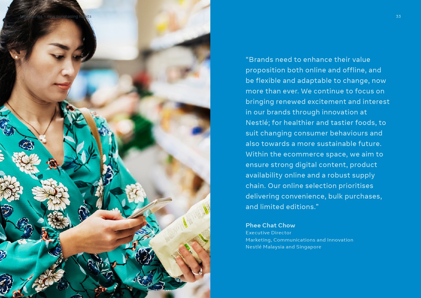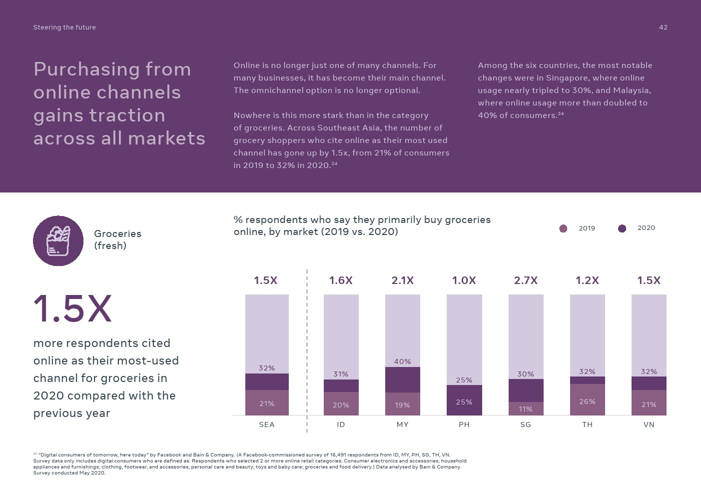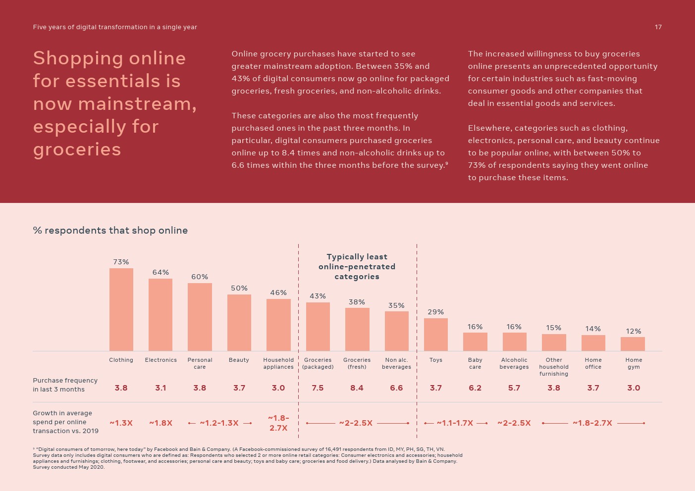 2020年,消费者平均上网购买5.1个品类的商品,仅一年就增长了40%。人们现在也更容易接受网购食品杂货:43%的受访者现在在网上购买包装好的食品杂货。