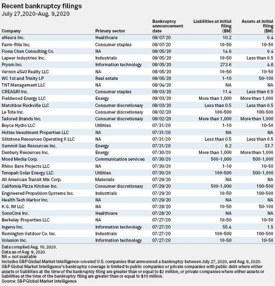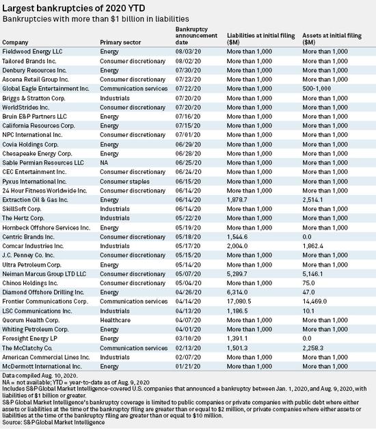 标普全球市场情报公司的破产分析包括有公共债务的上市公司或私人公司。拥有公共债务的上市公司在申请破产时必须拥有至少200万美元的资产或债务。相比之下,私营企业必须至少包括1000万美元。