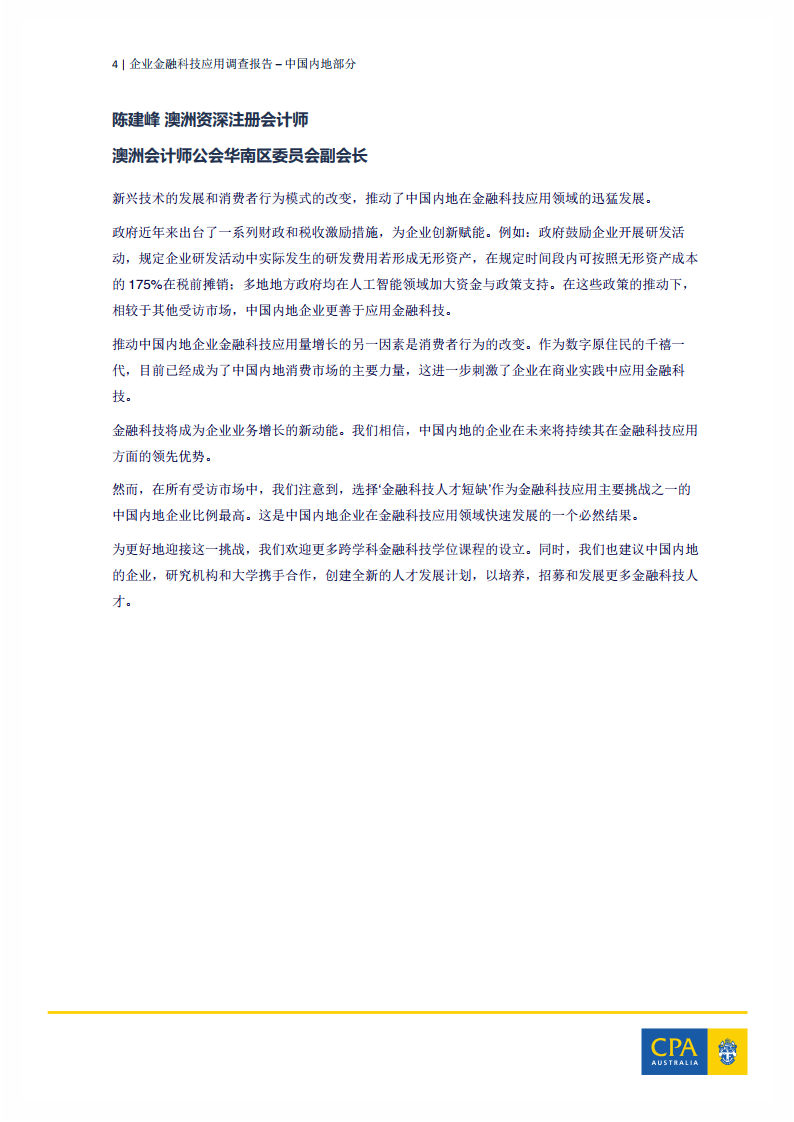 “政府近年来出台了一系列财政和税收激励措施,为企业创新赋能。例如:政府鼓励企业开展研发活动,规定企业研发活动中实际发生的研发费用若形成无形资产,在规定时间段内可按照无形资产成本的175%在税前摊销;多地地方政府均在人工智能领域加大资金投入与政策支持。在这些政策的推动下,相较于其他受访市场,中国企业更善于应用金融科技。”