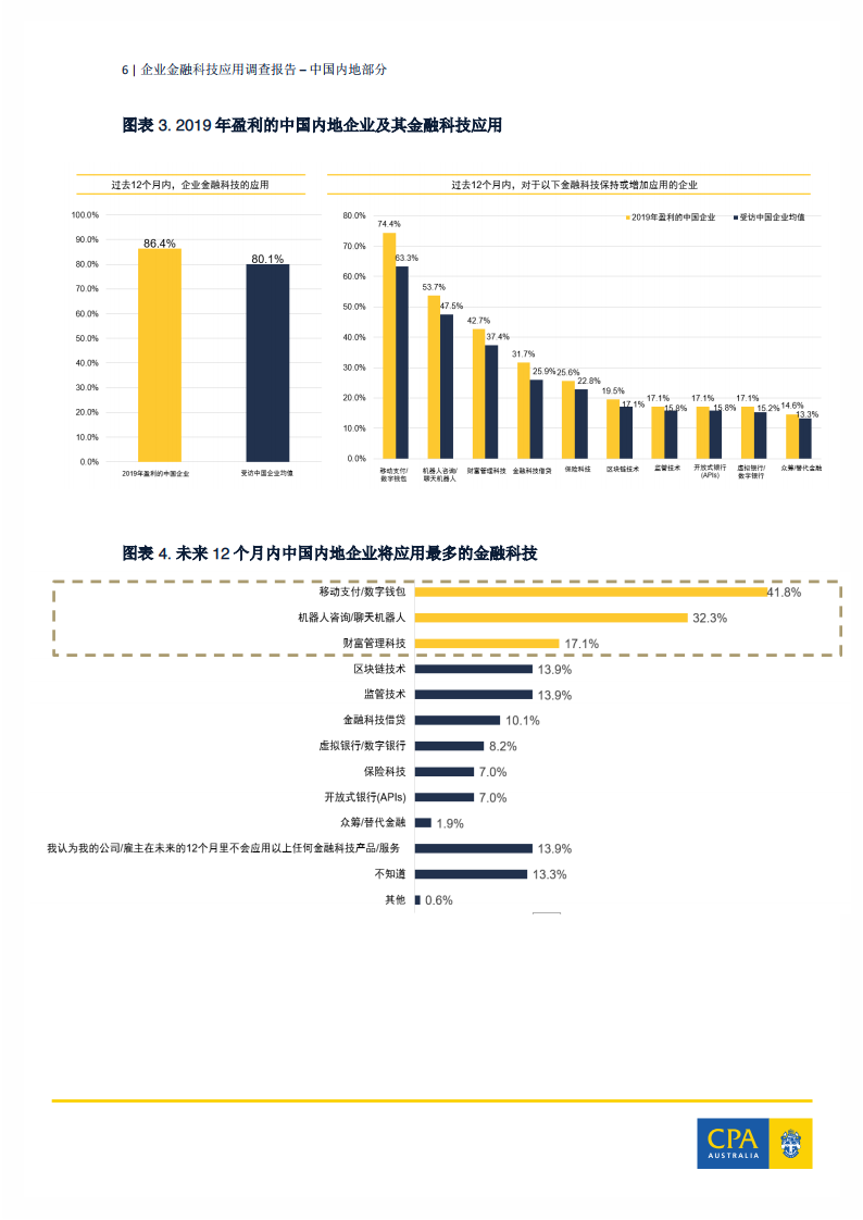 此外,调查还发现,金融科技应用与企业业务增长之间存有紧密联系。在过去12个月内,74%于2019年盈利的中国企业保持或增加了移动支付/数字钱包的应用,54%于2019年盈利的中国企业保持或增加了机器人咨询/聊天机器人的应用。
