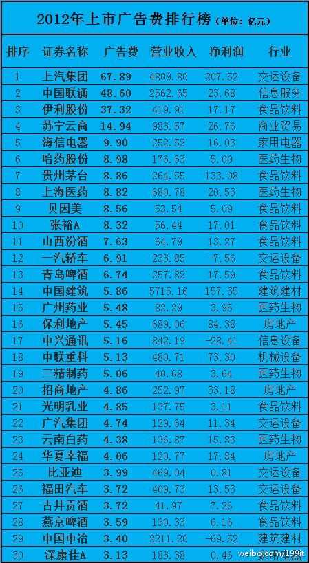 【2012上市公司广告促销费排行榜】1186家上市公司披露广告费合计支出582.50亿。30家上市公司广告费支出超过3亿。食品饮料公司占比最多,交运设备和医药生物公司紧随其后。上汽集团67.89亿第一,中国联通48.60亿和伊利股份37.32亿。122家上市公司披露促销费合计支出67.46亿,青岛啤酒促销费15.52亿。