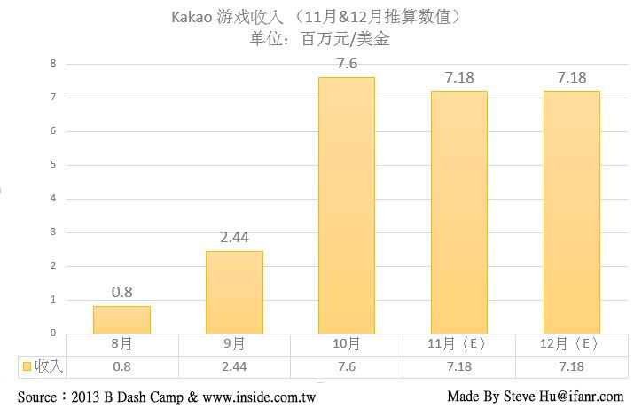 而在 2012 年 9 月,随着 Kakao 游戏平台的发布,其营收情况在很短的时间内便发生了很大的变化。2012 年底,在最新公布的数据,整个财年度从亏损变成了盈利,利润达到了 650 万美金。再来看收入,从 2011 年的 160 万美金,成长到 2012 年全年的 4500 万美金,完成了将近 30 倍的狂飙式增长。而这背后的功臣,首推游戏平台的推出。