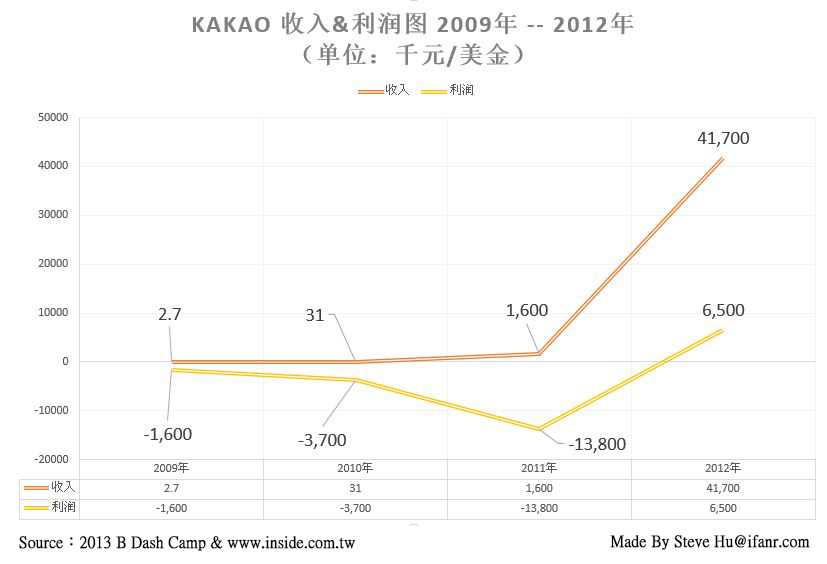 在发布 Kakao Talk 之前,Kakao 这家公司已经成立,并已经运营了三年的时间。今年 4 月在日本举办的 B Dash Camp 的行业会议上,Kakao 的联合执行长 Sirgoo Lee 先生在现场公布了一些 Kakao 运营数据,通过这些收入和利润数据,有助于我们理解 Kakao 的商业逻辑。这次公开的数据,可能是到目前为止,最为完整的一次运营数据的揭露。因此,本文也尝试对这些数据进行解读,从而可以定量地描绘出 Kakao 在目前以及未来的一些运营策略,并进而依据这些数据对中国的微信也进行一些猜想。