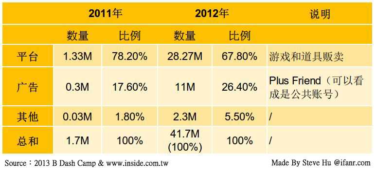 从以上可以看出,游戏在收入结构中,占据了半壁江山还多,占总收入的 6 成多。考虑到 Kakao Talk 的游戏平台仅仅是在 2012 年 9 月份发布,到 2012 年底,仅仅花了 4 个月时间,完成上述的成长速度,并且从亏损变为盈利,游戏的强大吸金能力,又再一次的获得了验证。