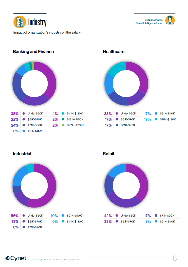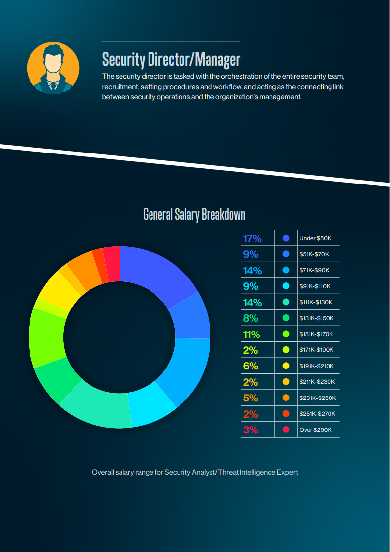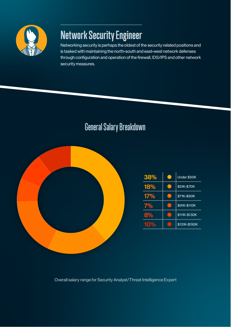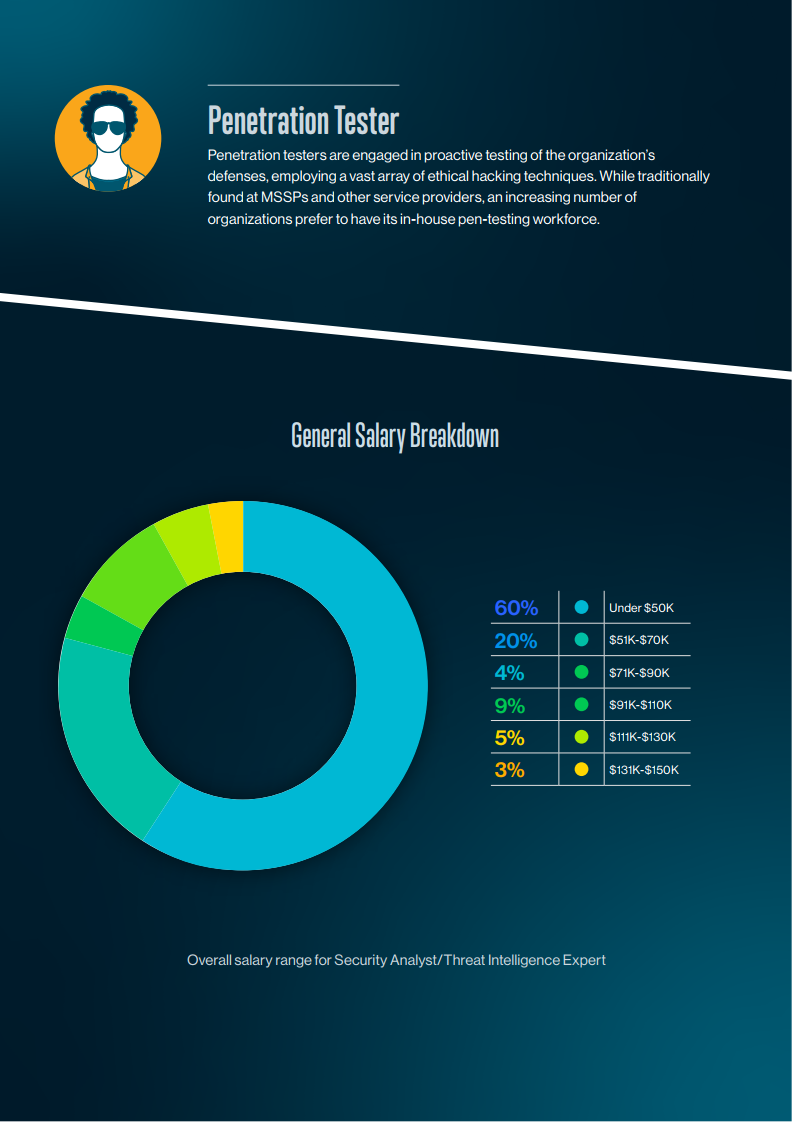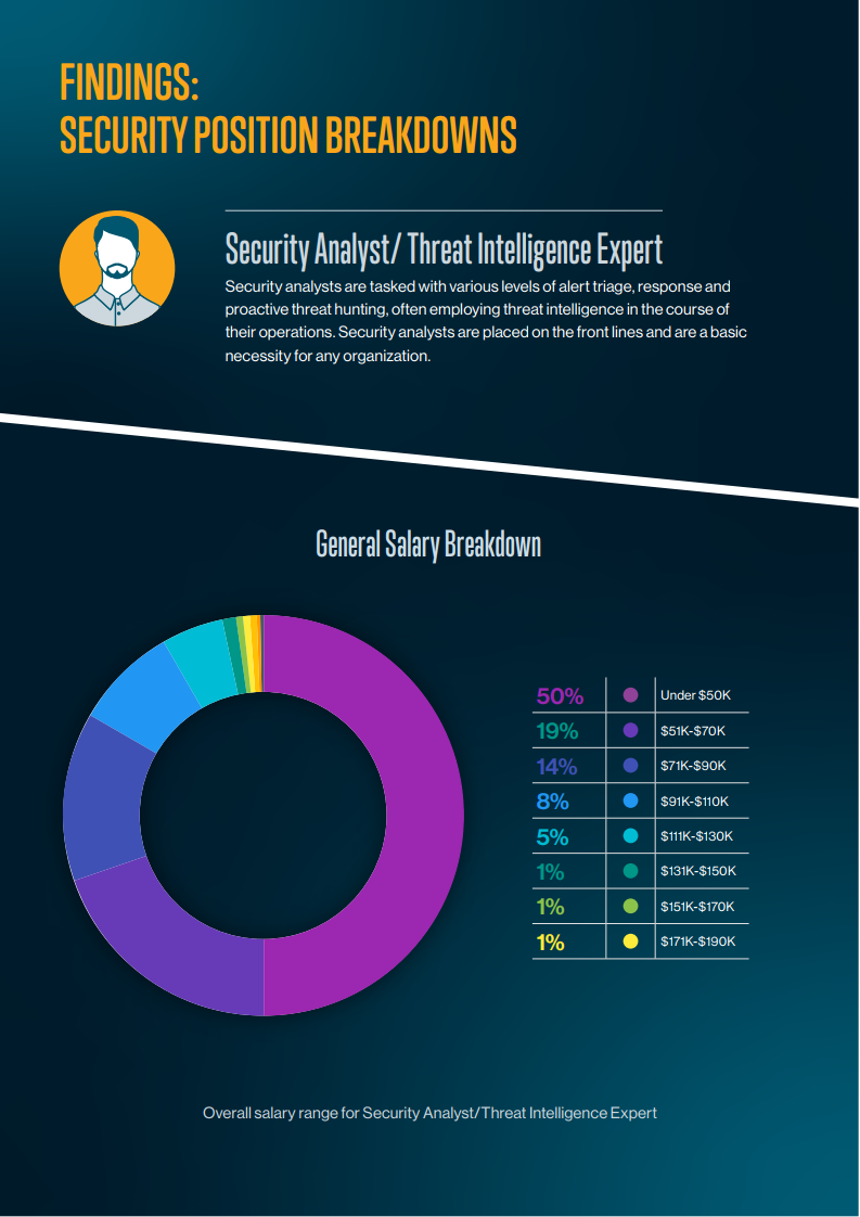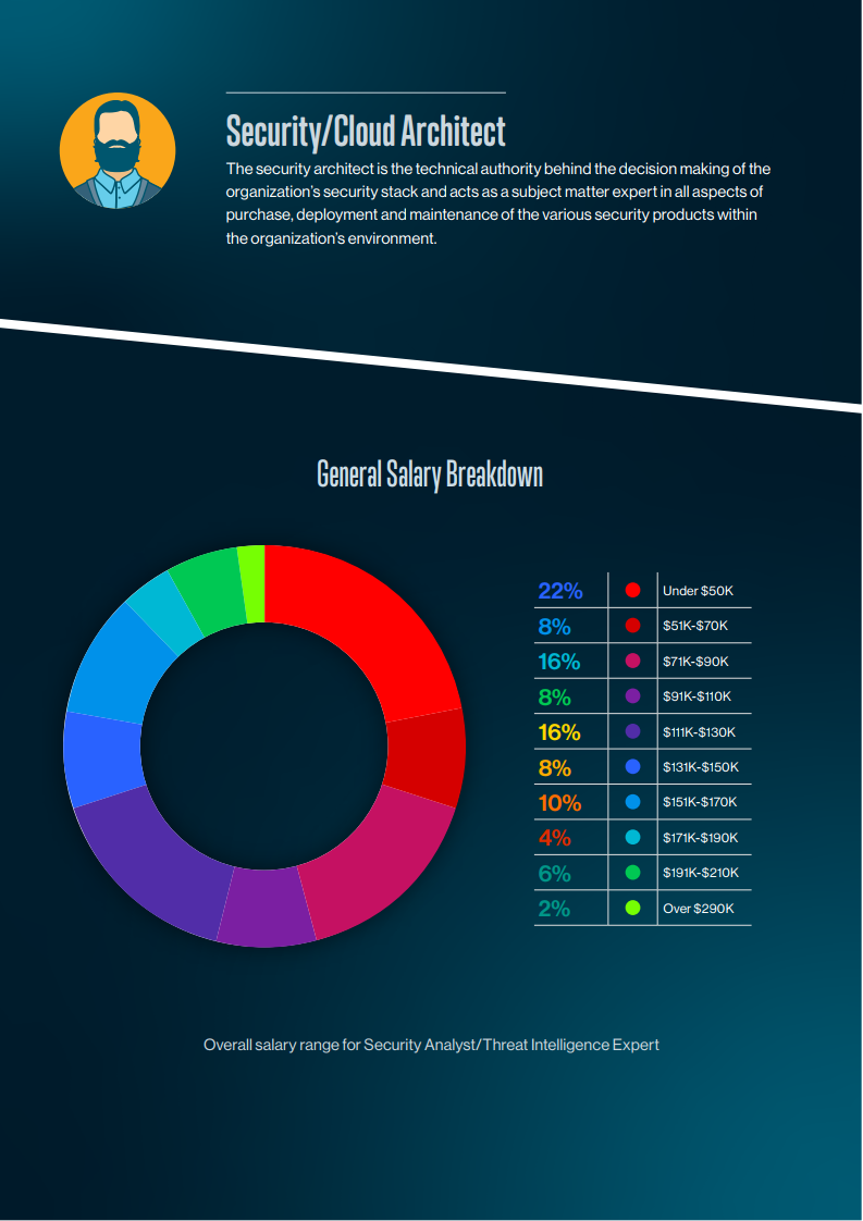 该份报告统计得到数据,形成五个安全职位的薪水调查结果,分别是安全分析师/威胁情报专员、安全/云安全架构师、网络安全工程师、渗透测试人员和安全总监/经理。