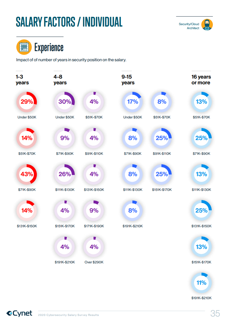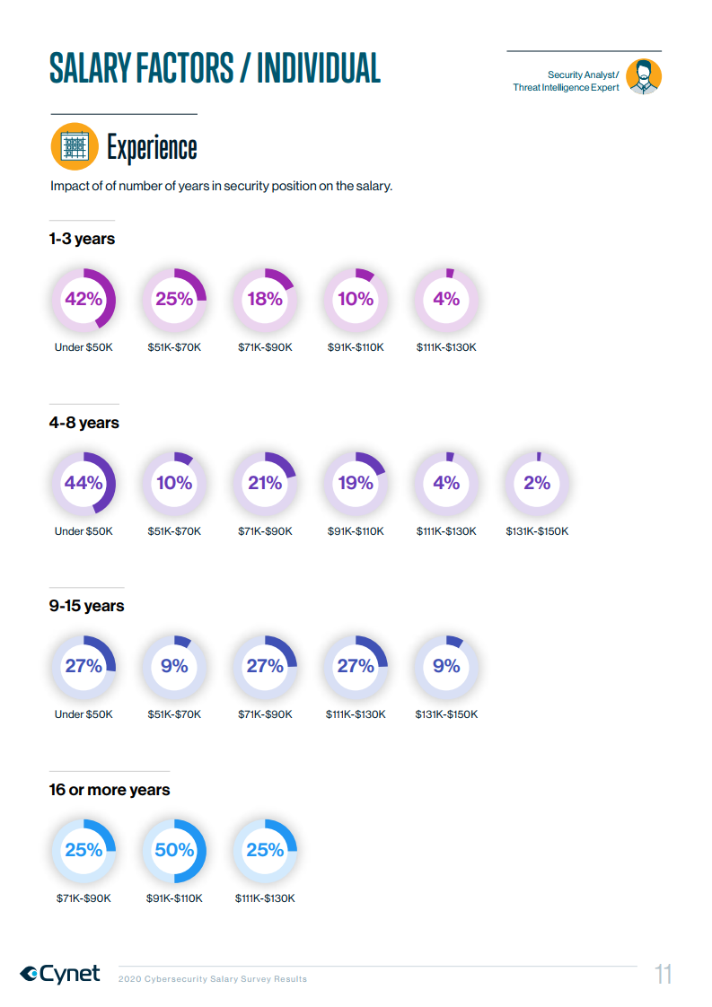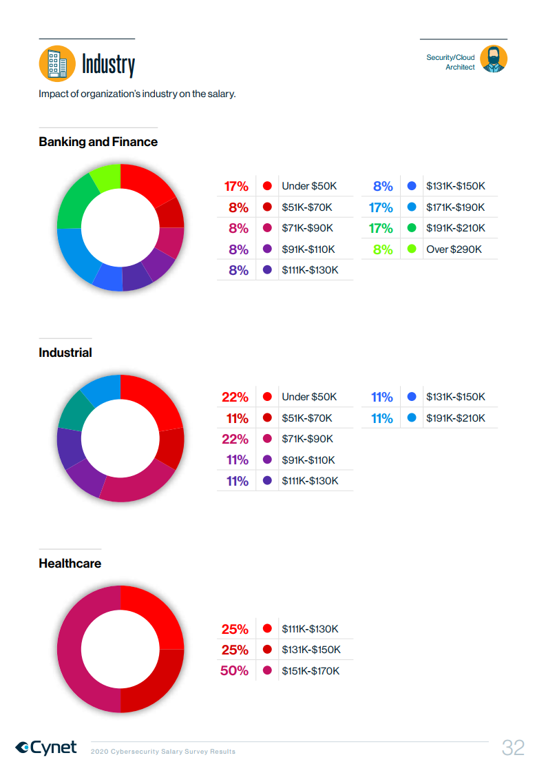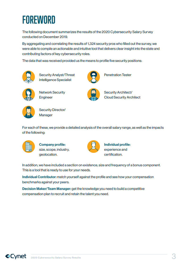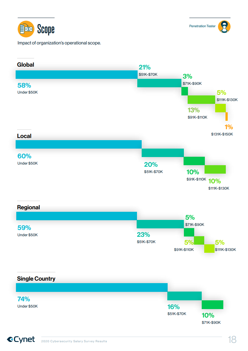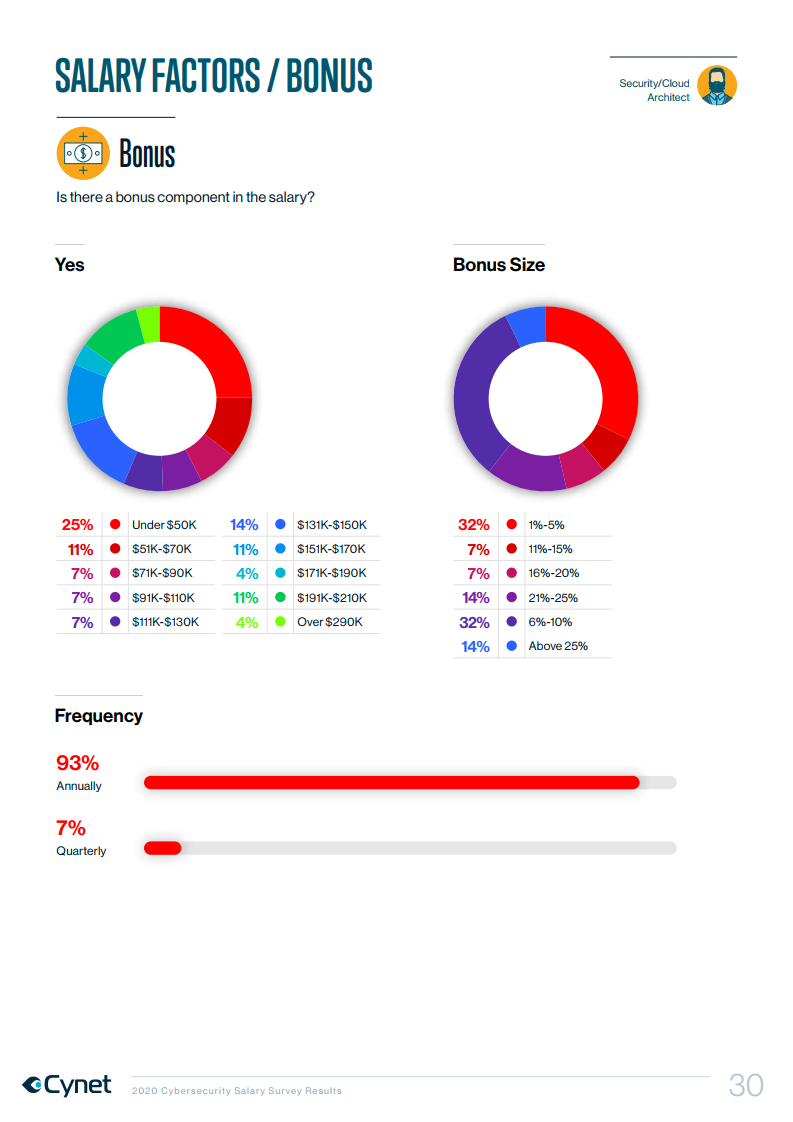 该份报告统计得到数据,形成五个安全职位的薪水调查结果,分别是安全分析师/威胁情报专员、安全/云安全架构师、网络安全工程师、渗透测试人员和安全总监/经理。