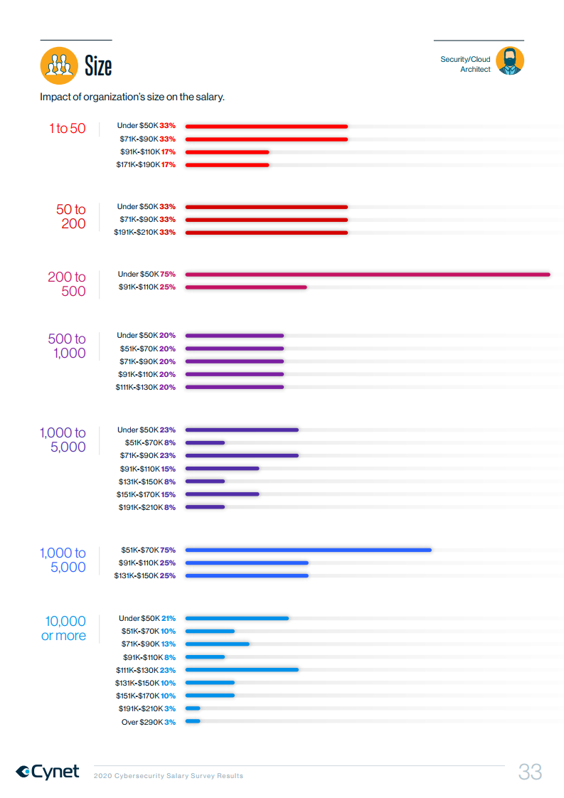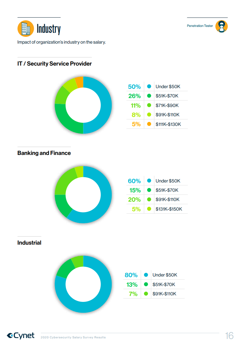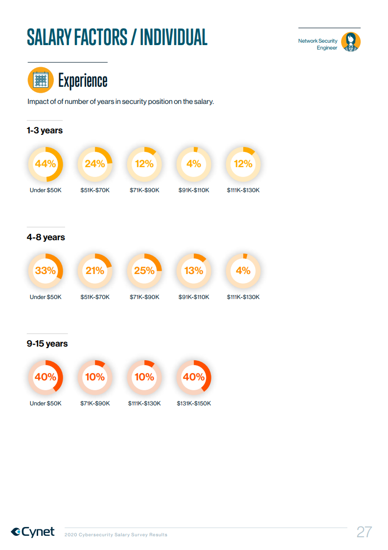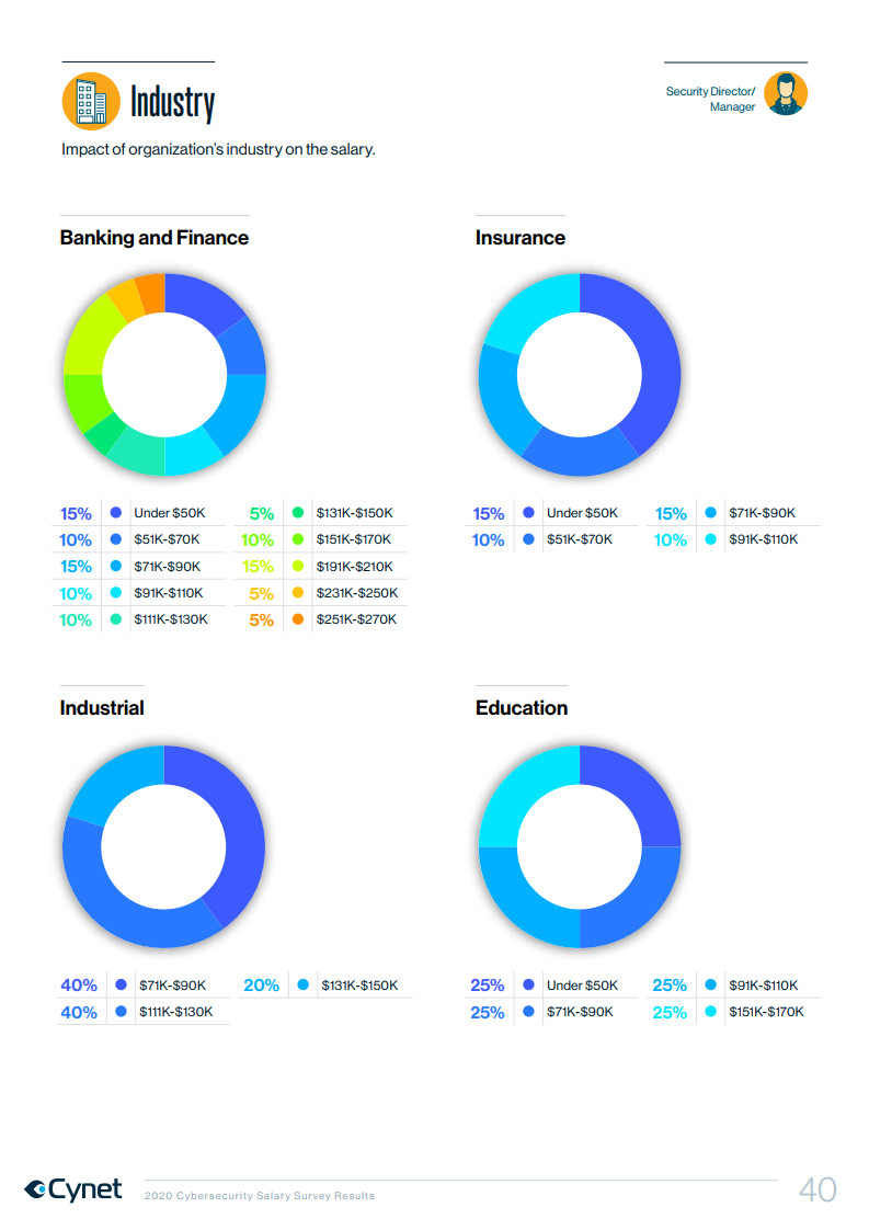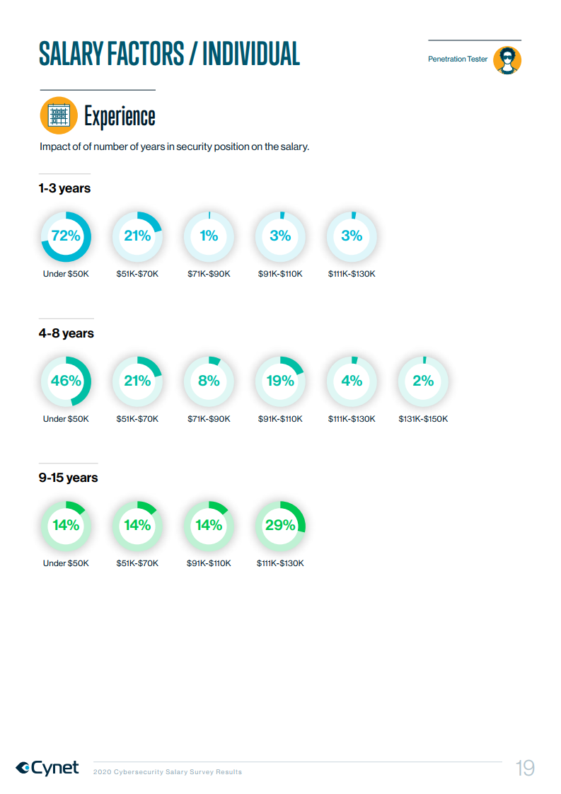 该份报告统计得到数据,形成五个安全职位的薪水调查结果,分别是安全分析师/威胁情报专员、安全/云安全架构师、网络安全工程师、渗透测试人员和安全总监/经理。