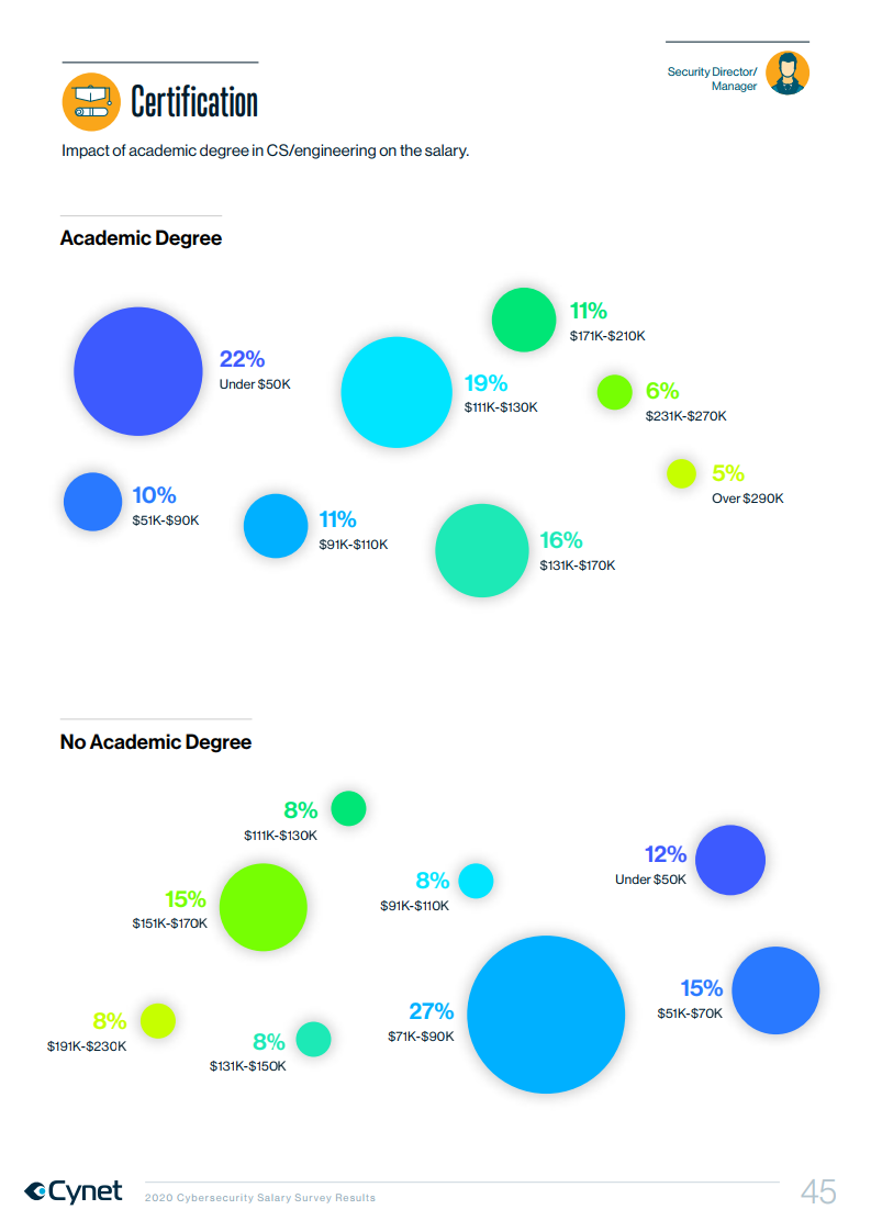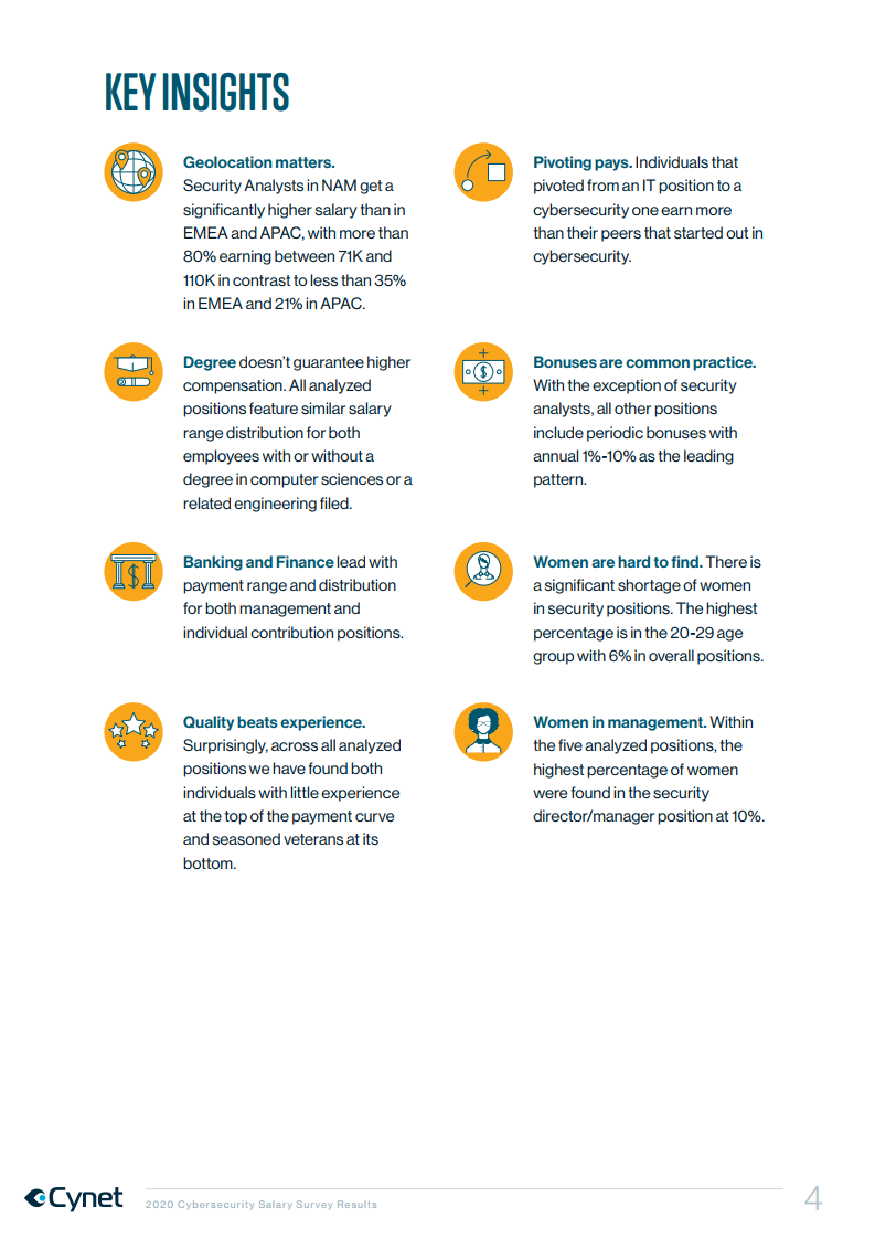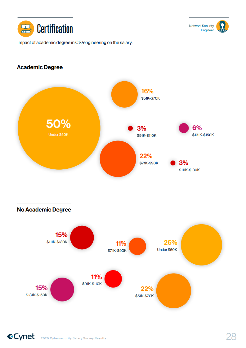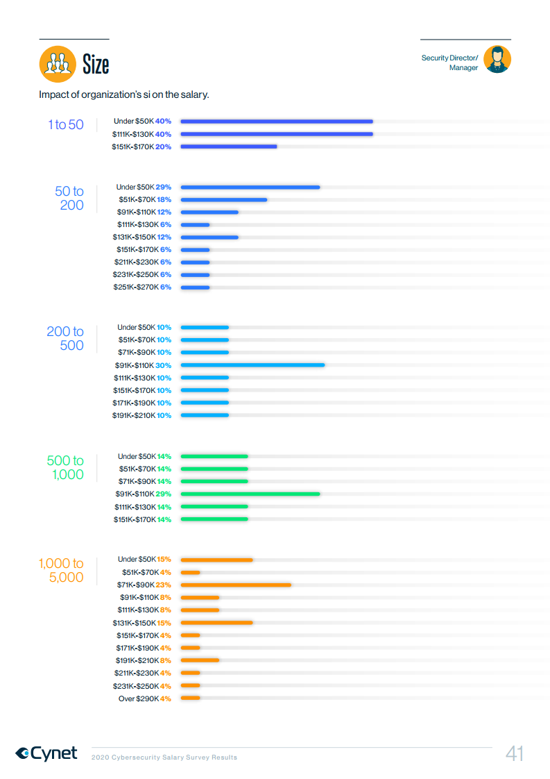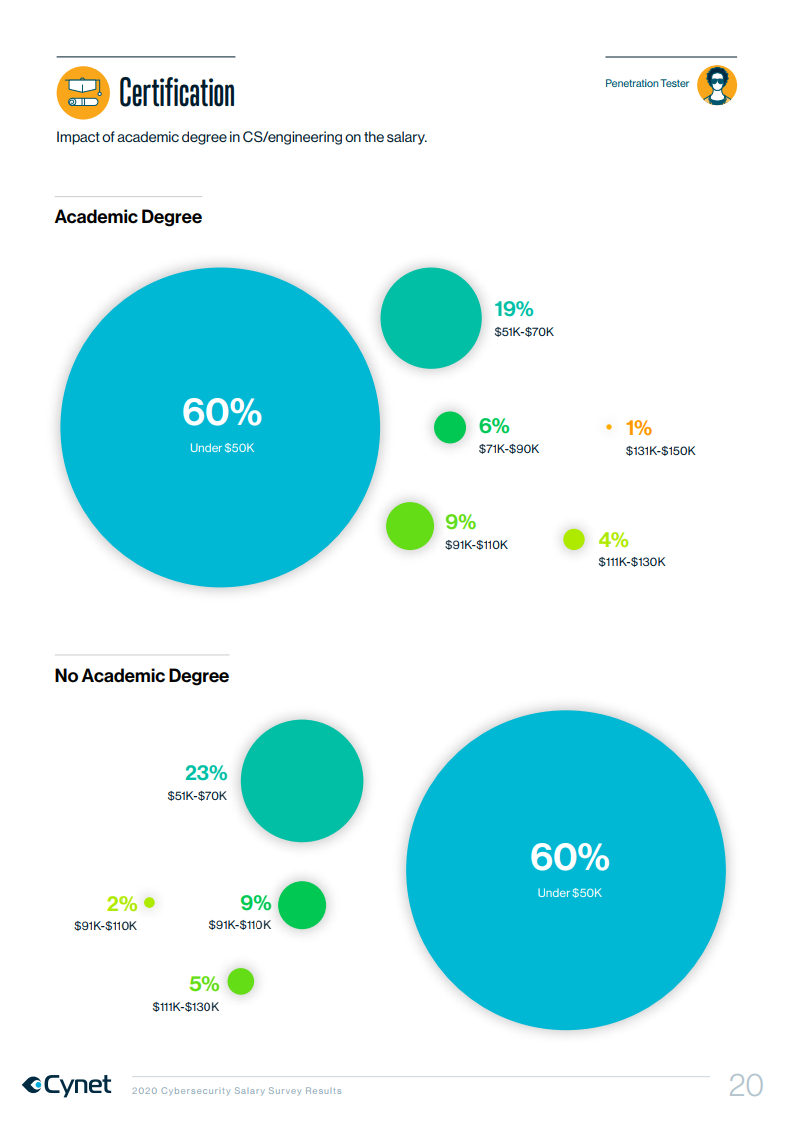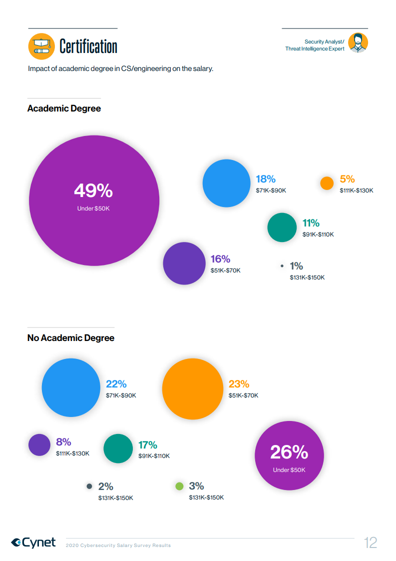 该份报告统计得到数据,形成五个安全职位的薪水调查结果,分别是安全分析师/威胁情报专员、安全/云安全架构师、网络安全工程师、渗透测试人员和安全总监/经理。