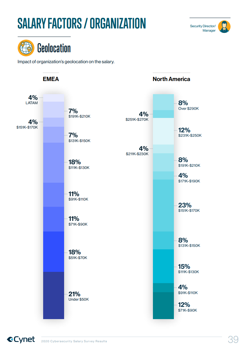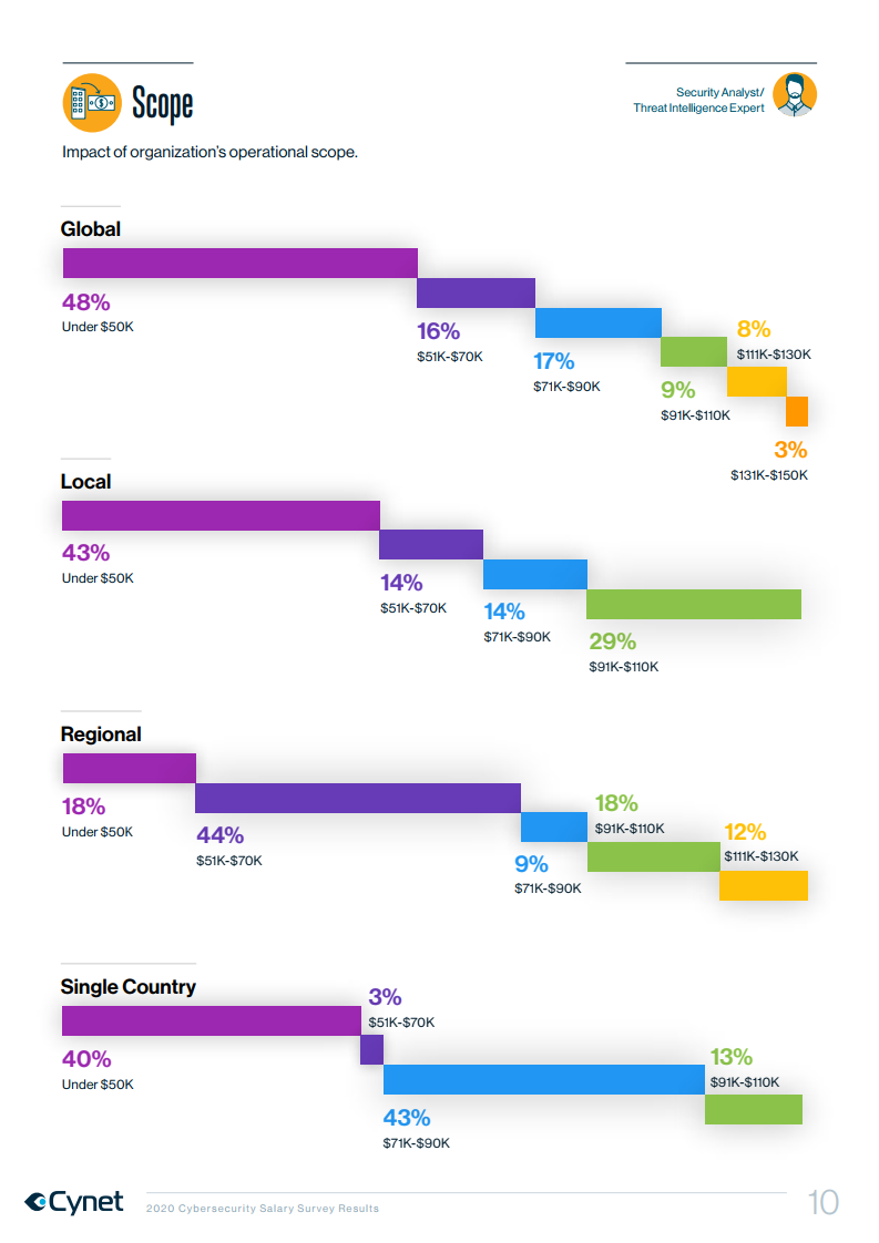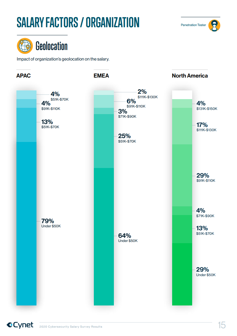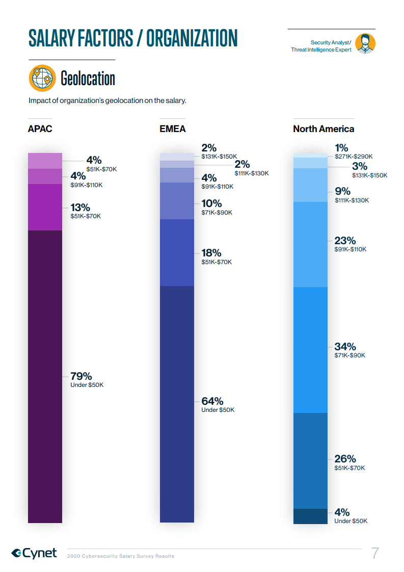地理位置问题。NAM的安全分析师的薪水远高于EMEA和APAC的分析师,其中80%以上的收入在7.1万至11万之间,而EMEA的分析师不到35%,APAC的只有21%。