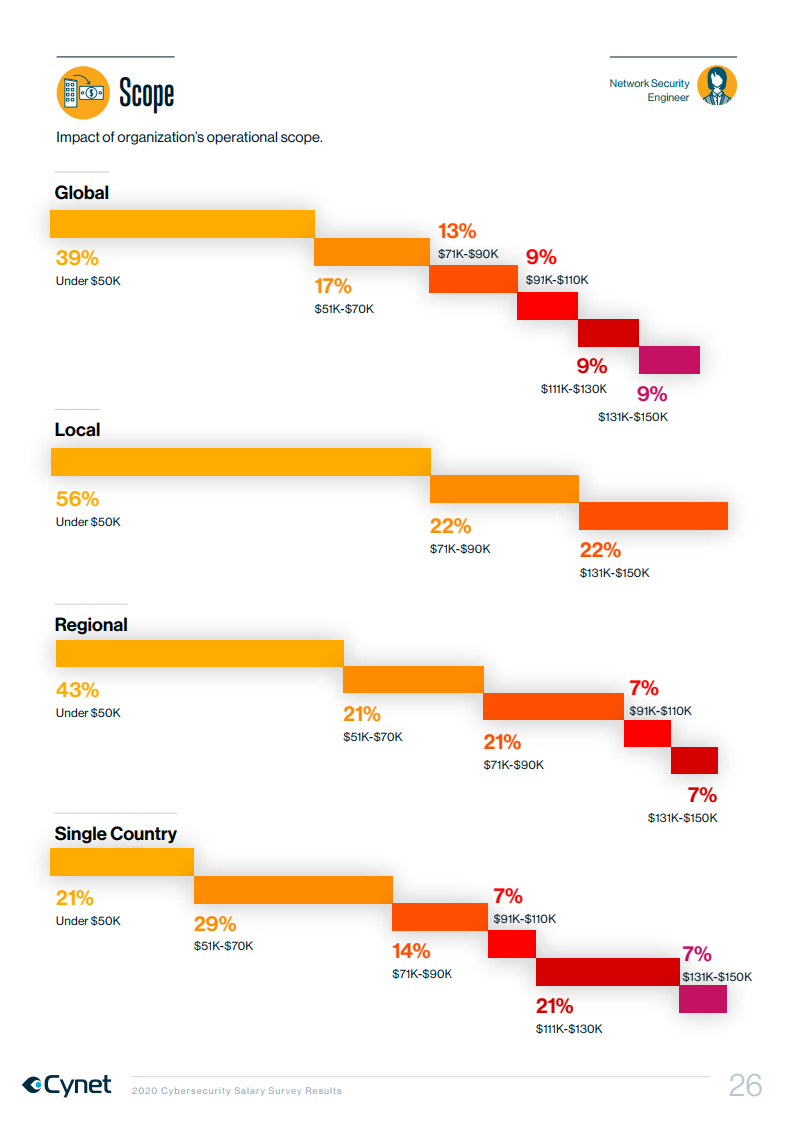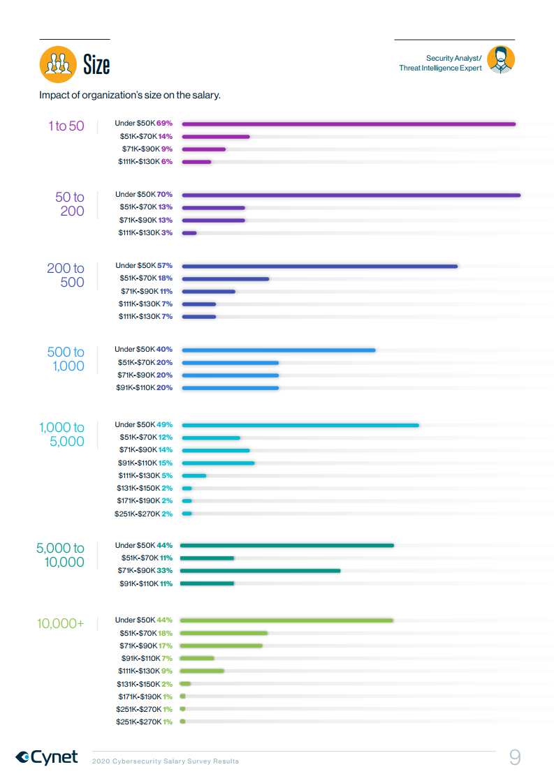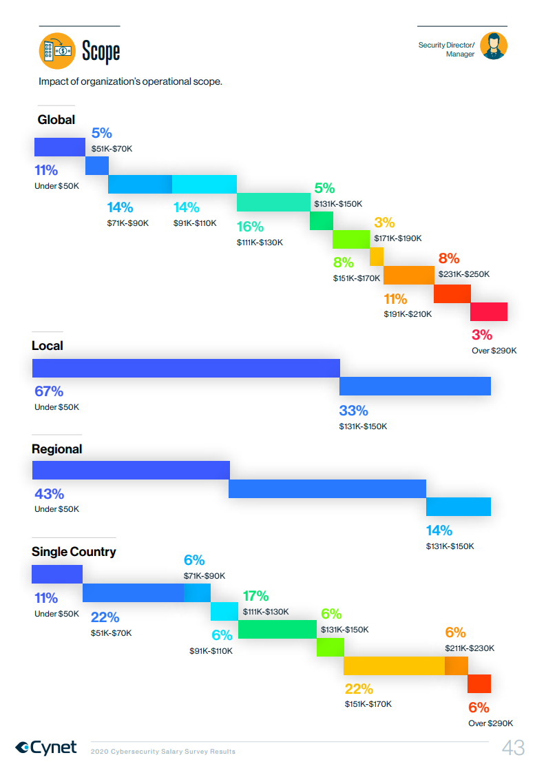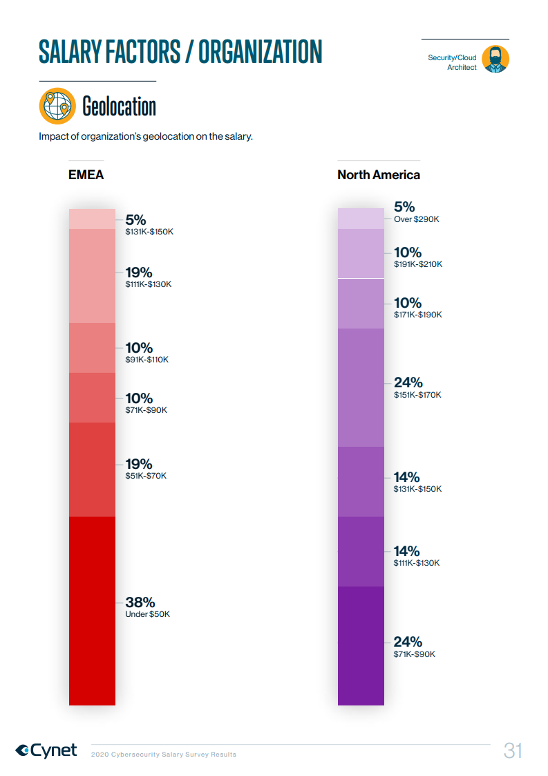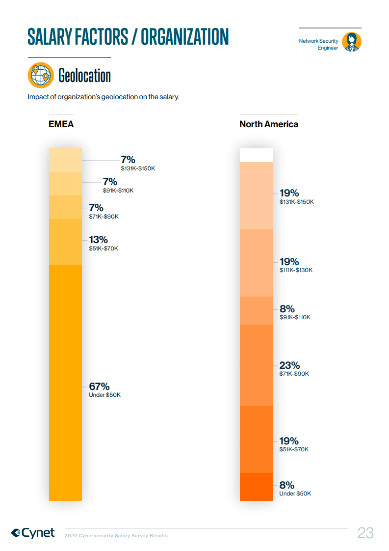 地理位置问题。NAM的安全分析师的薪水远高于EMEA和APAC的分析师,其中80%以上的收入在7.1万至11万之间,而EMEA的分析师不到35%,APAC的只有21%。