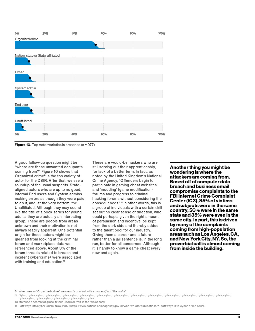 从漏洞的罪魁祸首来看,70%由外部参与者实施,其中55%的数据泄露是由有组织的犯罪集团实施的。而且,数据泄露更可能是单独或少数人导致的,因为只有4%的漏洞有4个或更多的攻击者。