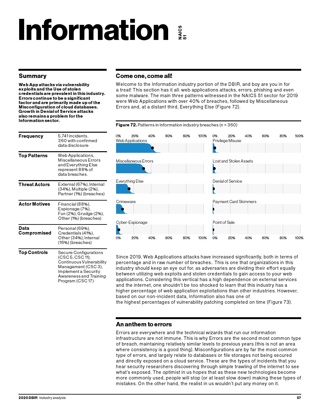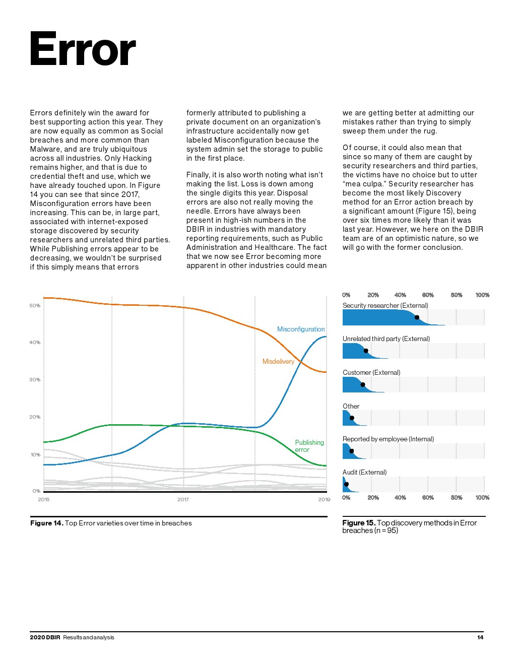 Verizon发布了“2020年数据泄露调查报告”。报告涵盖了多种来源收集的数据集,包括Verizon威胁研究咨询中心(VTRAC)调查人员提供的案例、外部合作者提供的案例以及公开披露的安全事件。随着Verizon继续努力寻找并与愿意共享信息以改善现实世界事件的多样性和覆盖范围的其他组织进行接触,年度数据将具有新的事件和违规来源。