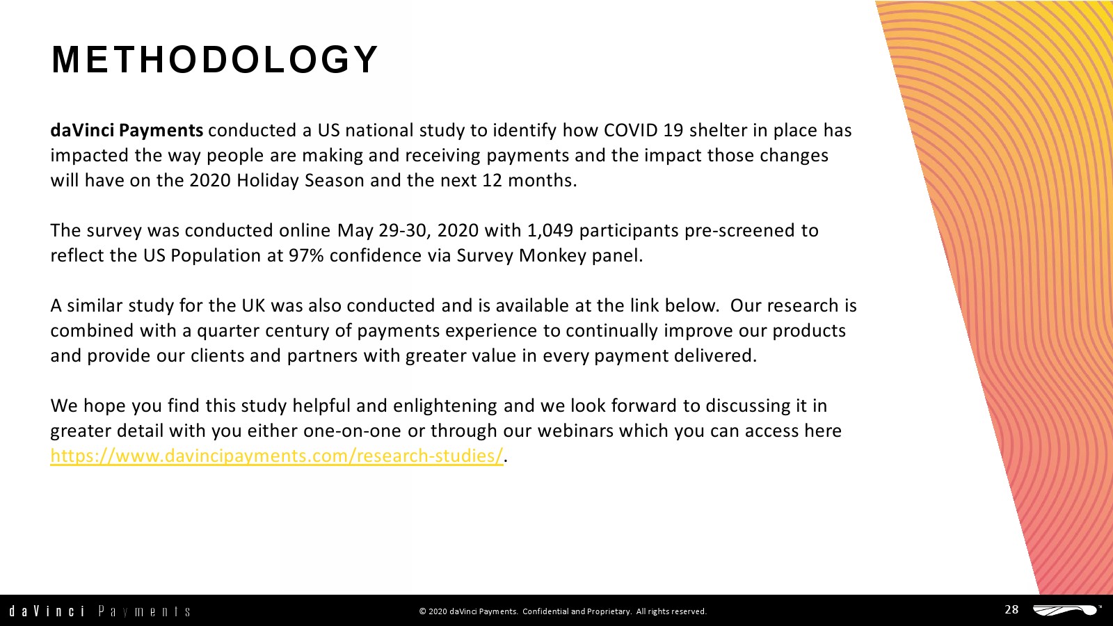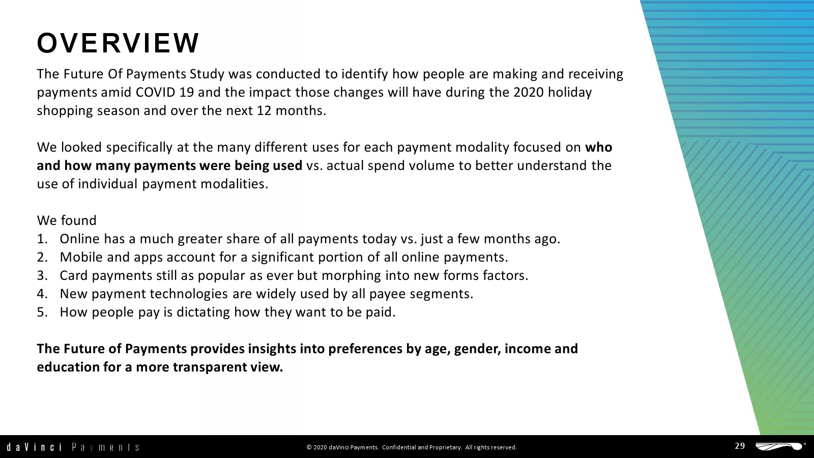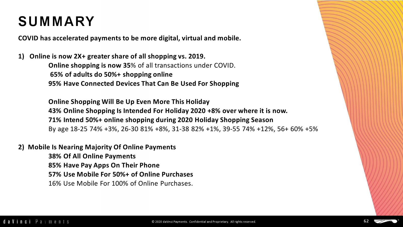 daVinci发布了新报告“美国支付的未来”。研究的目的是确定人们在新冠肺炎期间如何支付和结算的,以及这些变化将在2020年假日购物季和未来12个月内产生的影响。