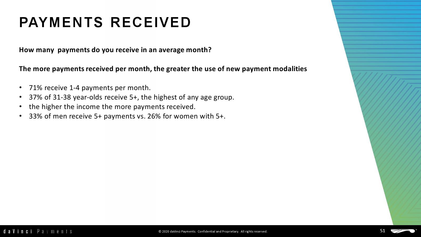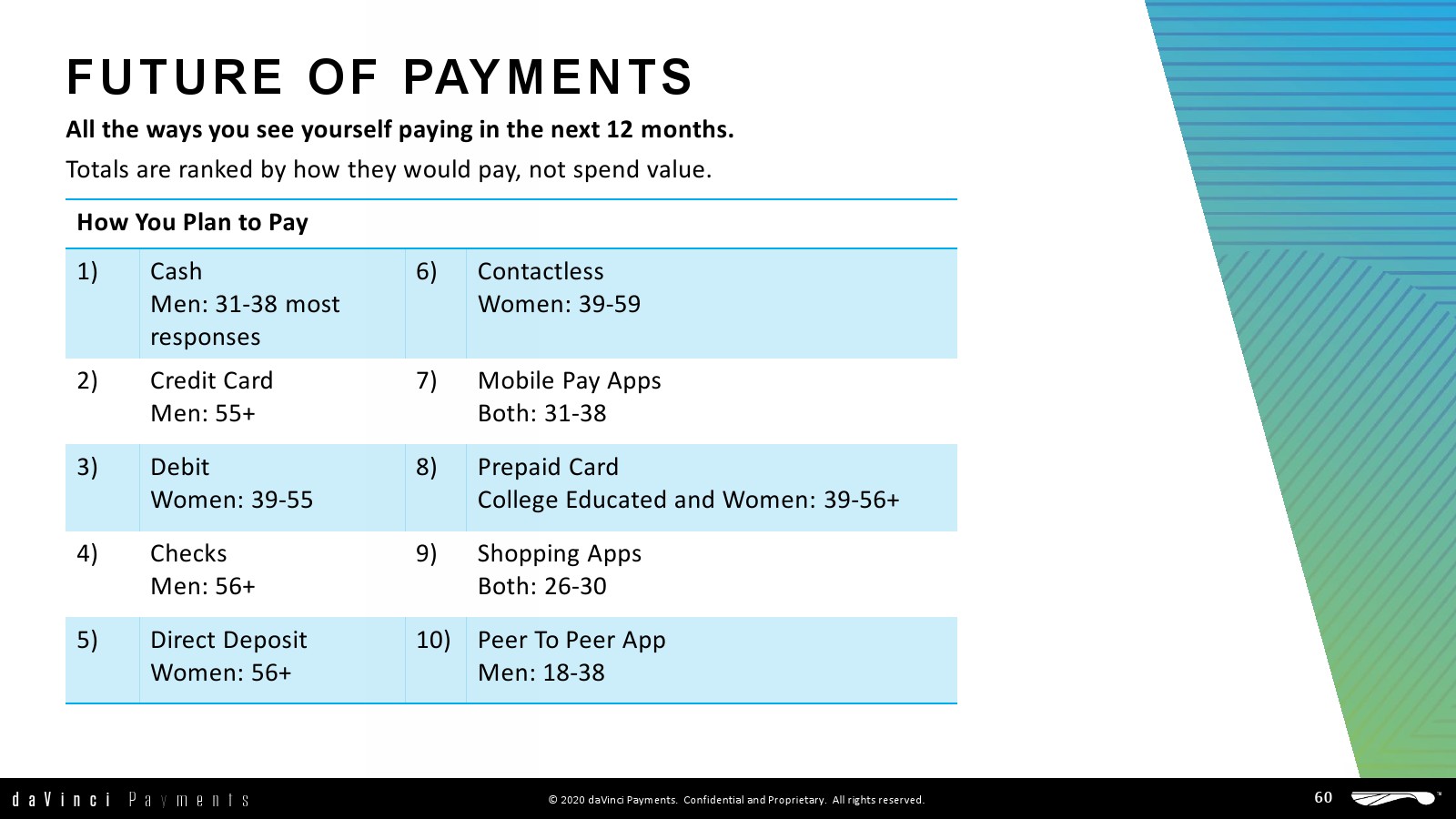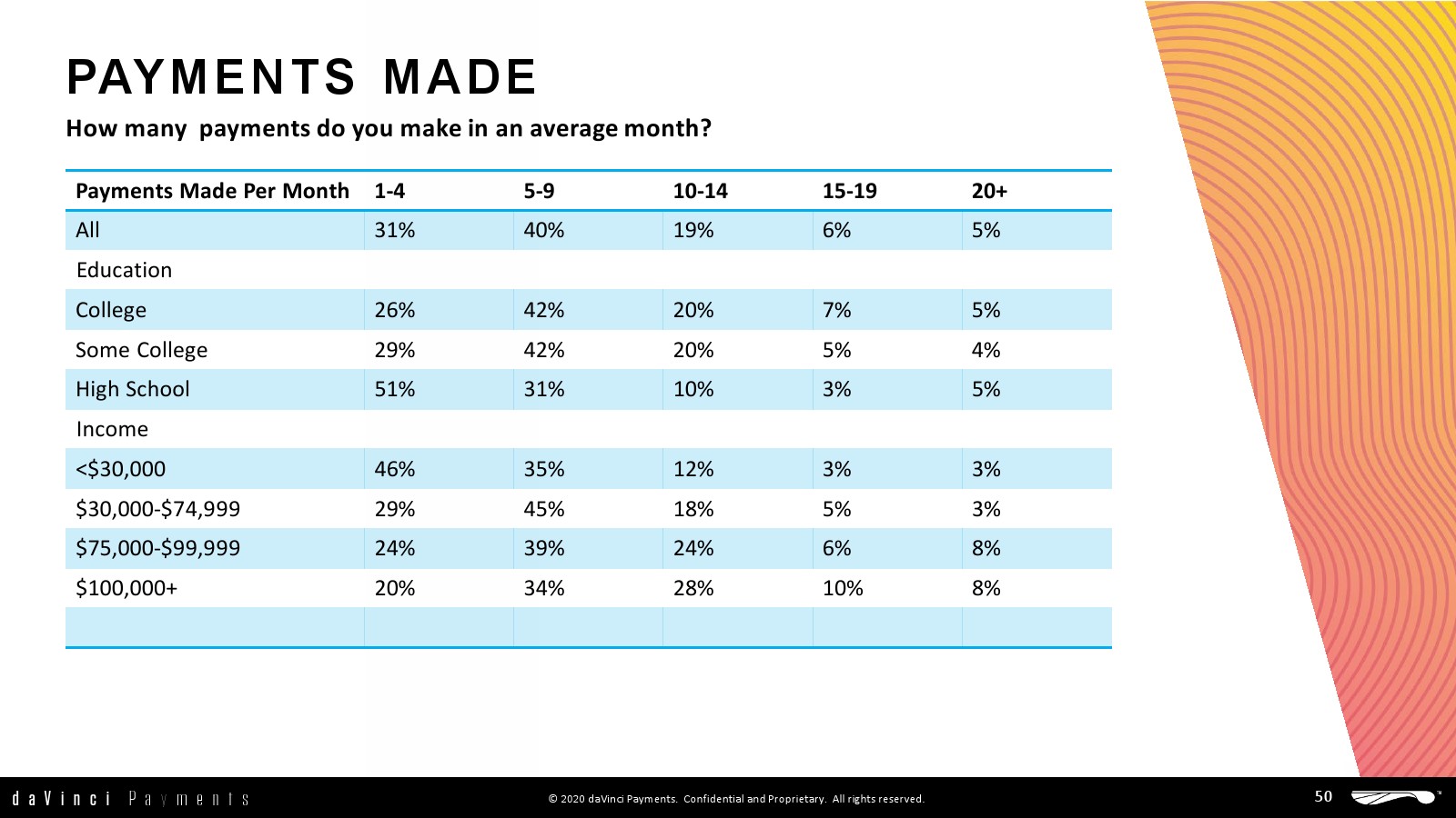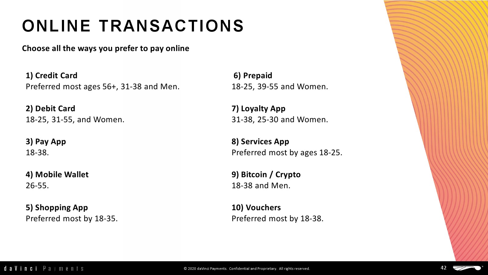 daVinci特别研究了每种支付方式的不同用途,重点关注谁使用了多少支付方式进行多少消费,以更好地了解个人支付方式的使用情况。