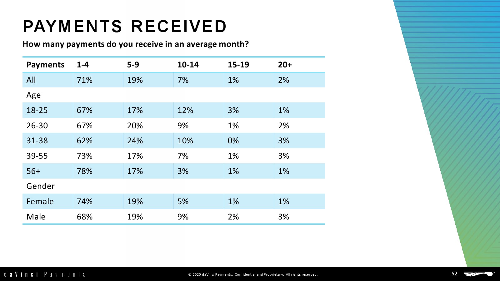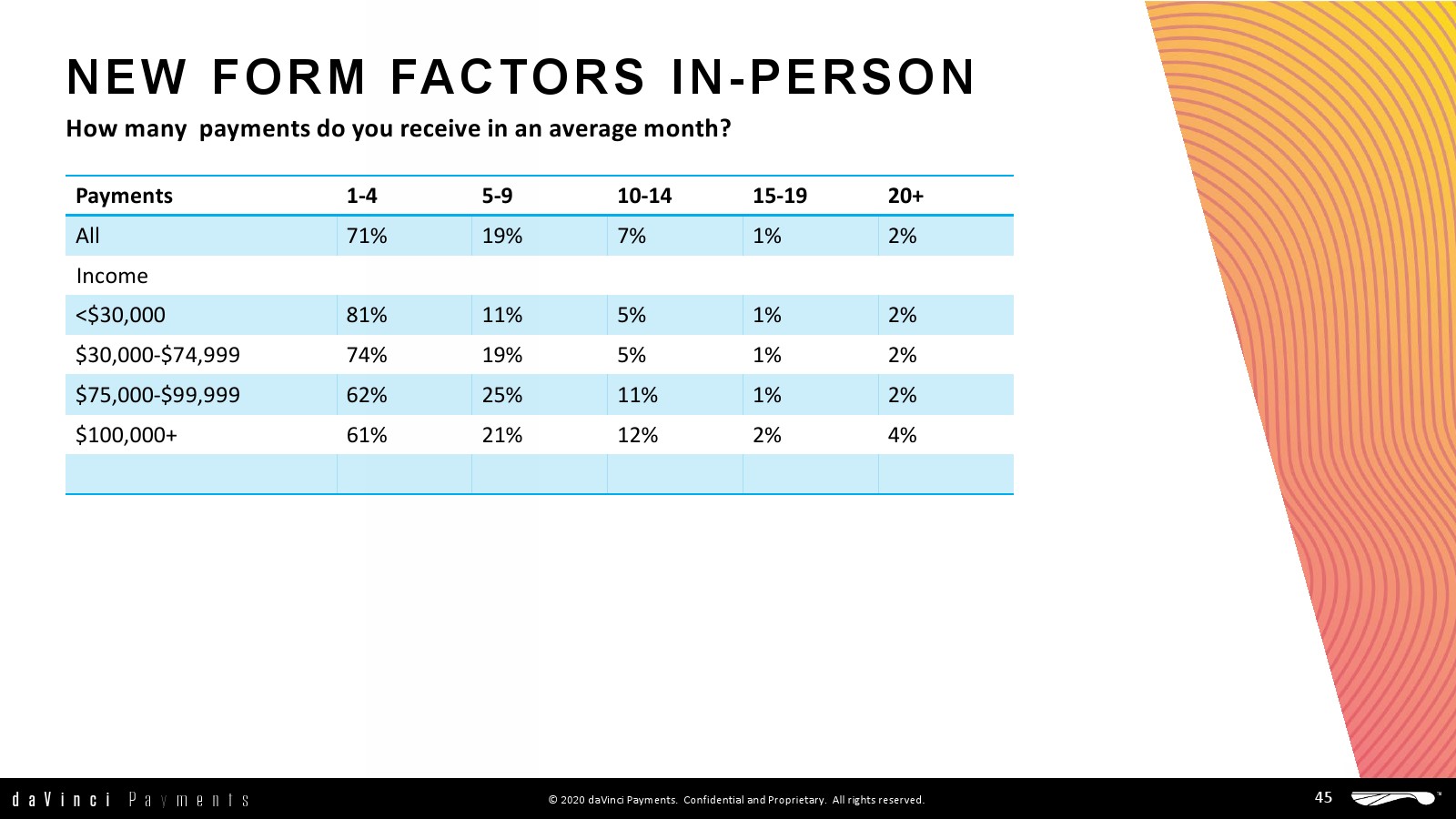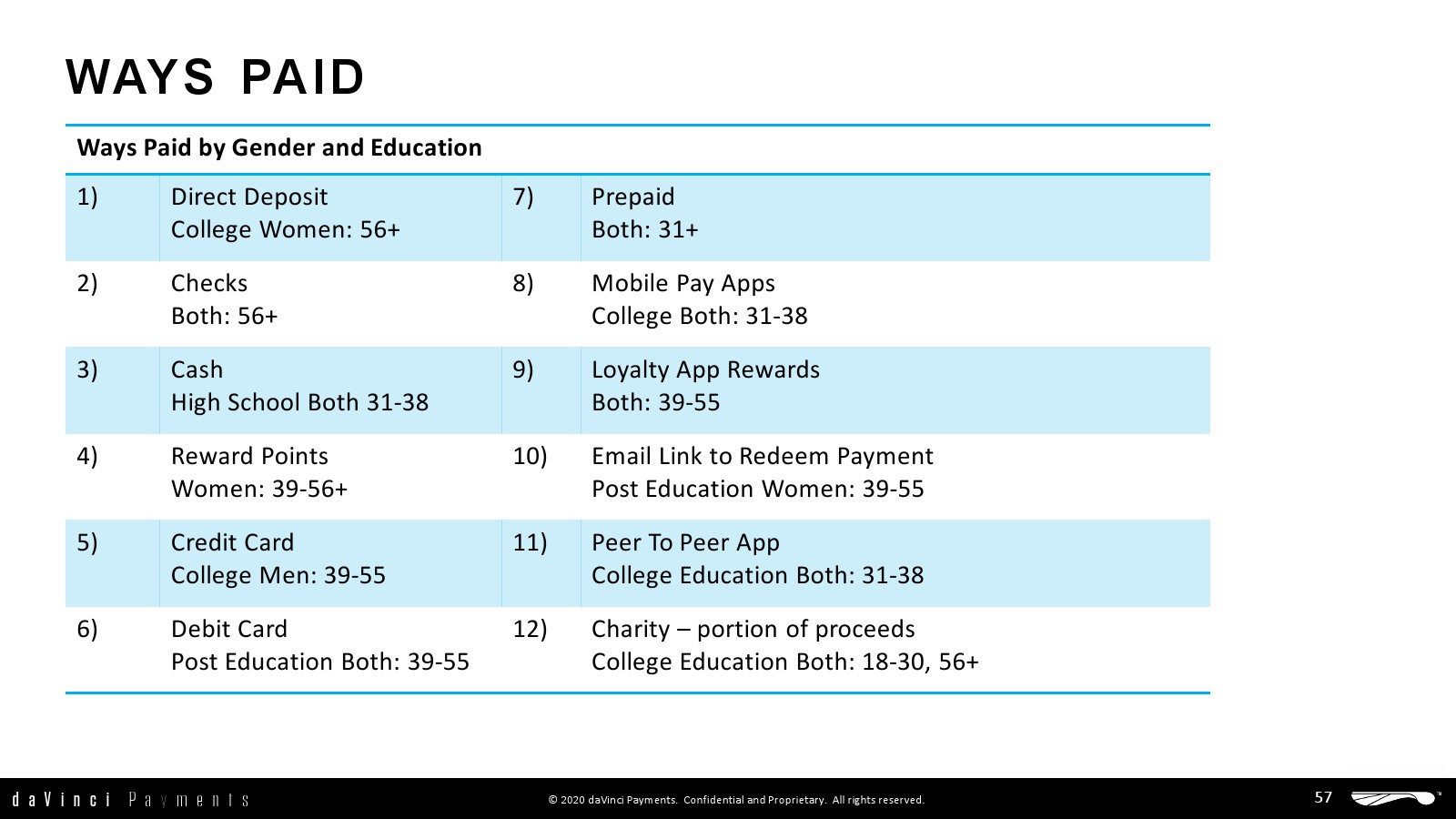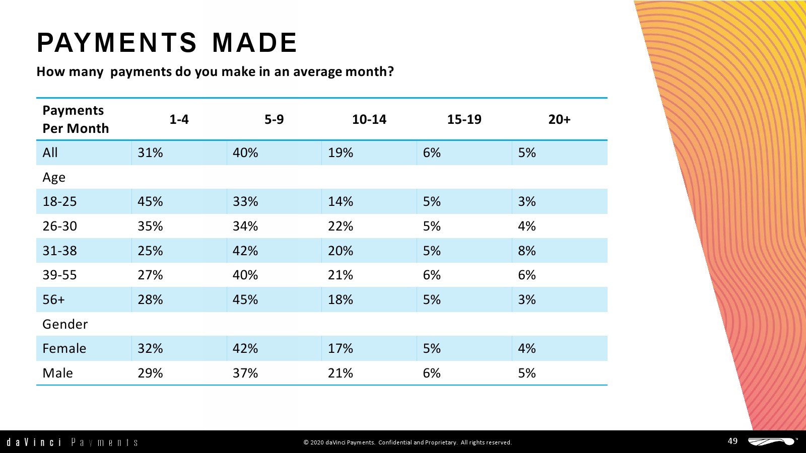 daVinci特别研究了每种支付方式的不同用途,重点关注谁使用了多少支付方式进行多少消费,以更好地了解个人支付方式的使用情况。
