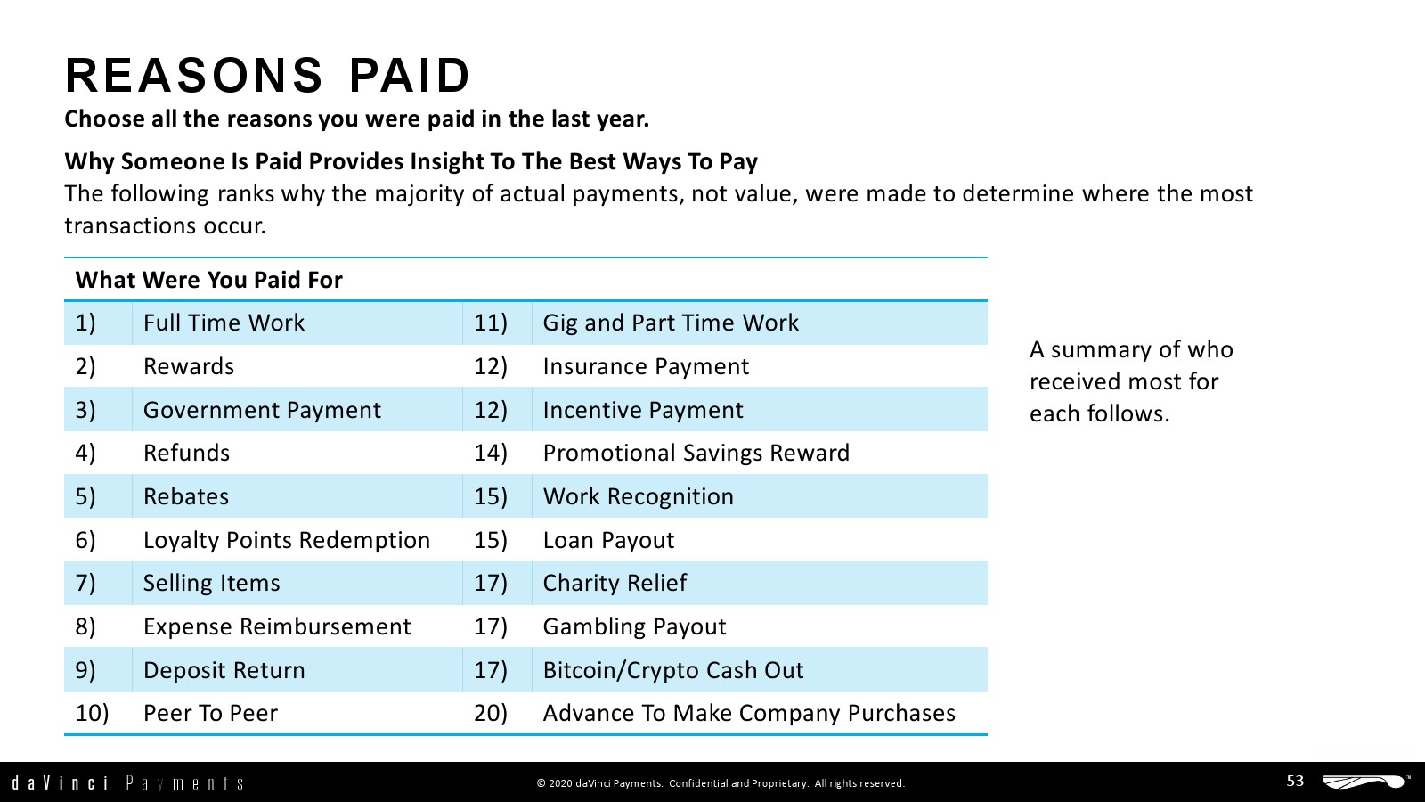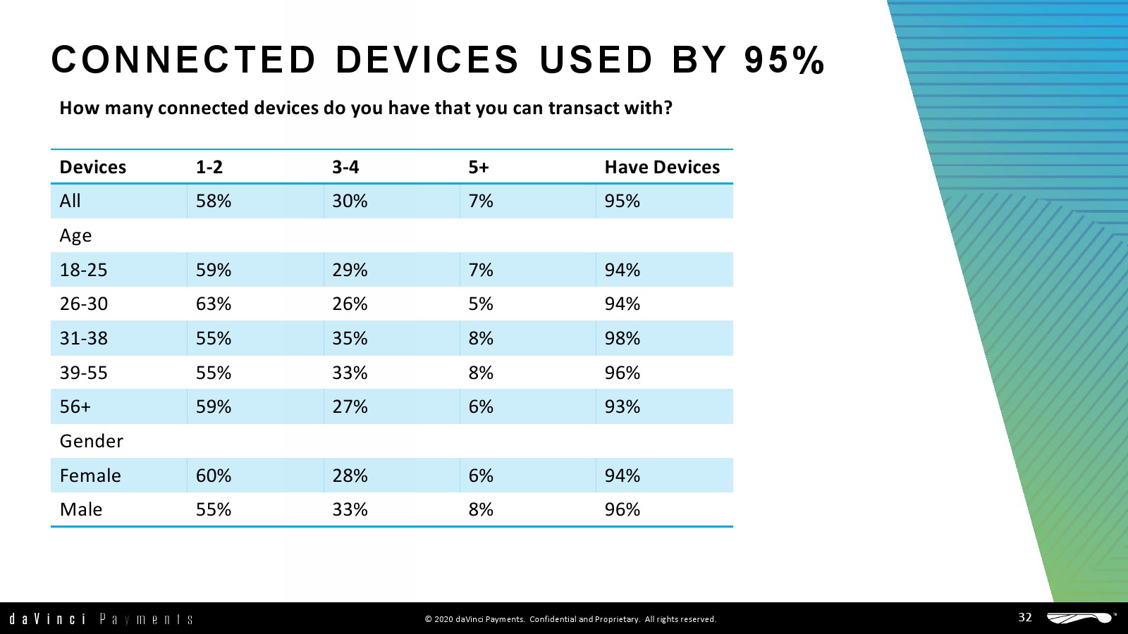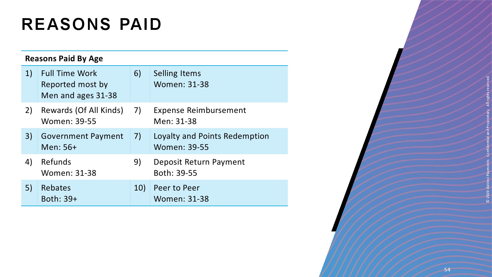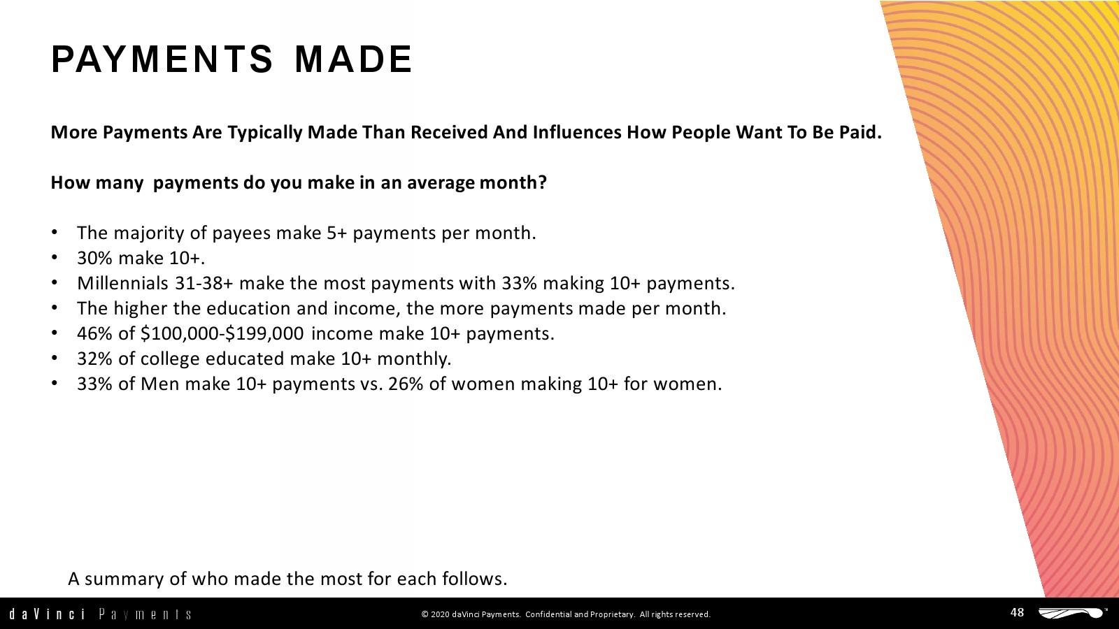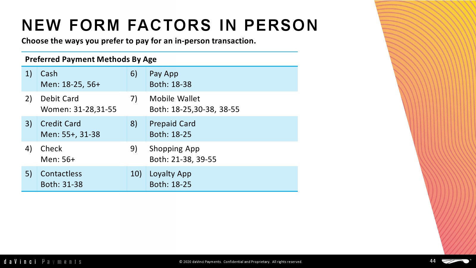 daVinci特别研究了每种支付方式的不同用途,重点关注谁使用了多少支付方式进行多少消费,以更好地了解个人支付方式的使用情况。