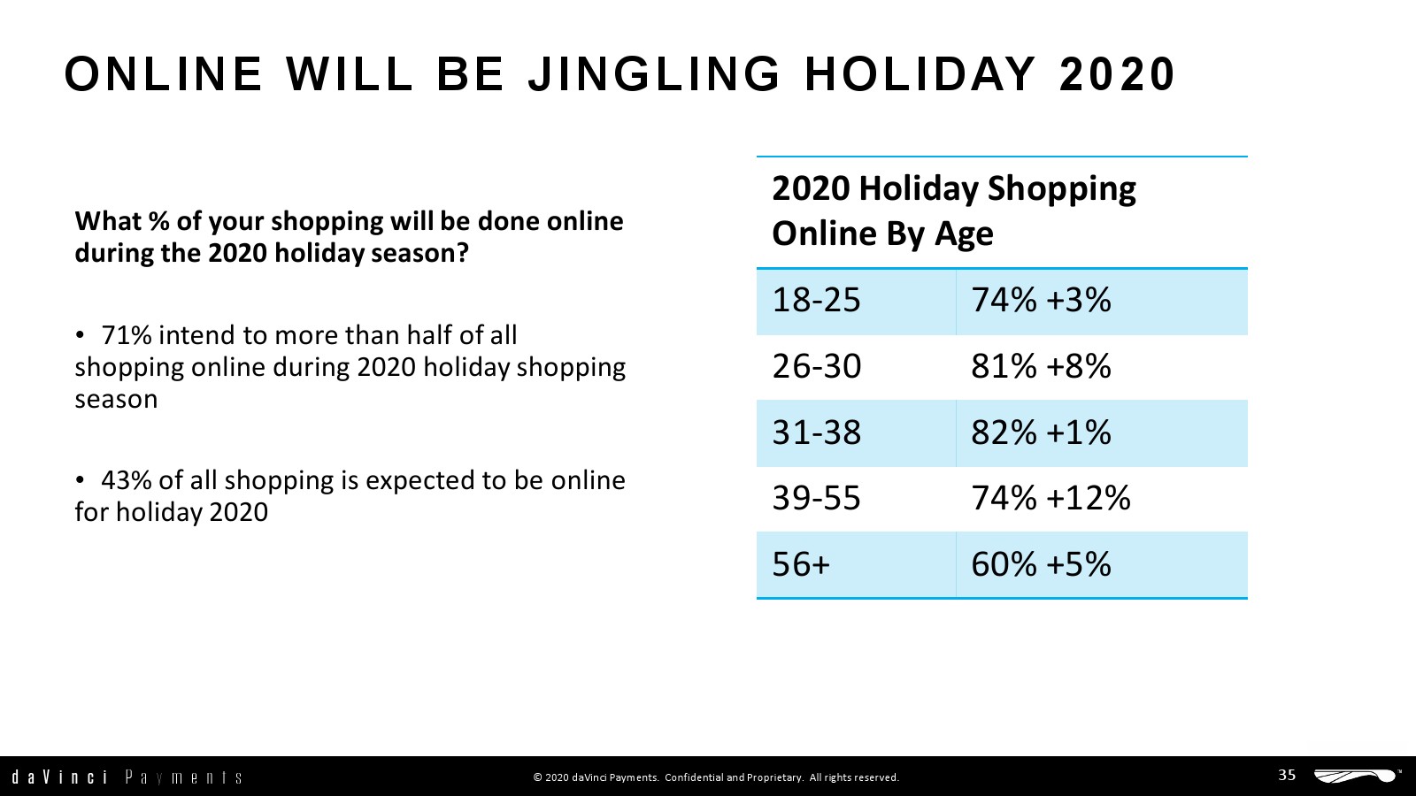 - 43%的购物计划将在2020年假日购物季通过在线购物完成。