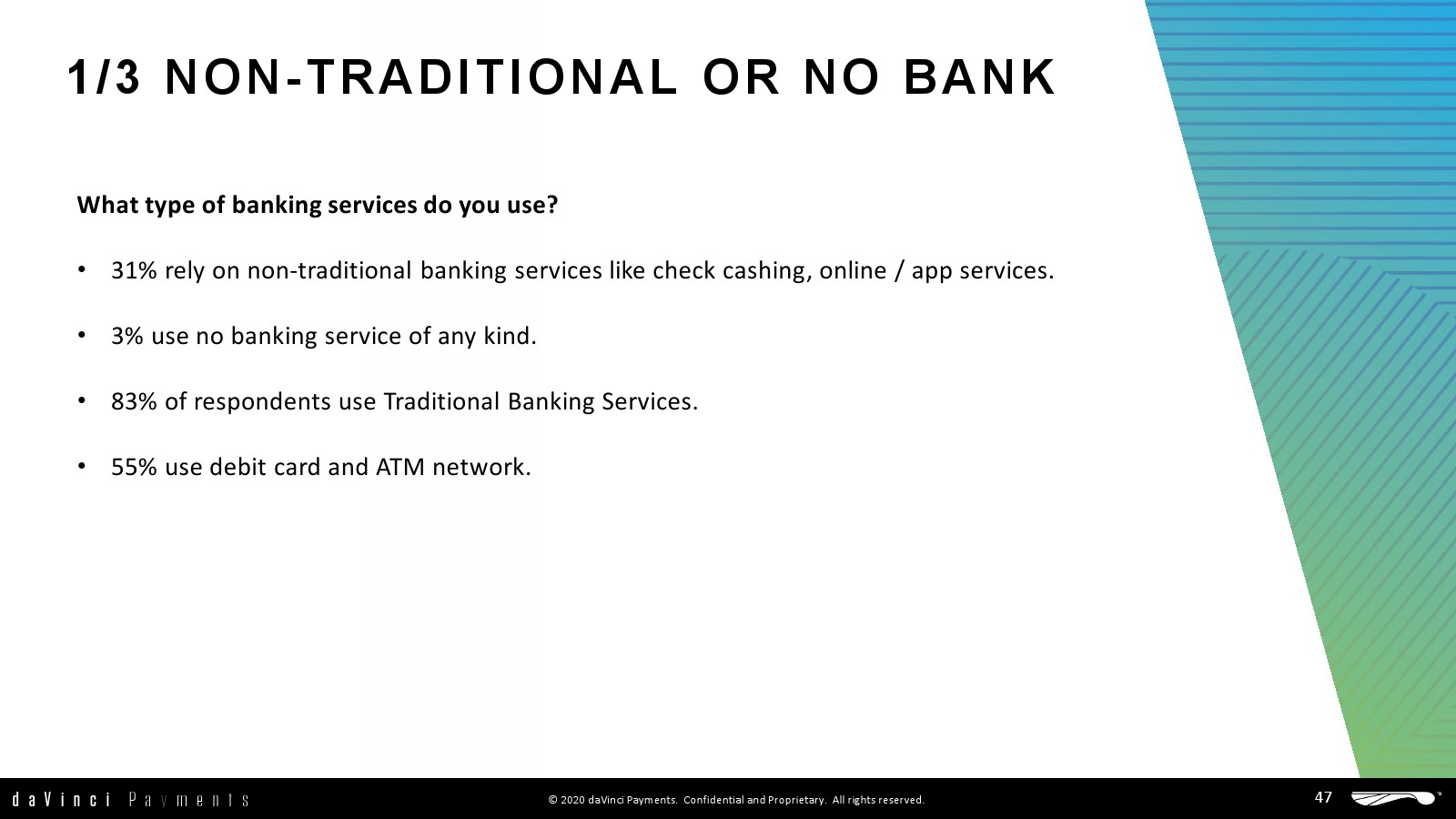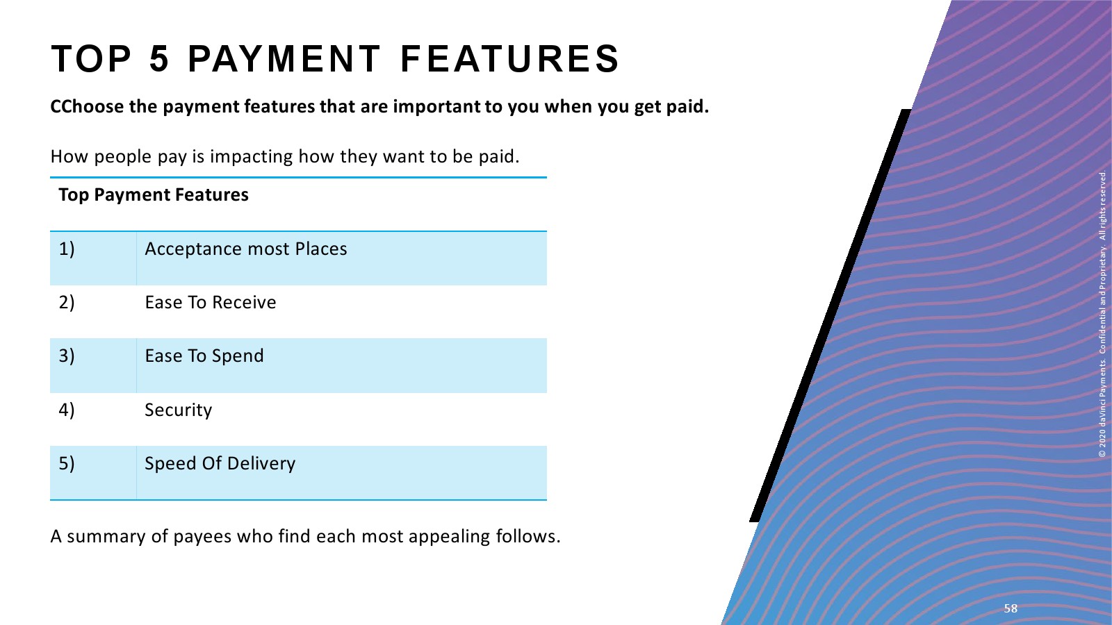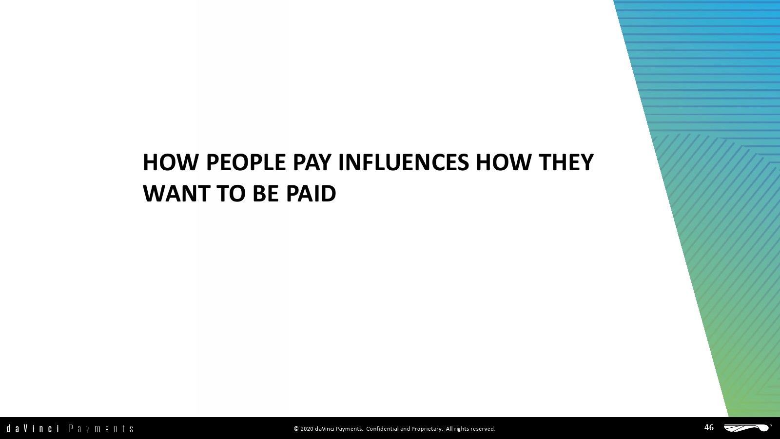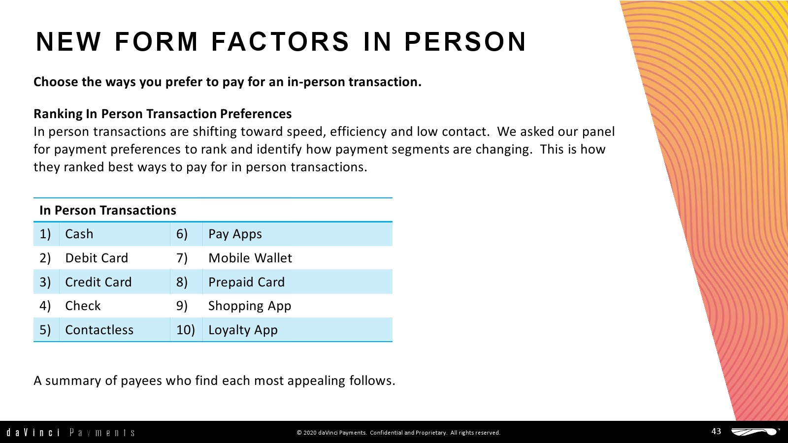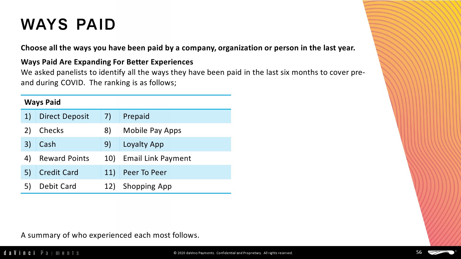 除了这些关键发现外,daVinci还研究了人们在未来一年打算使用的多种支付方式,以及支付特点:收款人的最大价值、原因和他们现在的支付方式,以及他们如何付款和存入银行。