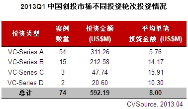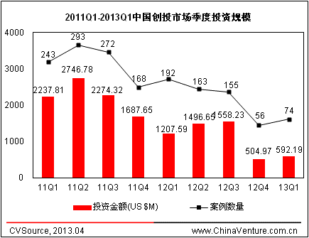 ChinaVenture投中集团旗下金融数据产品CVSource 统计显示,2013年第一季度国内市场共披露创业投资(VC)案例74起,投资金额5.92亿美元,相比上季度分别增长32.1%和17.3%;当相比去年同期(192起案例、投资总额12.08亿美元)则有较大幅度下滑。并且低于2012年季度平均水平。