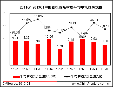 图2 2011Q1-2013Q1年中国创投市场平均单笔投资规模
