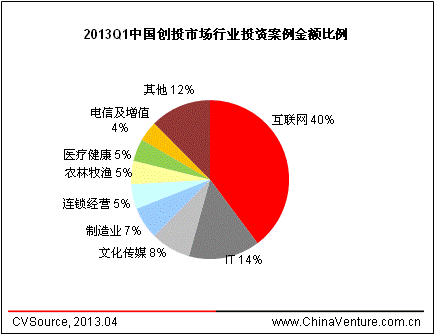 图4 2013Q1中国创投市场行业投资案例金额比例