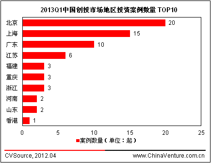 图5 2013Q1中国创投市场地区投资案例数量TOP 10