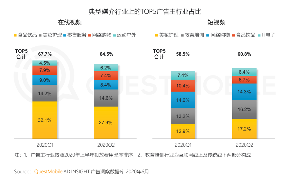 出现这种情况的原因,一方面,虽然食品饮品明显减少,不过美妆、教育行业逆势上扬(2月到5月,教培行业投放费用同比增长均维持在100%以上),另一方面是短视频等媒介形态,提供了形态多样化的广告点位,带来了新的增长。
