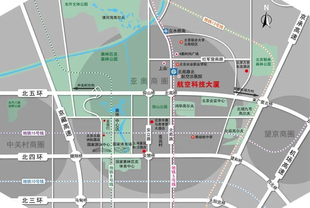航空科技大厦地处亚奥商圈北部,紧邻奥林匹克公园,已成为奥北商务区域的新名片。项目东邻望京商务区,西望中关村商务区,企业聚集,人才济济。
